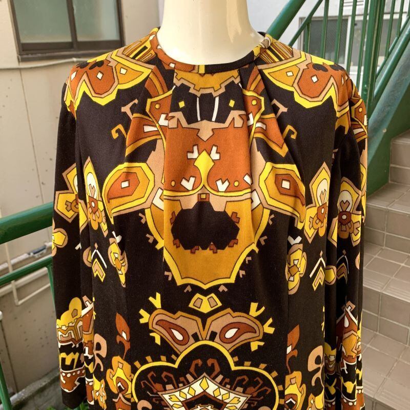 やや厚みのあるブラックベースのポリ生地にイエロー、ベージュ、ブラウンのオリエンタルなフラワー柄がとっても可愛い1着です。