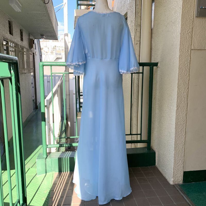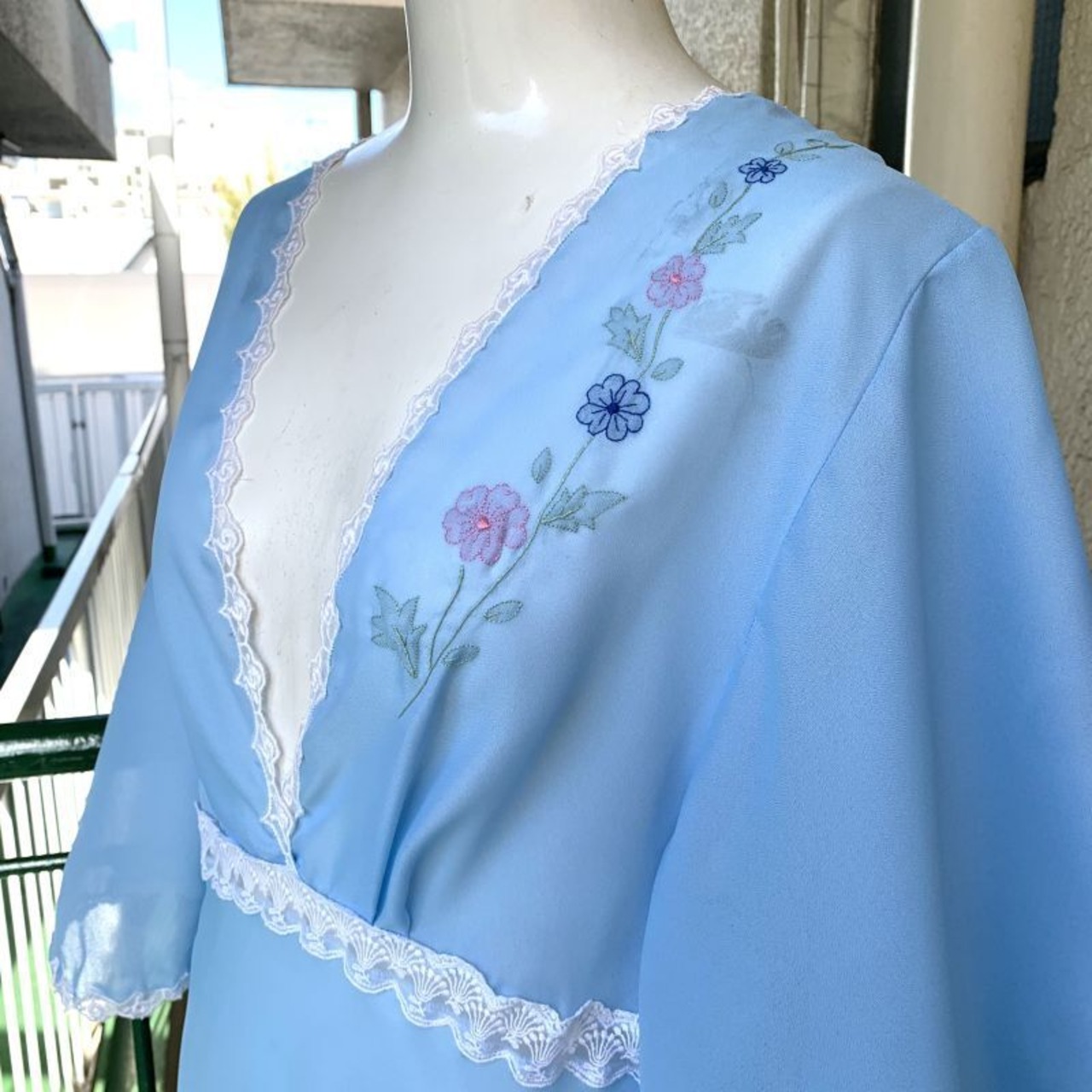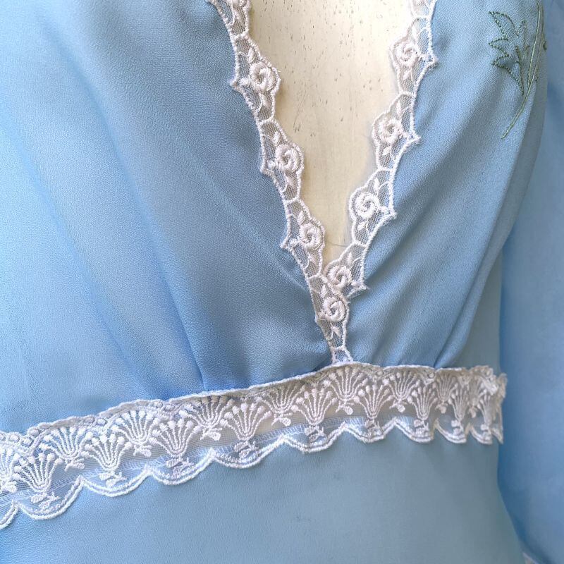 ライトブルーのシアー生地にフラワー刺繍レースのラインや胸元のピンク、ネイビーのフラワー刺繍がとっても可愛い1着です。