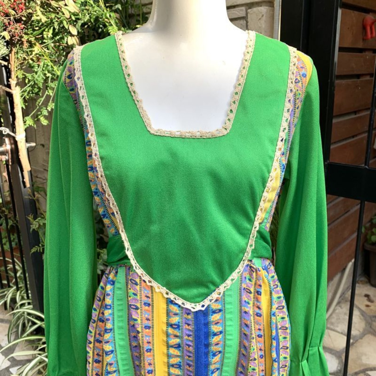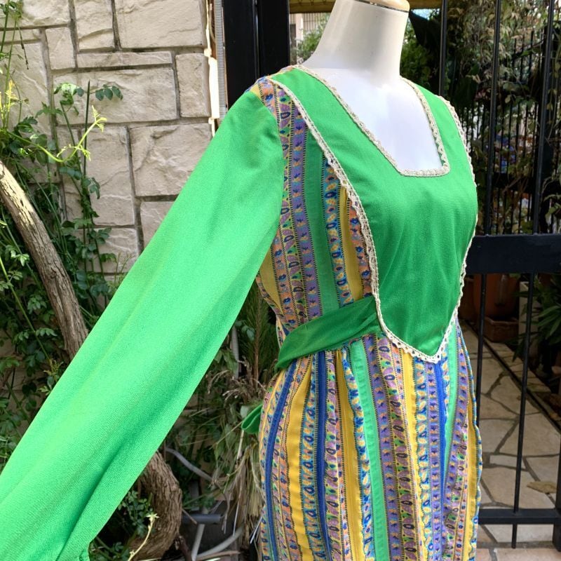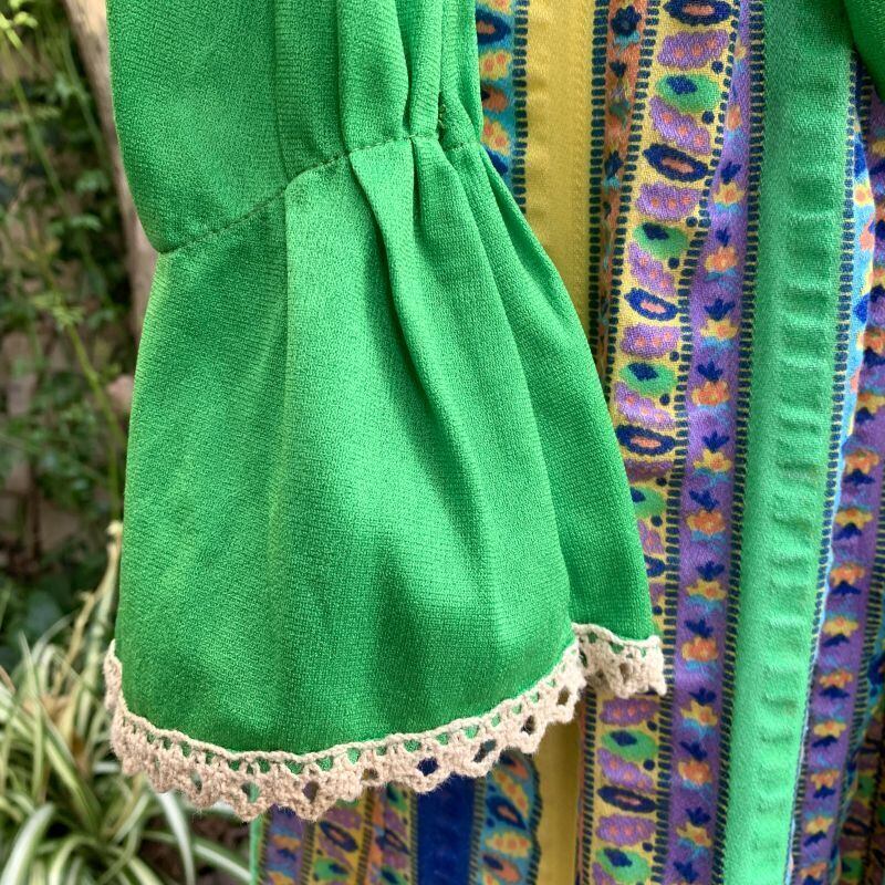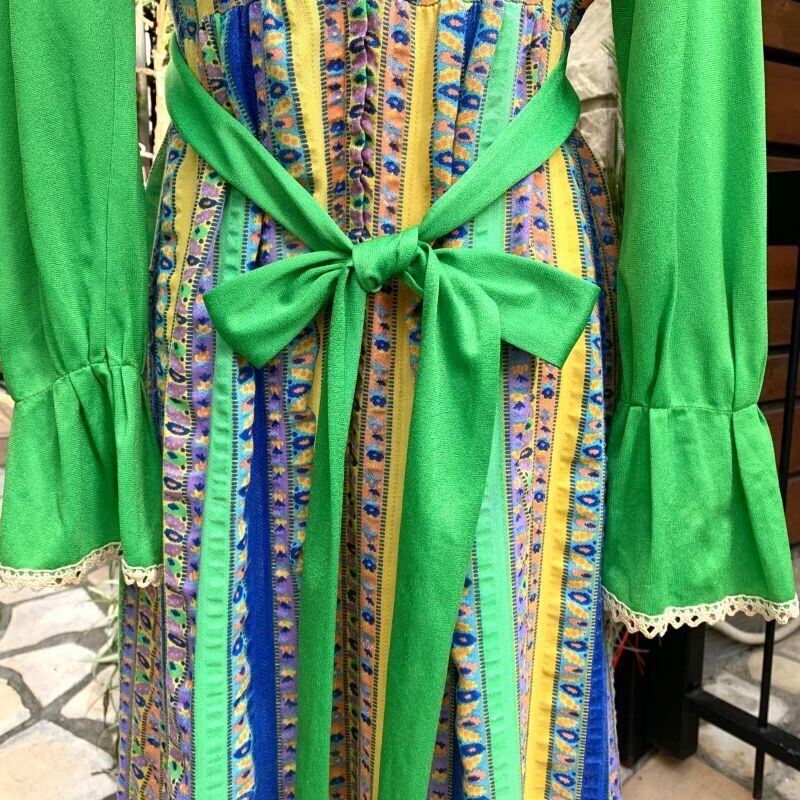 70年代 光沢感のあるヴィンテージならではなグリーンのポリ素材とフラワー柄のラインがとっても可愛いヴィンテージドレスです。