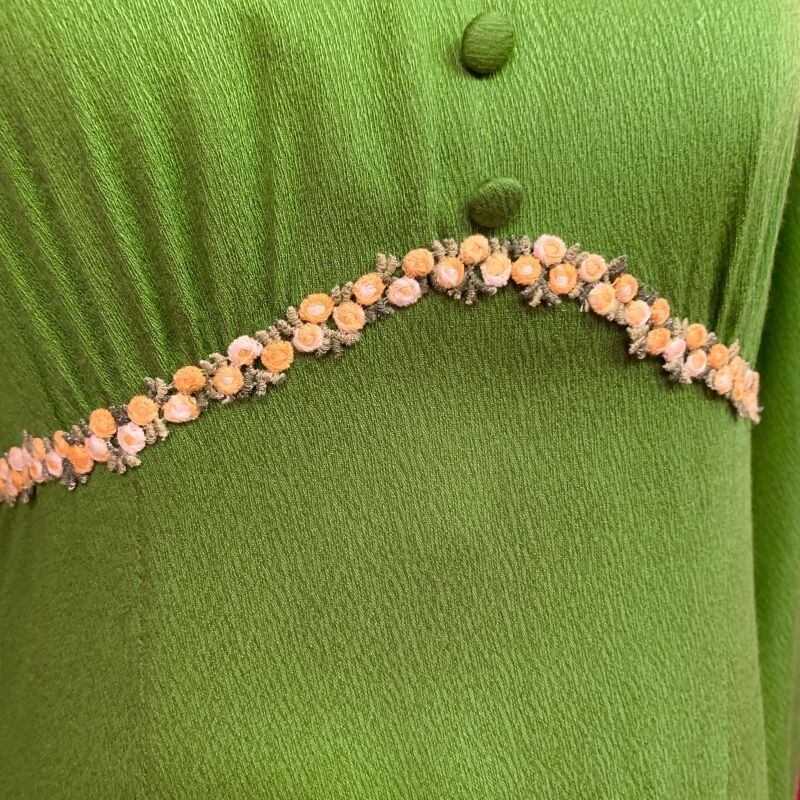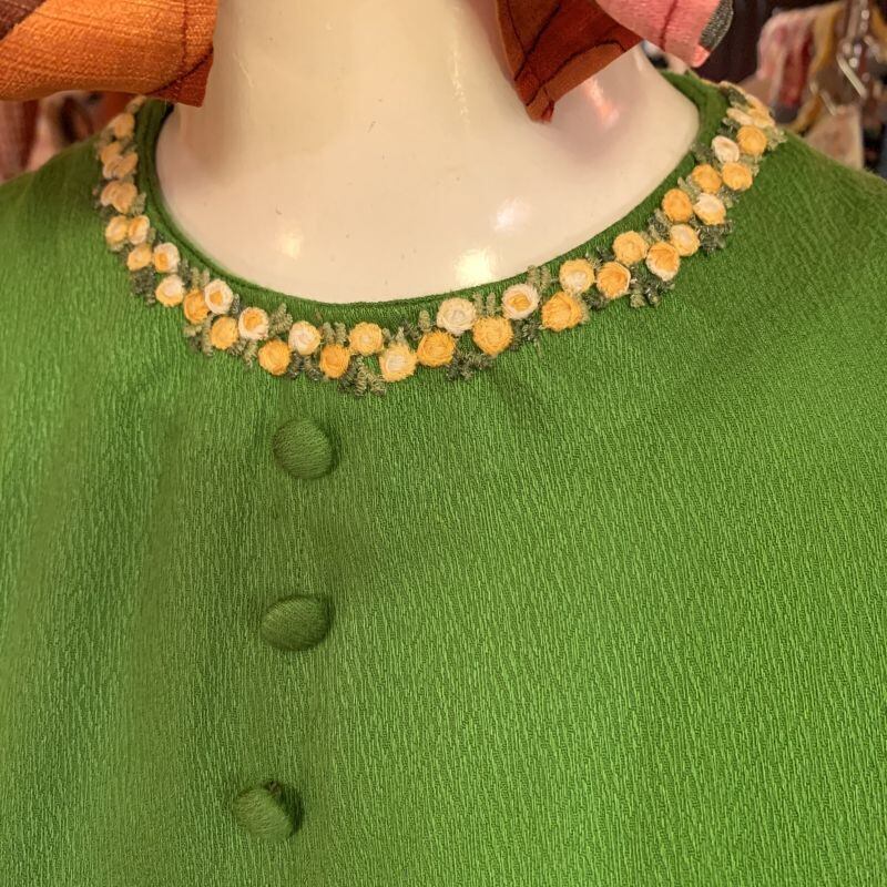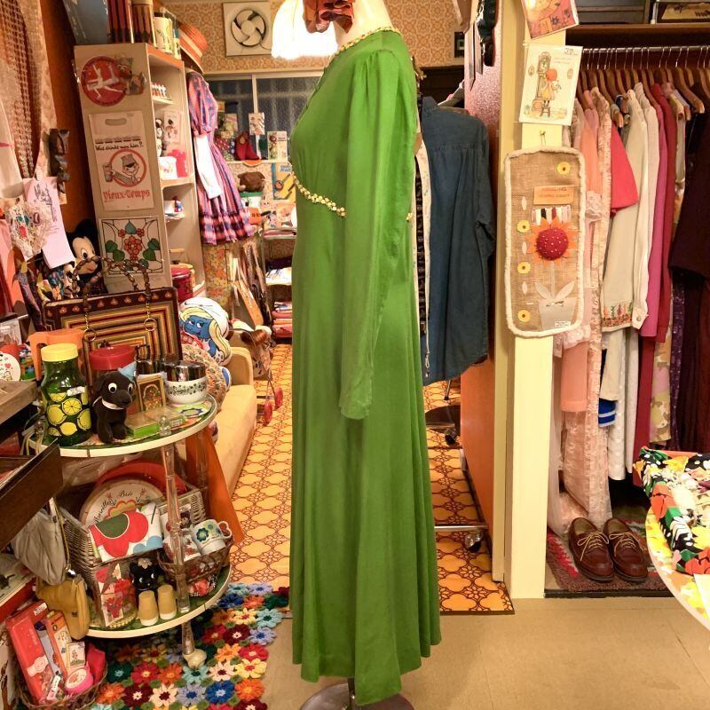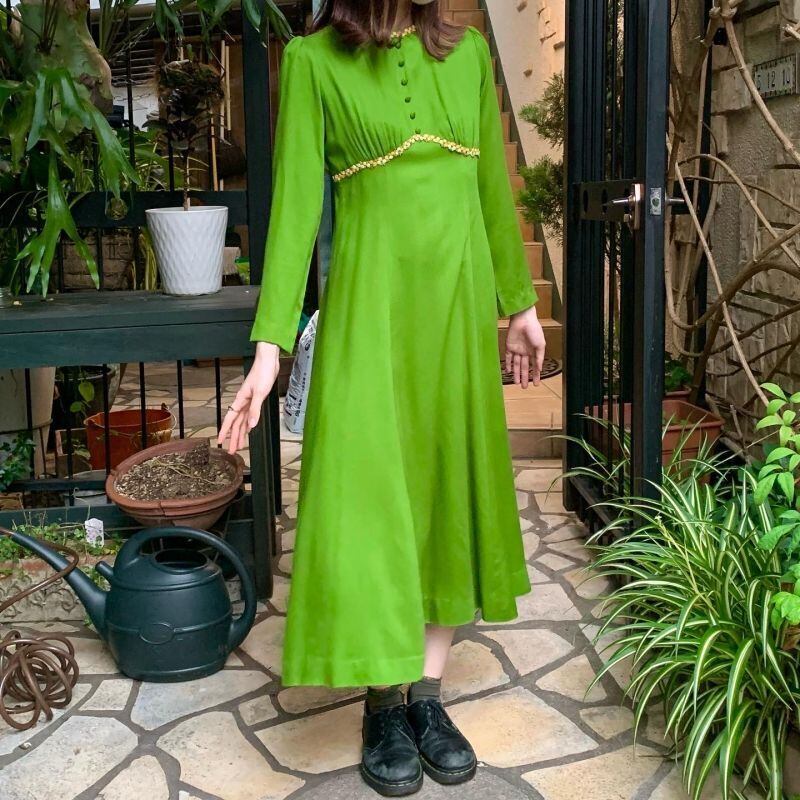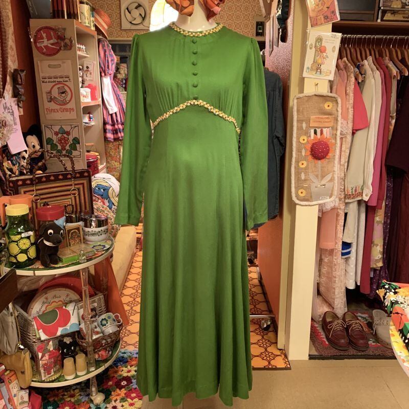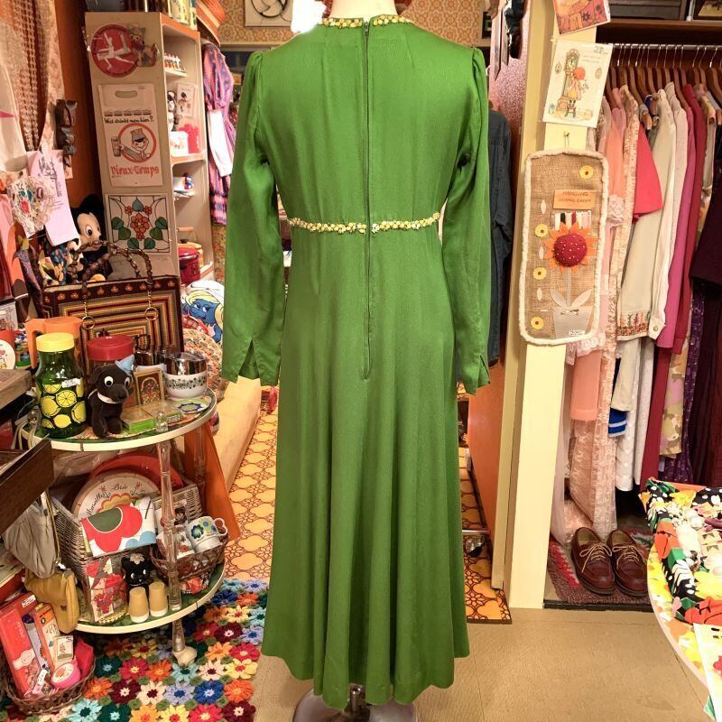 抹茶のようなレトロなグリーンカラーにイエロー、ホワイトのフラワー刺繍ラインがとっても可愛いロング丈のワンピースです。