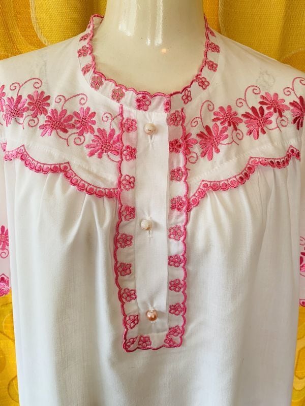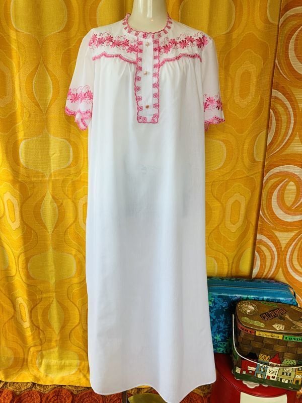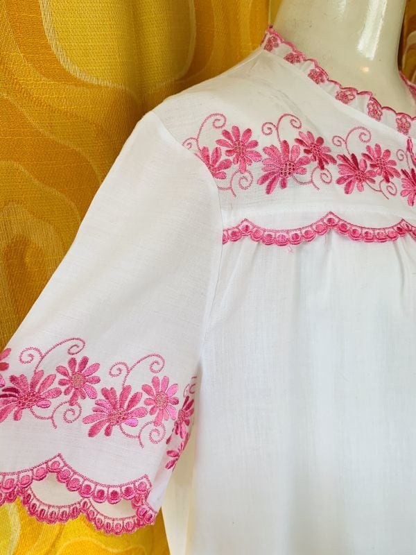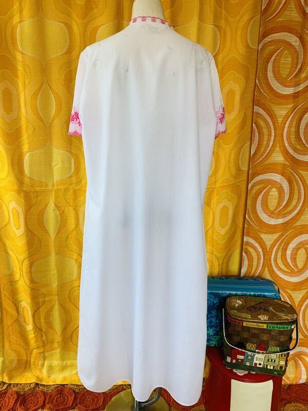 70'S ヨーロッパ PK FLOWER刺繍 ワンピースです。柔らかな風合いのホワイト地にピンクのFLOWER刺繍やステッチラインがとっても可愛いです。襟元や袖周り、中央のスカラップラインも可愛いですね。バギーなどと合わせて着用頂いても可愛いかと思います。パール調のボタンにお色の剥がれが見られますが気にならない程度かと思います。他は気になるような大きなダメージはありません。