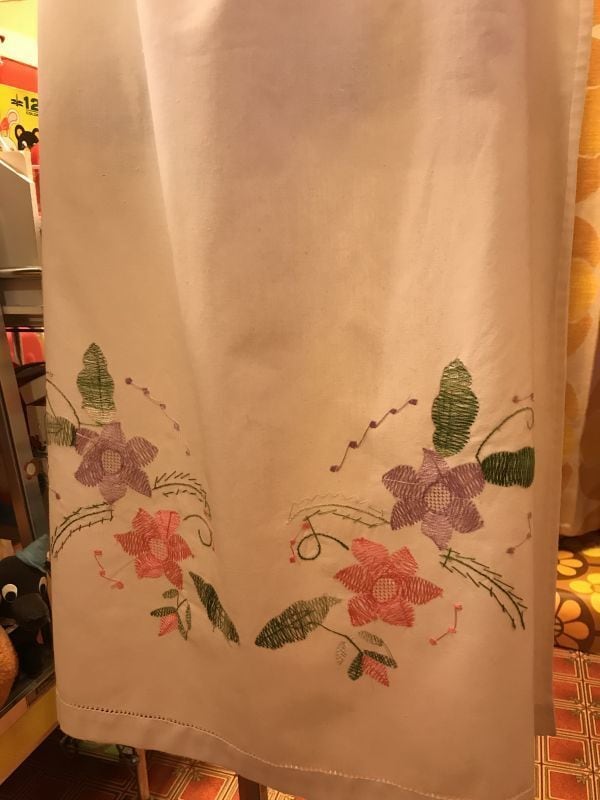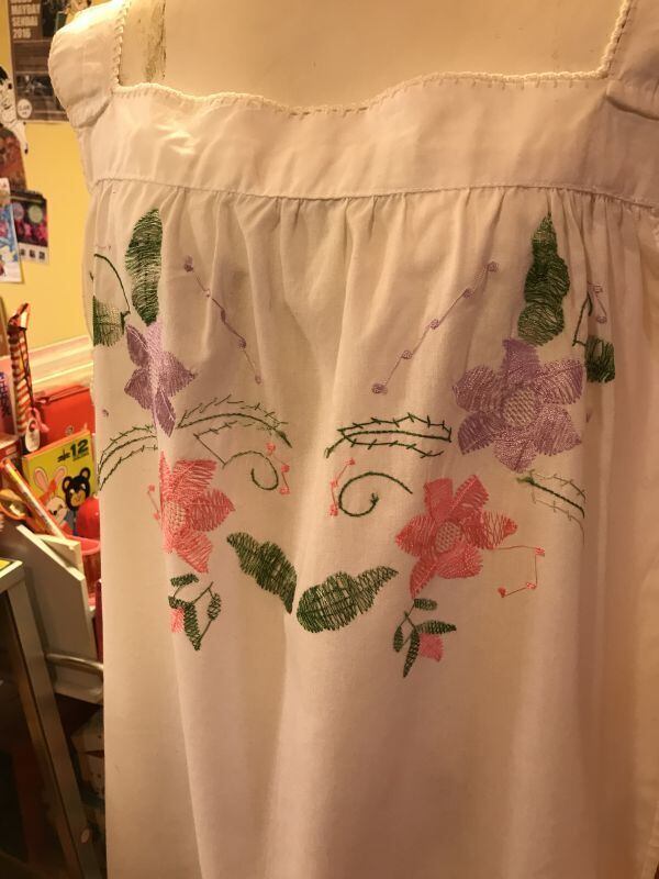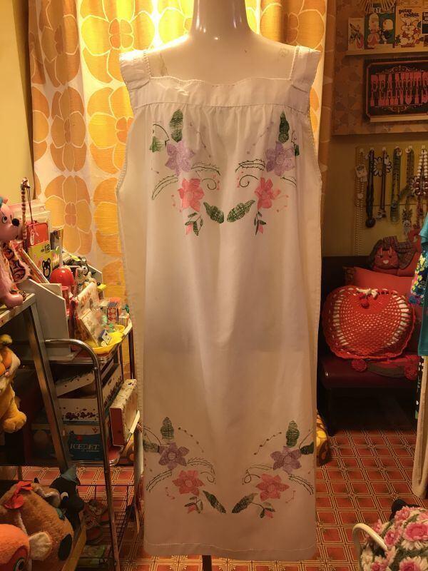70'S USA コットンSweetFlower刺繍キャミワンピースです。ホワイトのコットン生地にピンクやパープルのSweetなFlower刺繍がとっても可愛いです。胸元やショルダーのステッチラインンも可愛いです。さらりと着用できるシンプルなお仕立ても素敵ですね。刺繍に糸のゆるみのような経年感、薄っすらしたシミ、若干の毛羽立ちが見られます。他は気になるような大きなダメージはありません。
