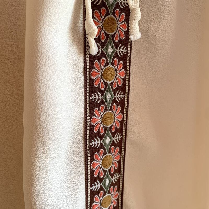 クリームカラーのボディーにフロント中央、袖口のフラワー刺繍リボンのラインがとっても可愛いです。
