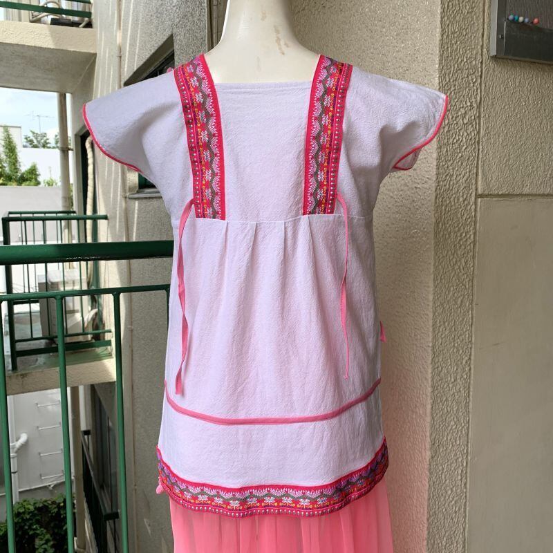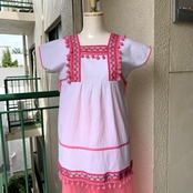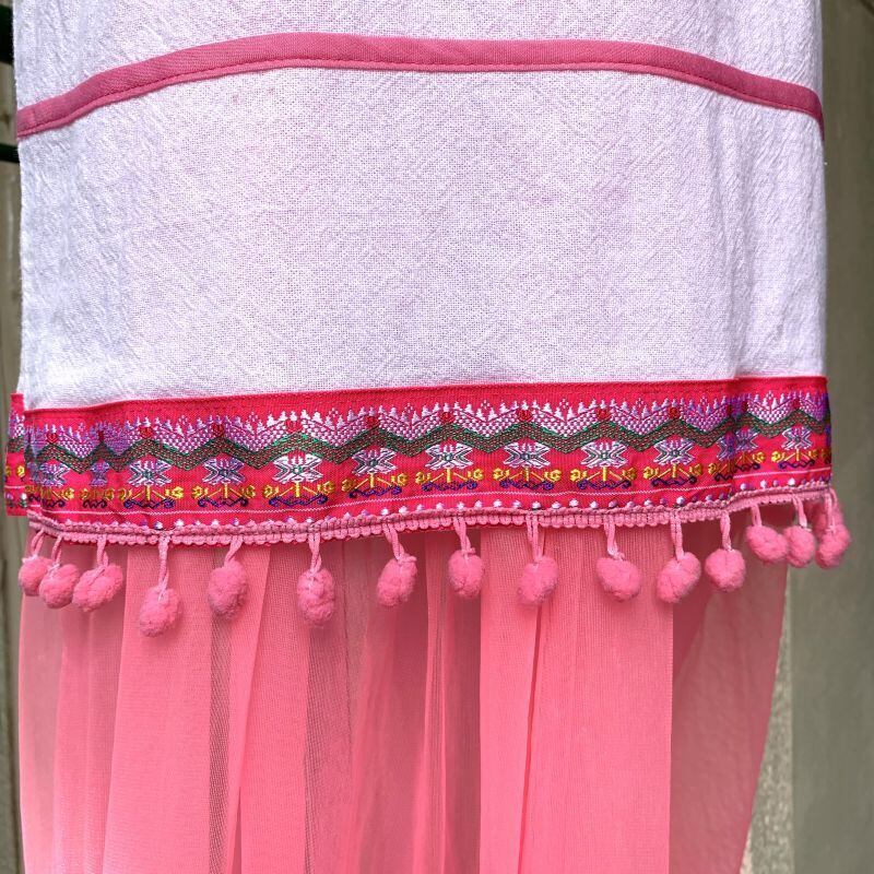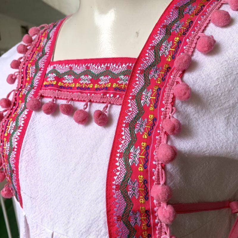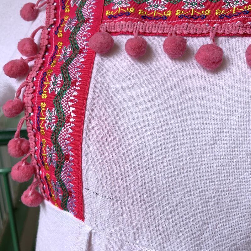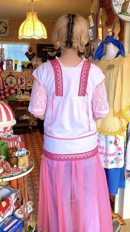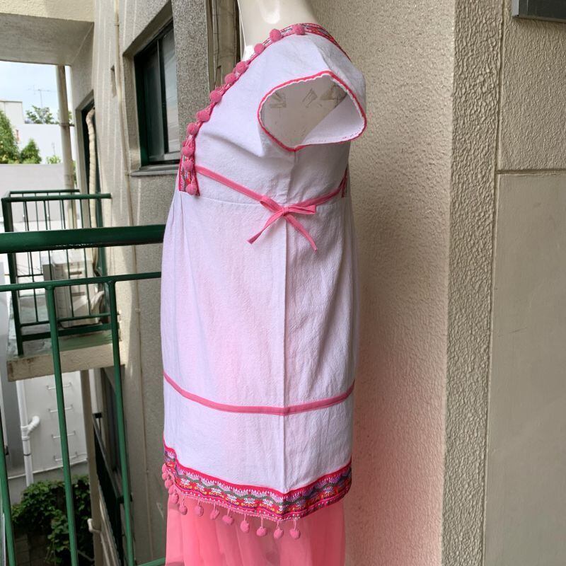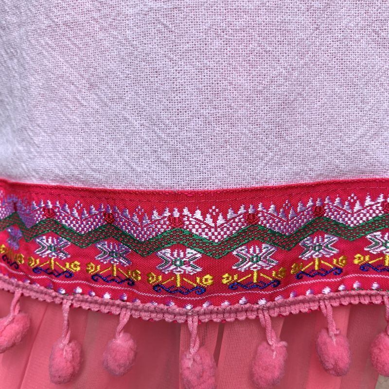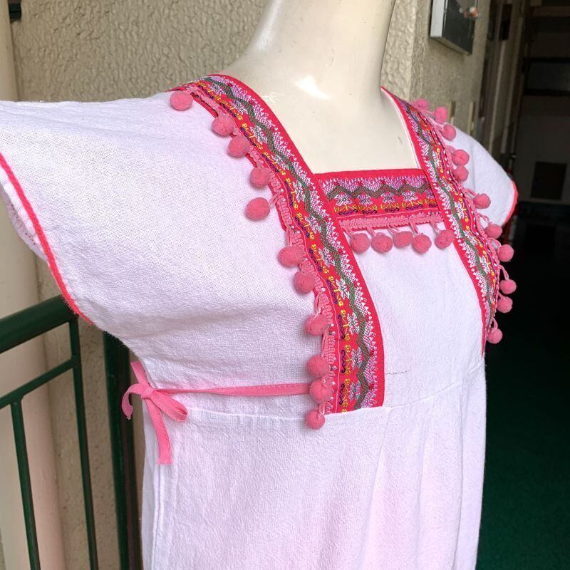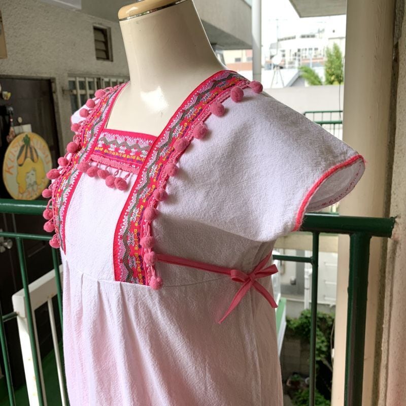 ヴィンテージならではな風合いのあるコットン生地にマゼンダピンクベースにフラワー刺繍やなみなみラインの刺繍のリボンライン、ピンクのポンポンの装飾やパイピングのラインなど華やかで凝ったデザインがとっても可愛い1着です。