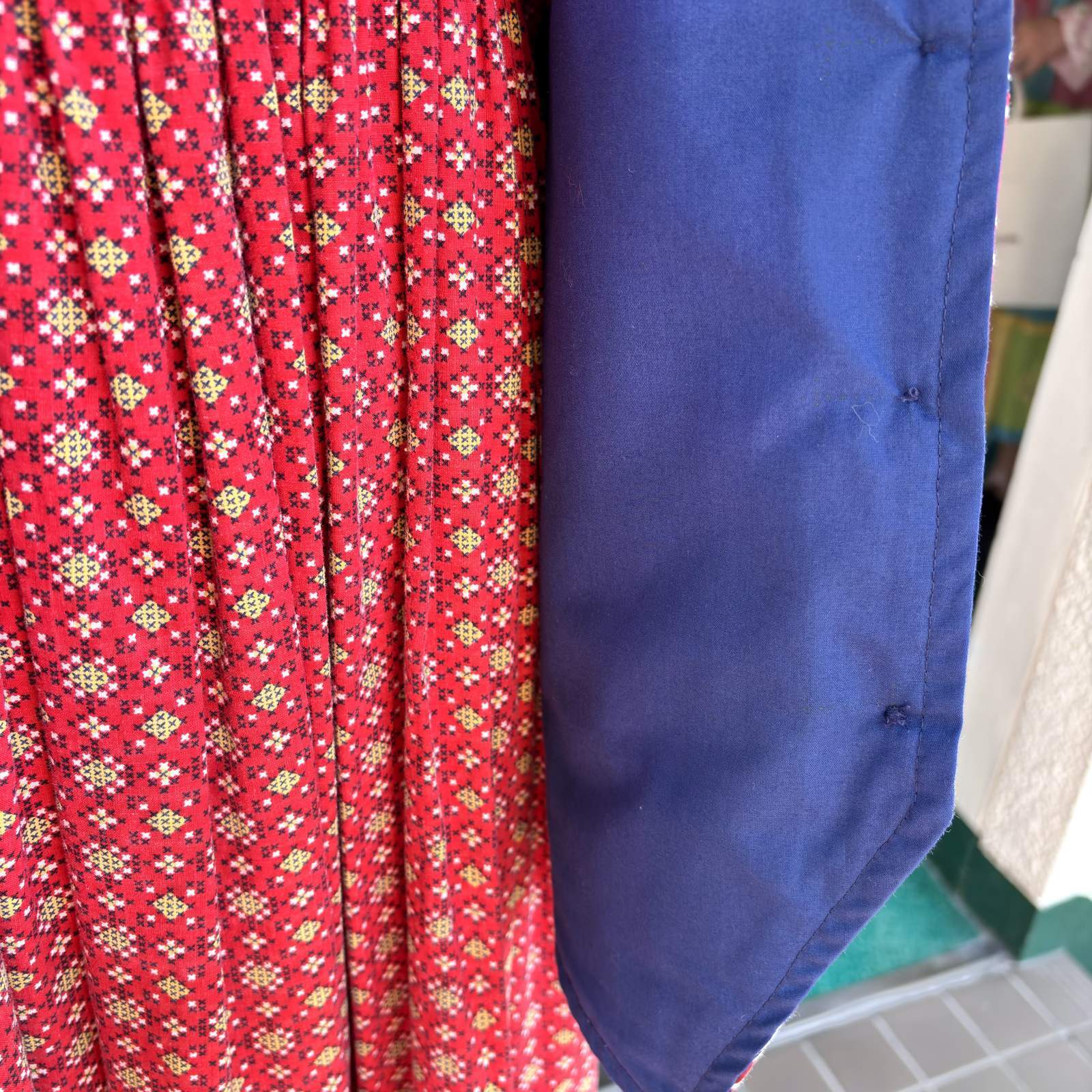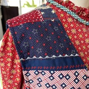 パッチワークに施されたレッド、ネイビー、ホワイトのリーフやフラワー、クルクルやなみなみ模様の刺繍ラインも可愛いポイントです。