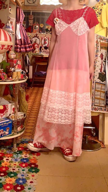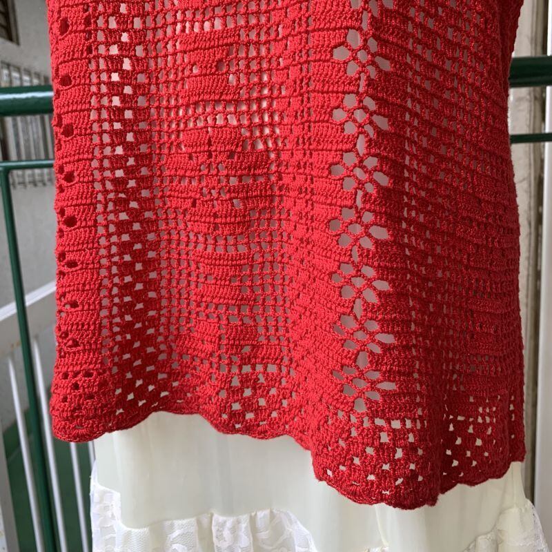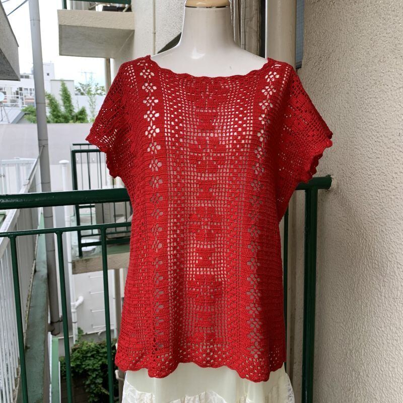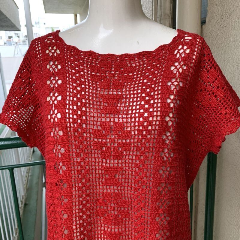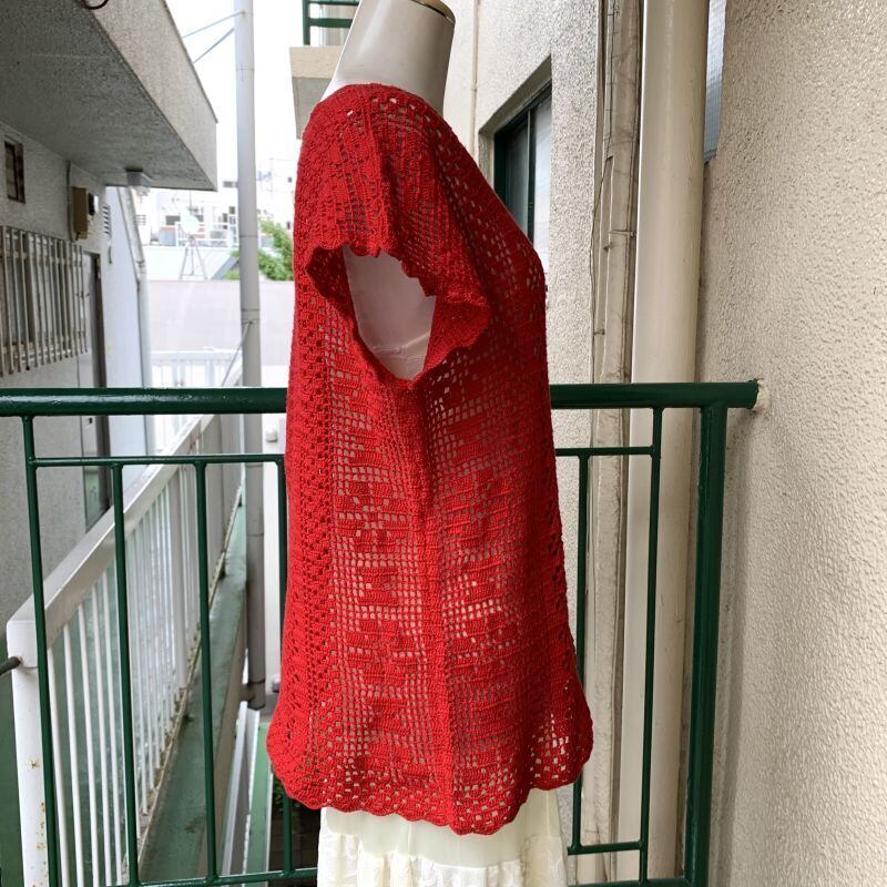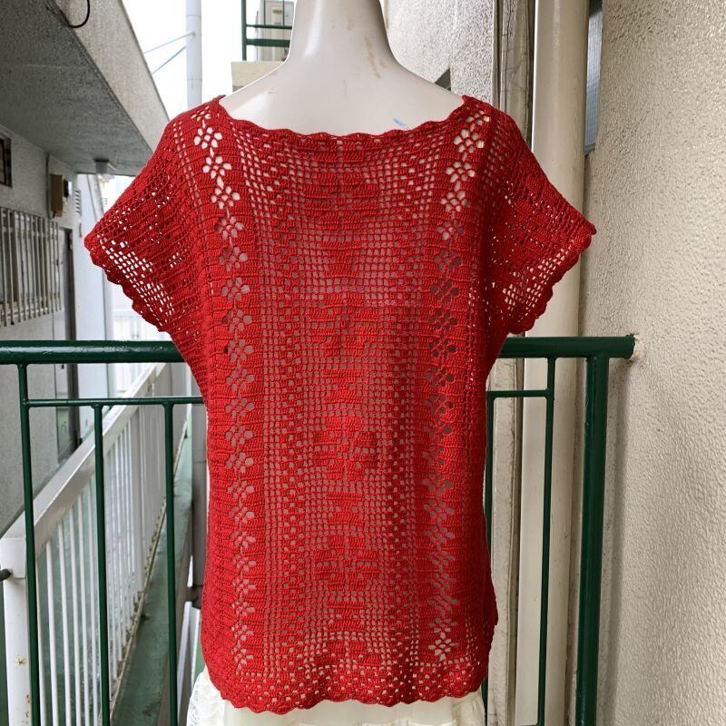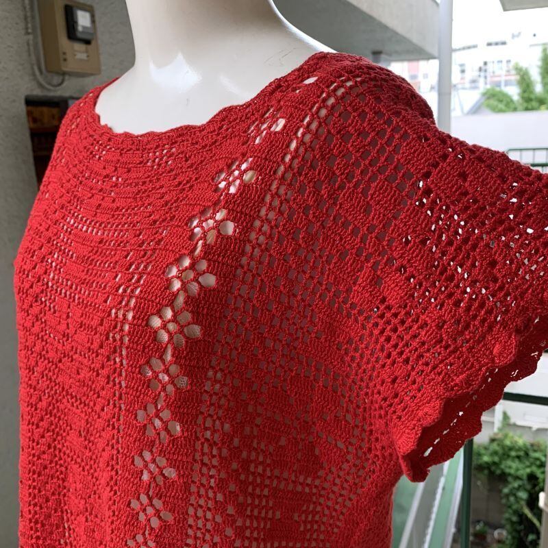 レッドカラーのクロシェ編みがとっても可愛い1着です。