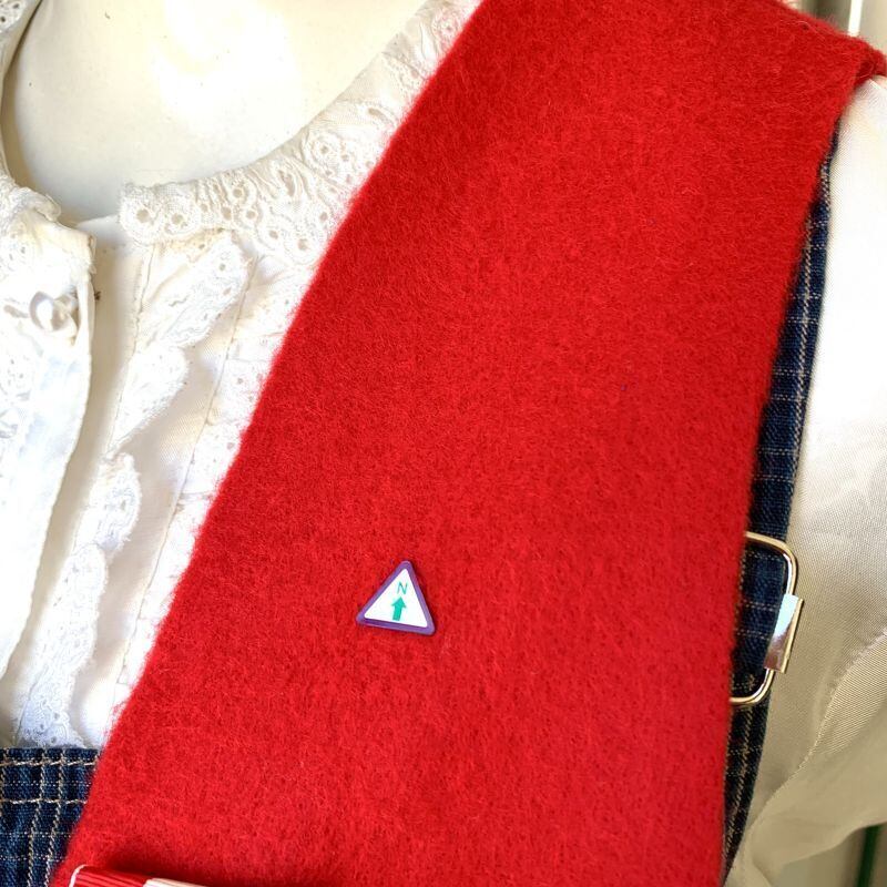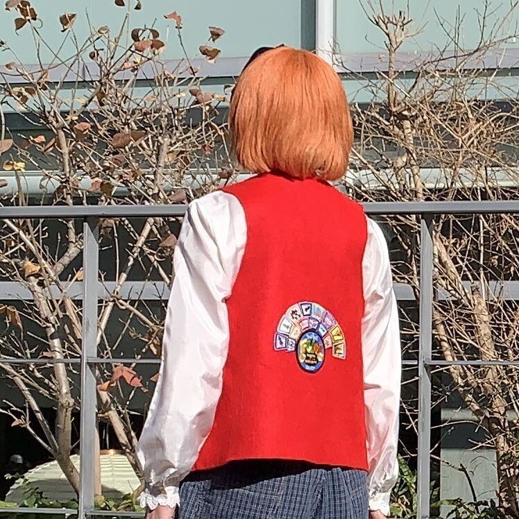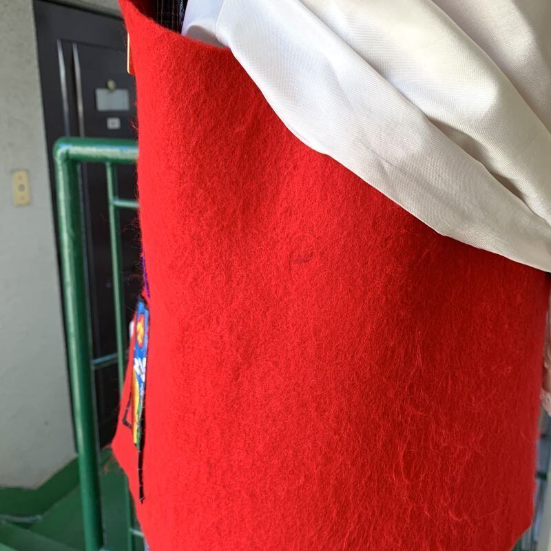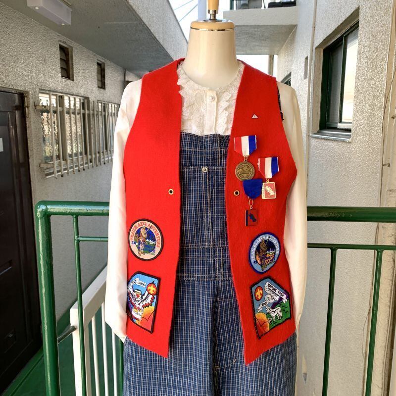 レッドカラーのフェルト地にボーイスカウトならではなワッペンやチャームのカスタムがとっても可愛い1着です。