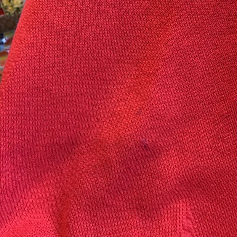 フロント中央にうっすらとしたシミ、裾より右上にボンド跡のようなシミ、生地に経年による若干の毛羽立ちが見られます。