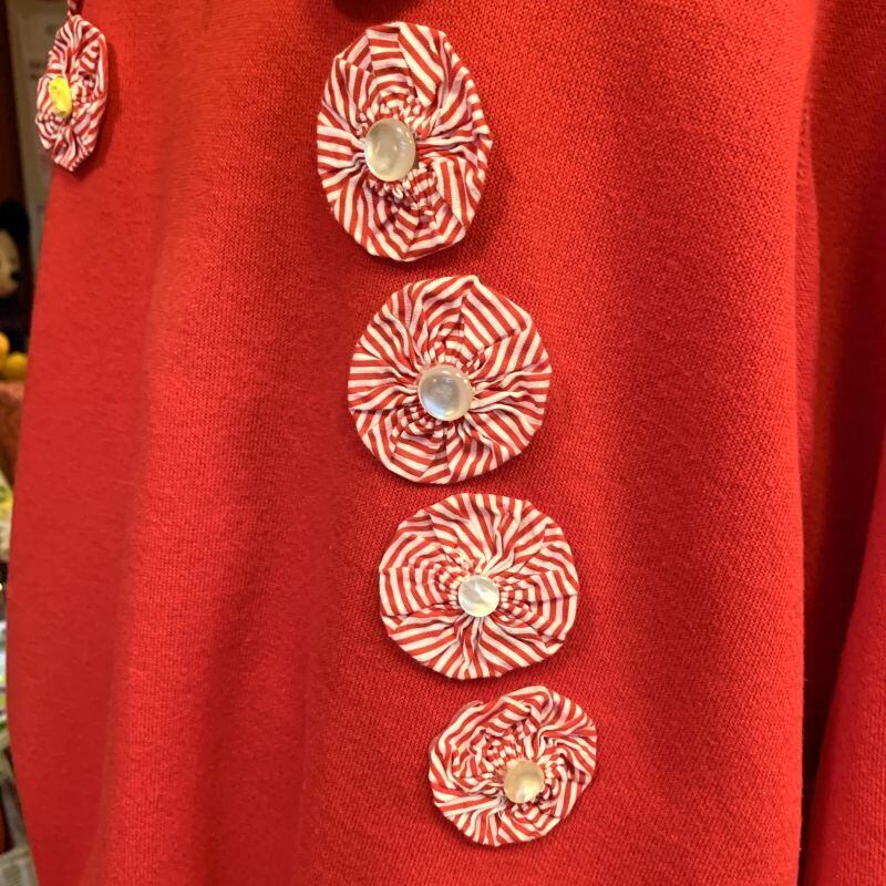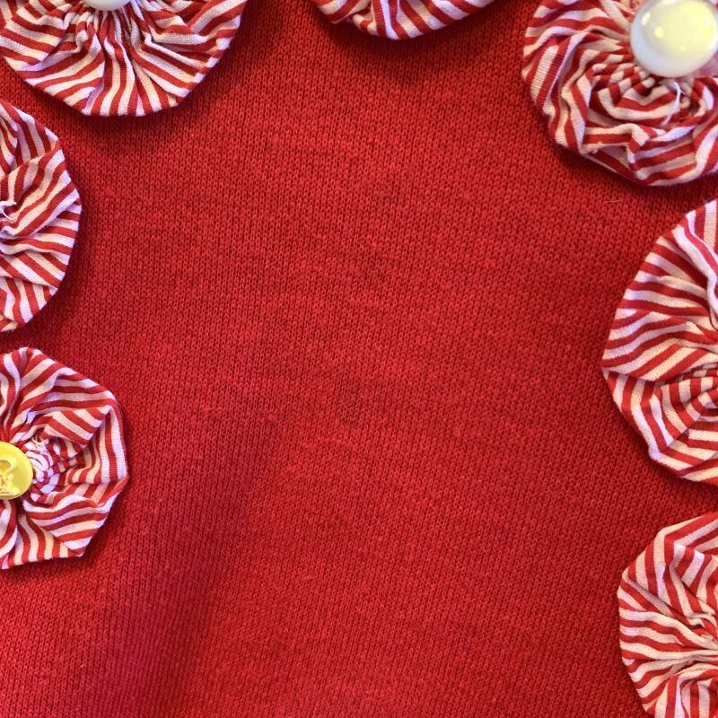 レッドカラーのボディーにキャンディーバーのように並んだストライプ柄のヨーヨーキルトのデザインがとっても可愛いです。