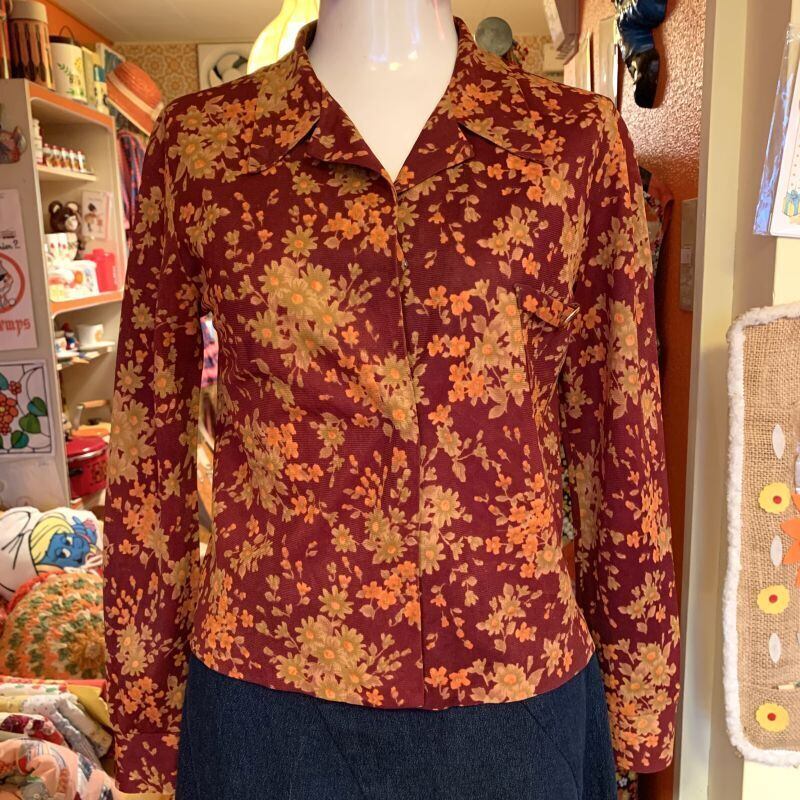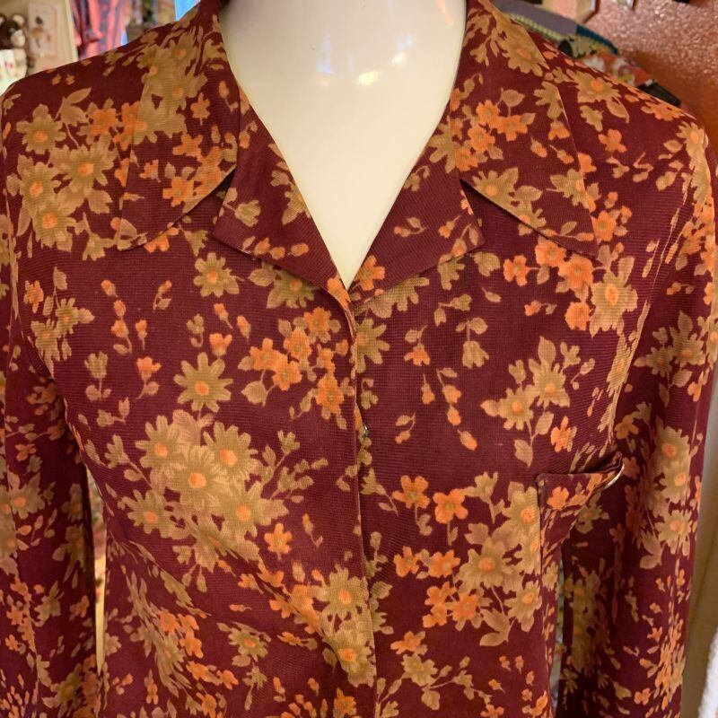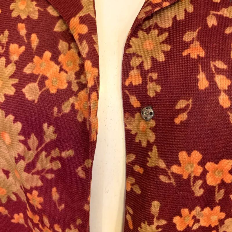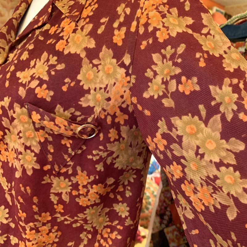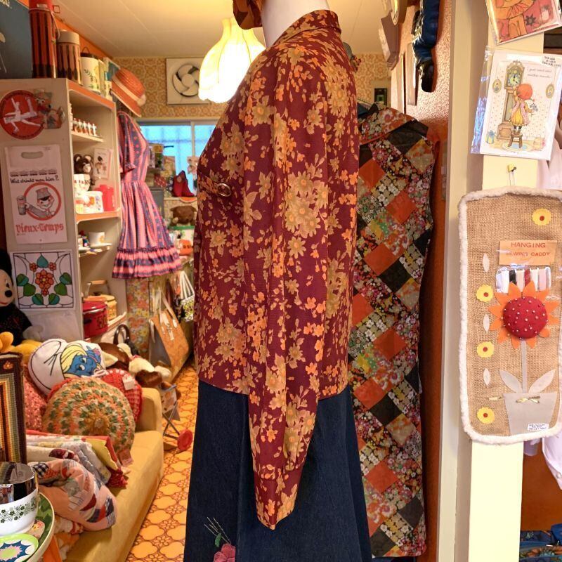 ボルドーとブラウンの中間のようなカラーにオレンジ、グリーンのレトロなフラワー模様が可愛いです。