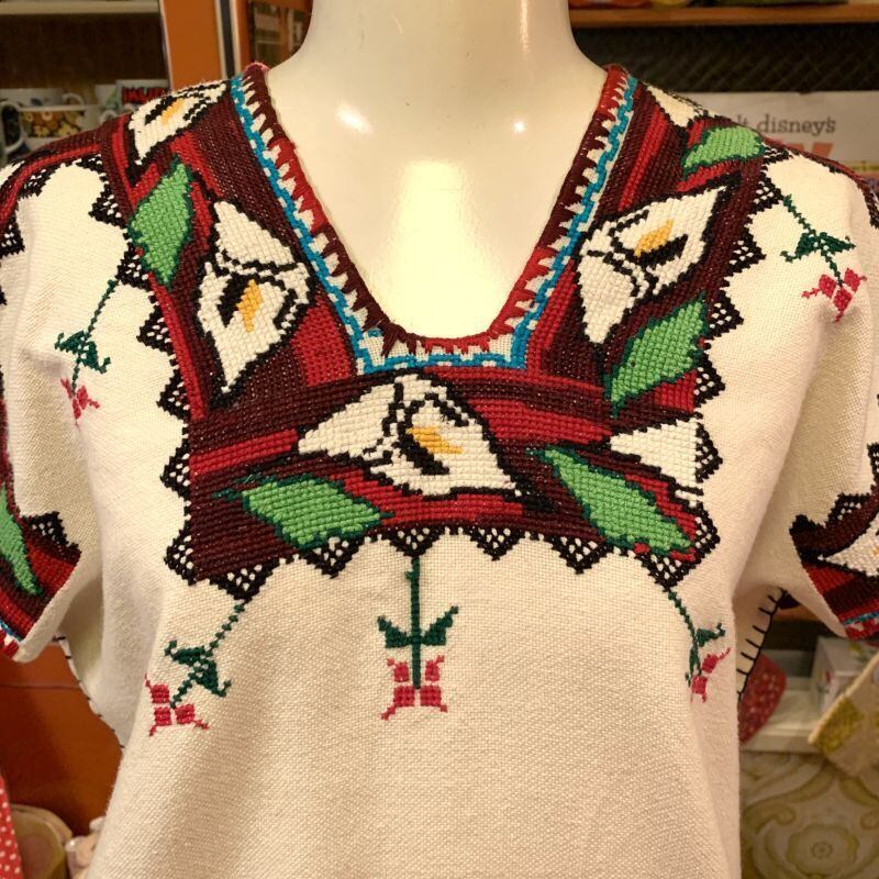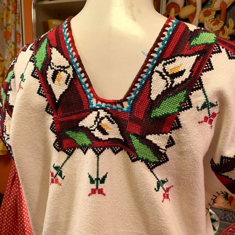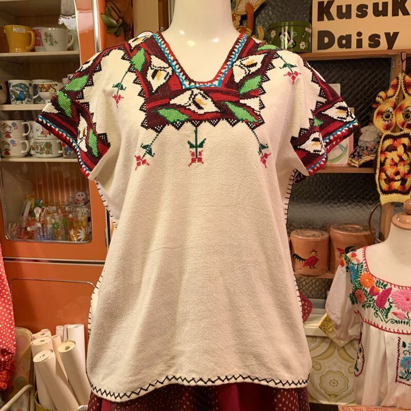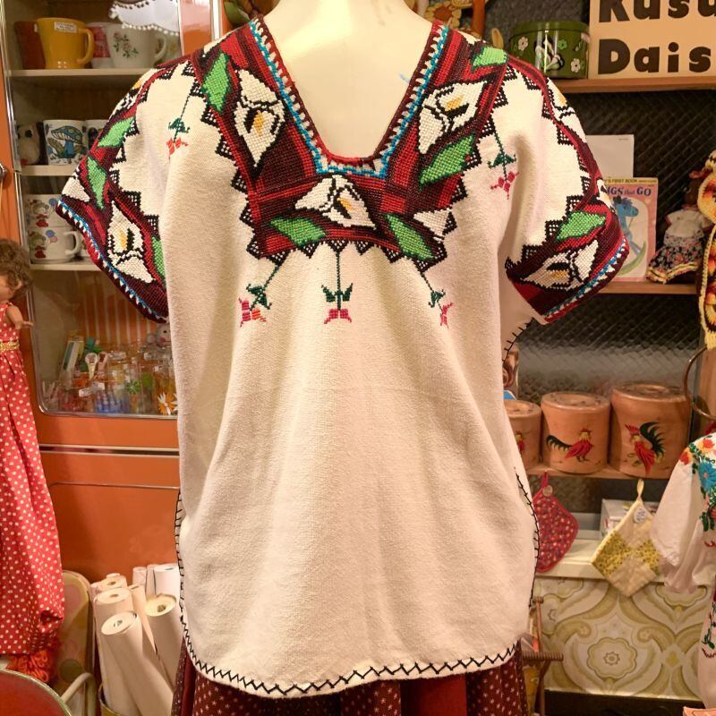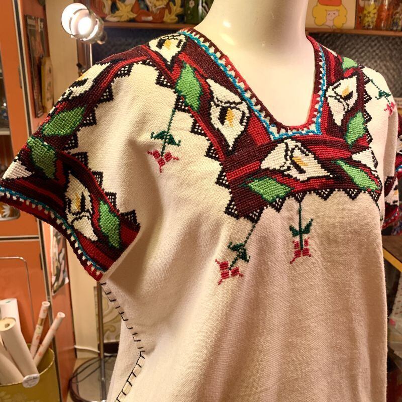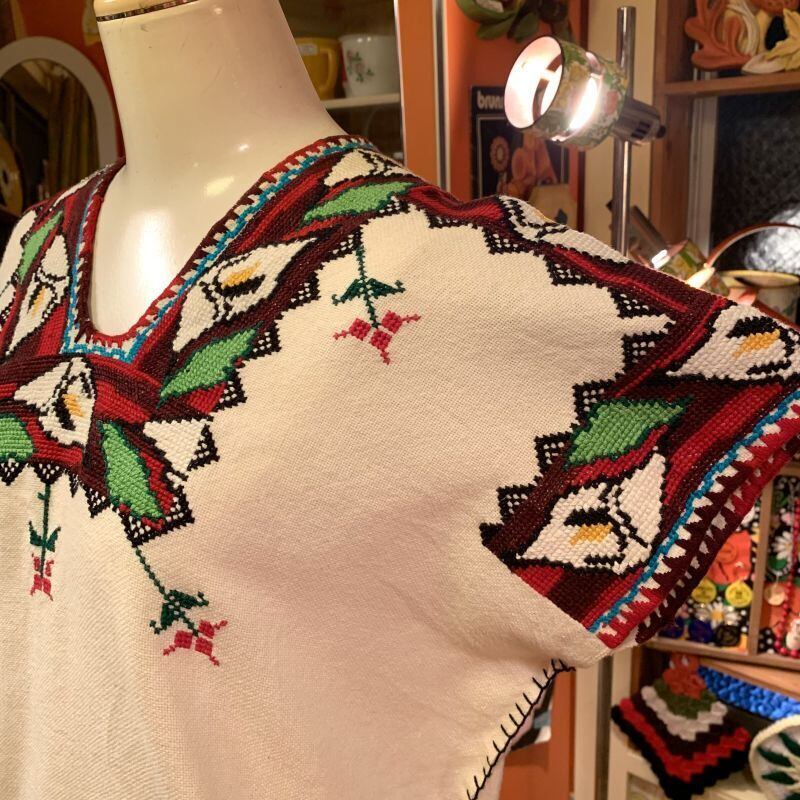ボルドーブラウン、レッド、グリーン、ホワイト、ブラック、イエロー、ライトブルーのカラフルなニードル刺繍がお袖や襟元に贅沢に施されており、カラフルでとっても可愛い1着です。