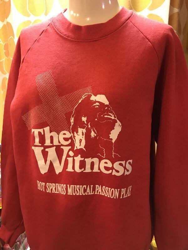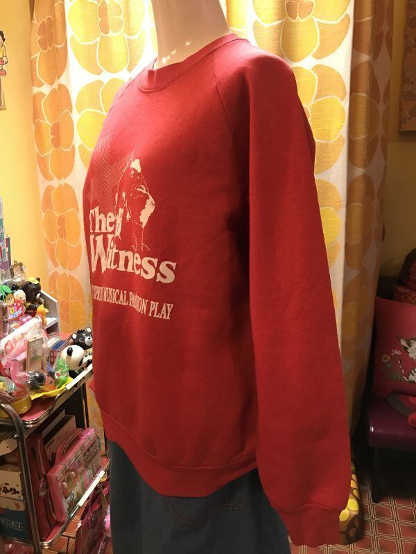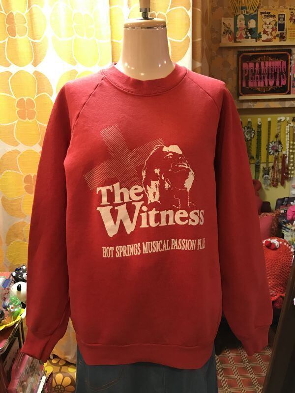 70'S〜80'S USA The Witness ラグランスウェットです。ヴィンテージならではの風合いのあるスウェット地が可愛いです。レトロなレッドにホワイトのアーティスティックなプリントも素敵ですね。バックプリントの英字のロゴも雰囲気があって素敵です。経年による若干の色褪せ、僅かなシミがあります。