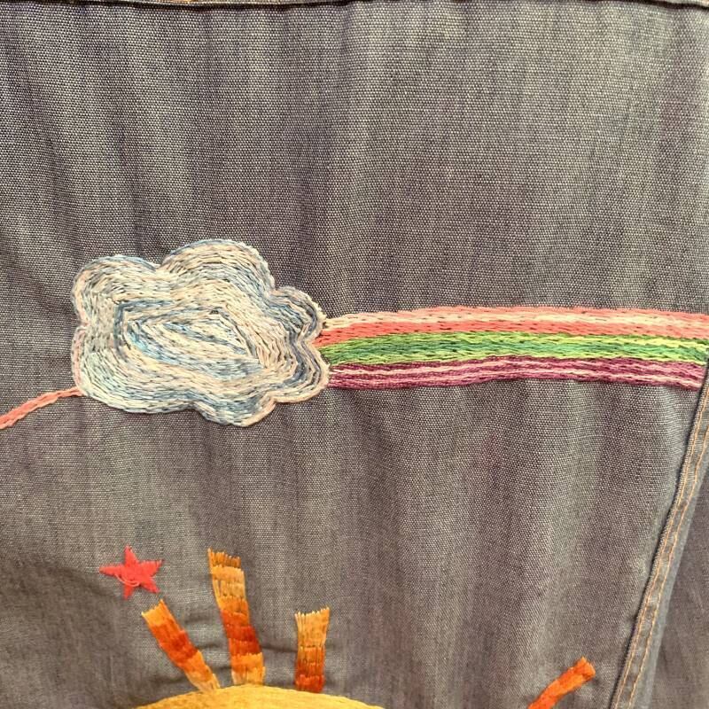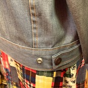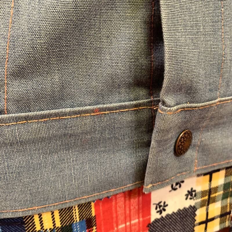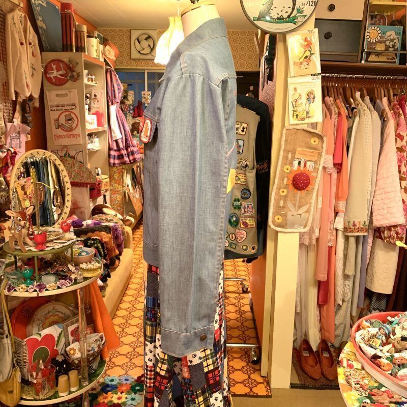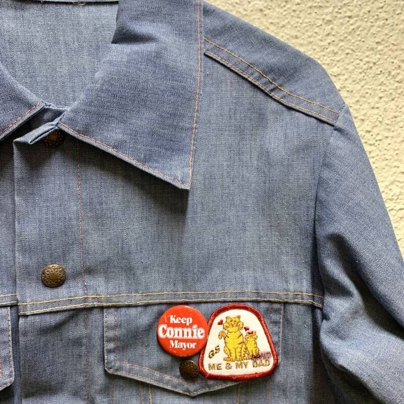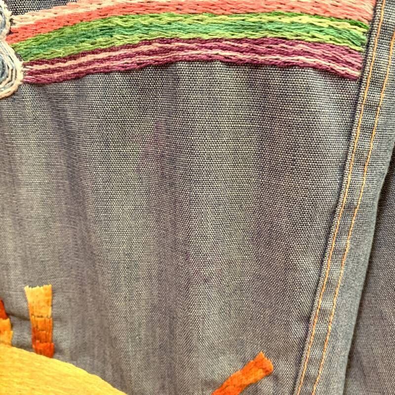 ライトブルーにオレンジのステッチ、仲良しネコさんのヴィンテージワッペンやヴィンテージの缶バッチ、背面側のカラフルヒッピーな刺繍がとっても可愛いです。