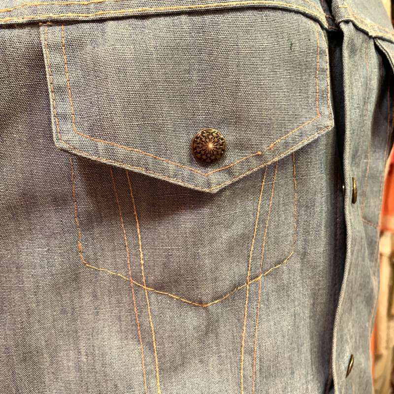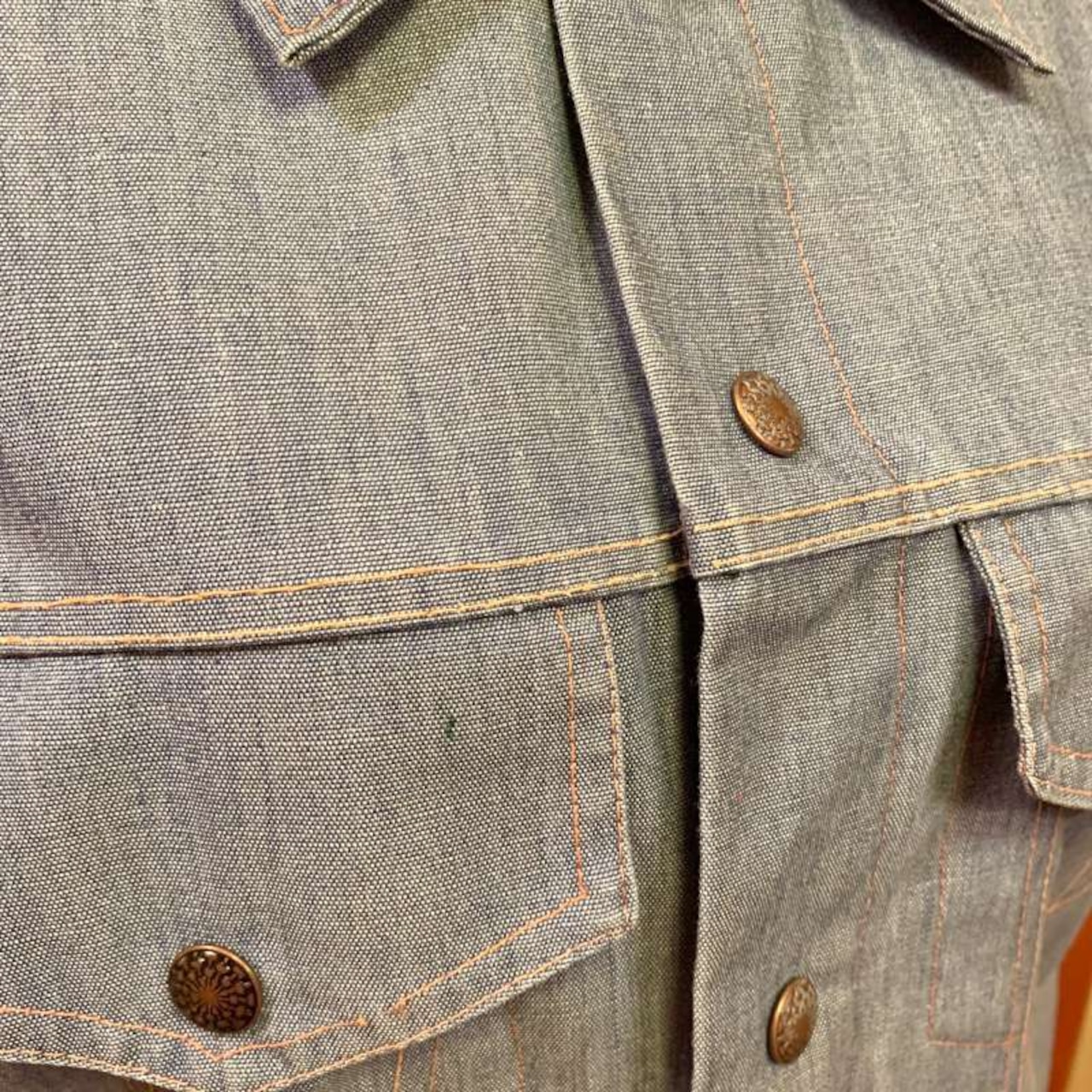 フロントの右ポケットのフラップに製造時からと思われる点のような色の濃い箇所、背面側の刺繍にこれから刺繍の予定だったと思われる薄らとしたマジック跡、ステッチのリペアがありますがヴィンテージならではなあじのある雰囲気です。