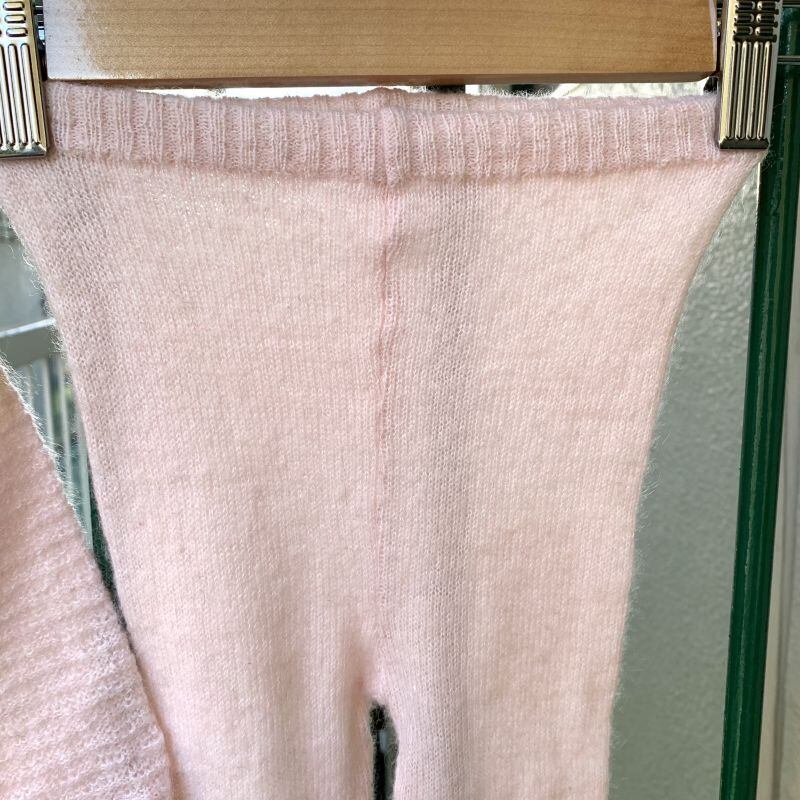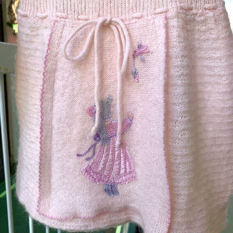 ライトなベビーピンクのカラーのニットにライトブルー、ライトピンクの女の子と鳥の刺繍パッチが施されたエプロンワンピースのようなデザインやニットタイツがとっても可愛いアイテムです。