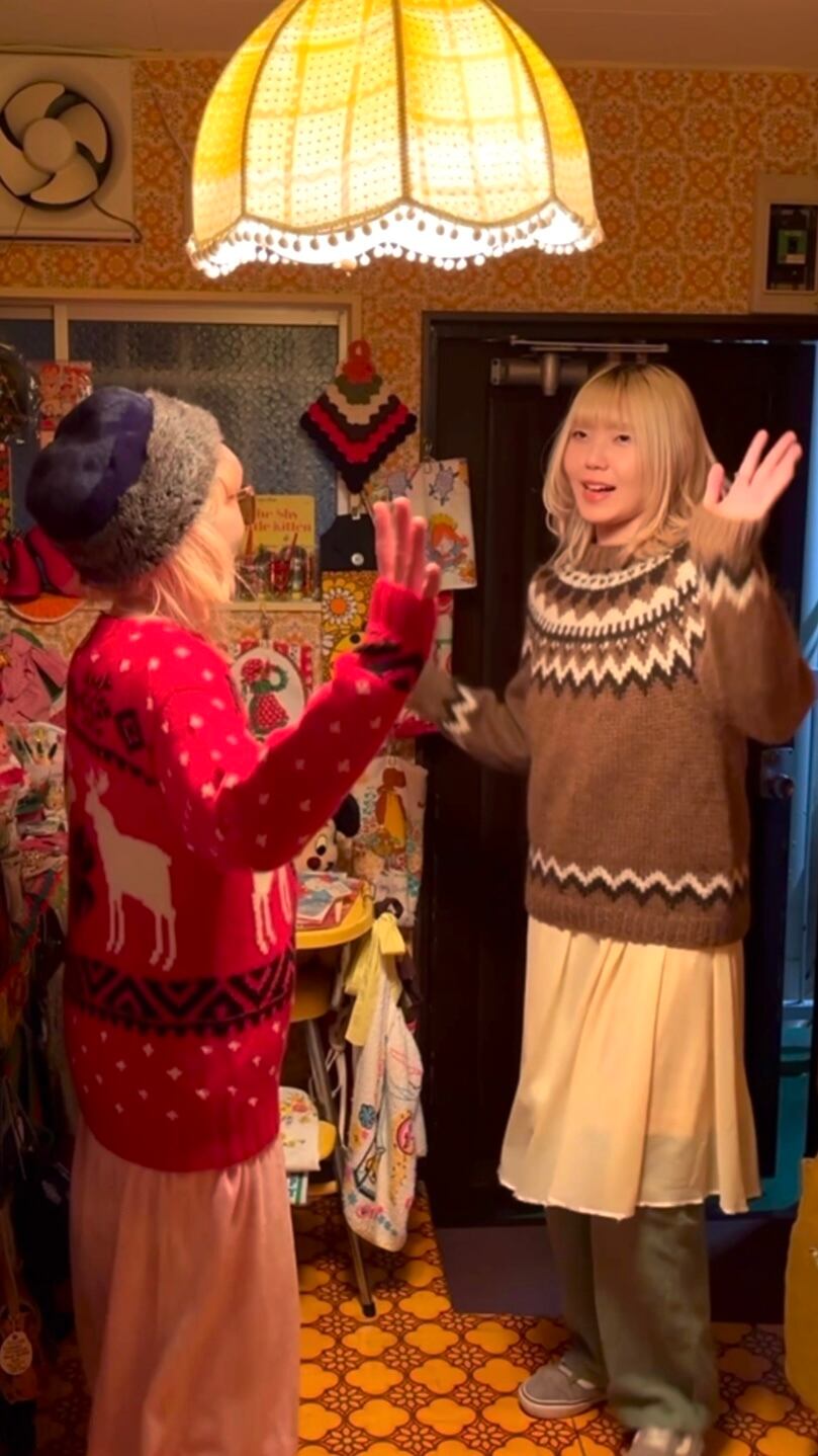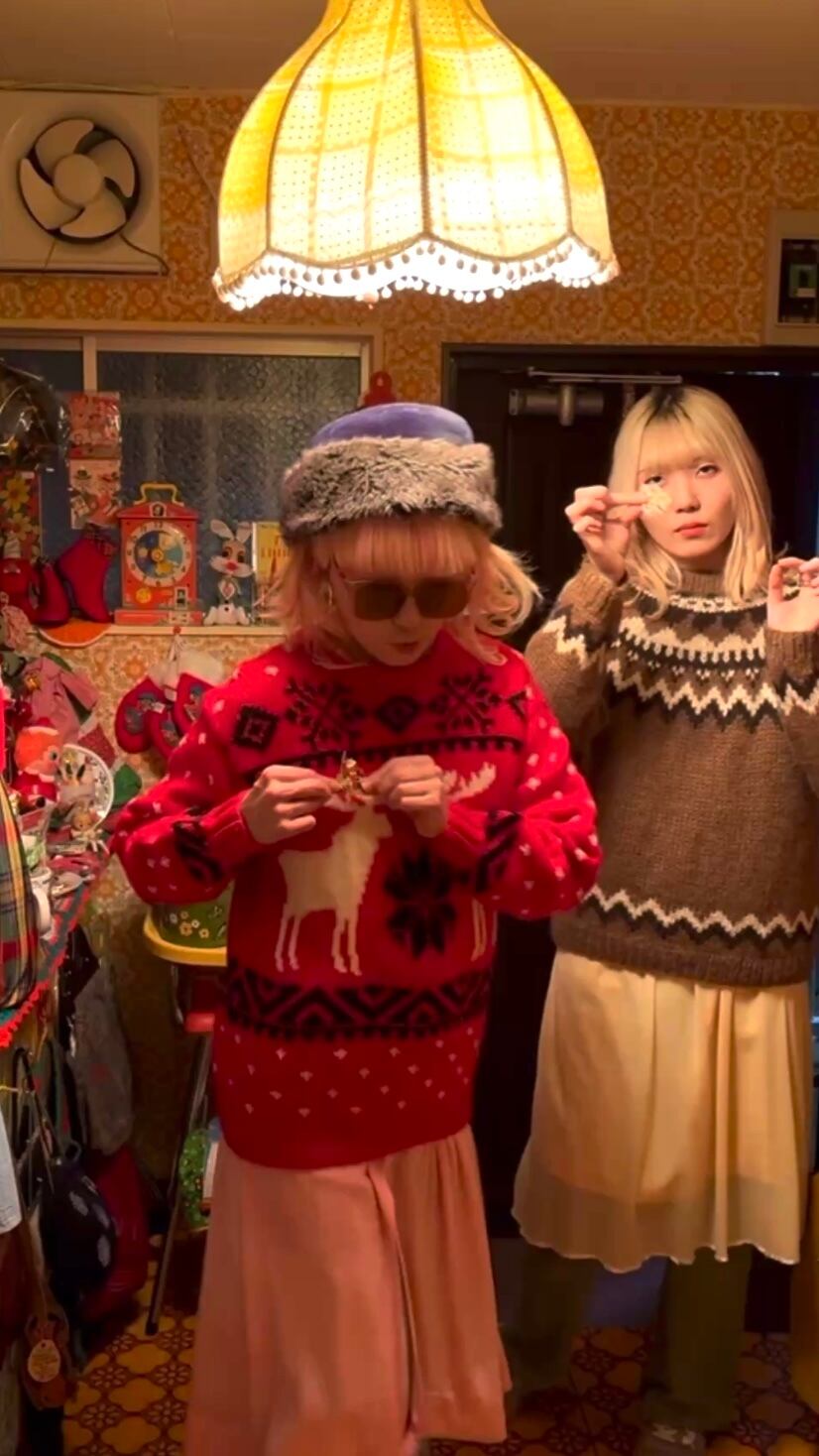僅かな毛羽立ち、背面側の左のトナカイの上に玉留めによる点のようなポコっとした箇所がありますがハンドワークならではな温かみのある1着です。