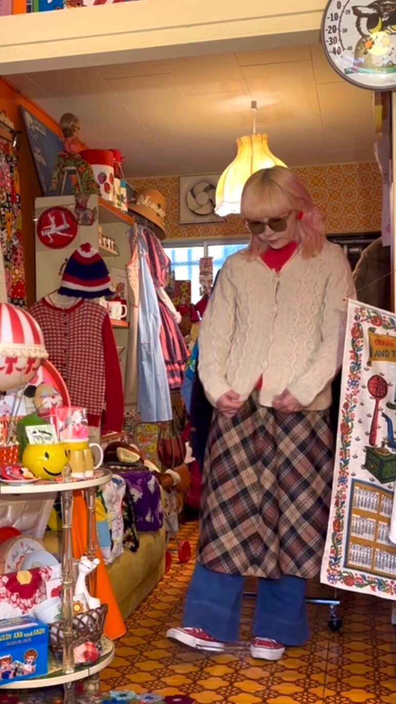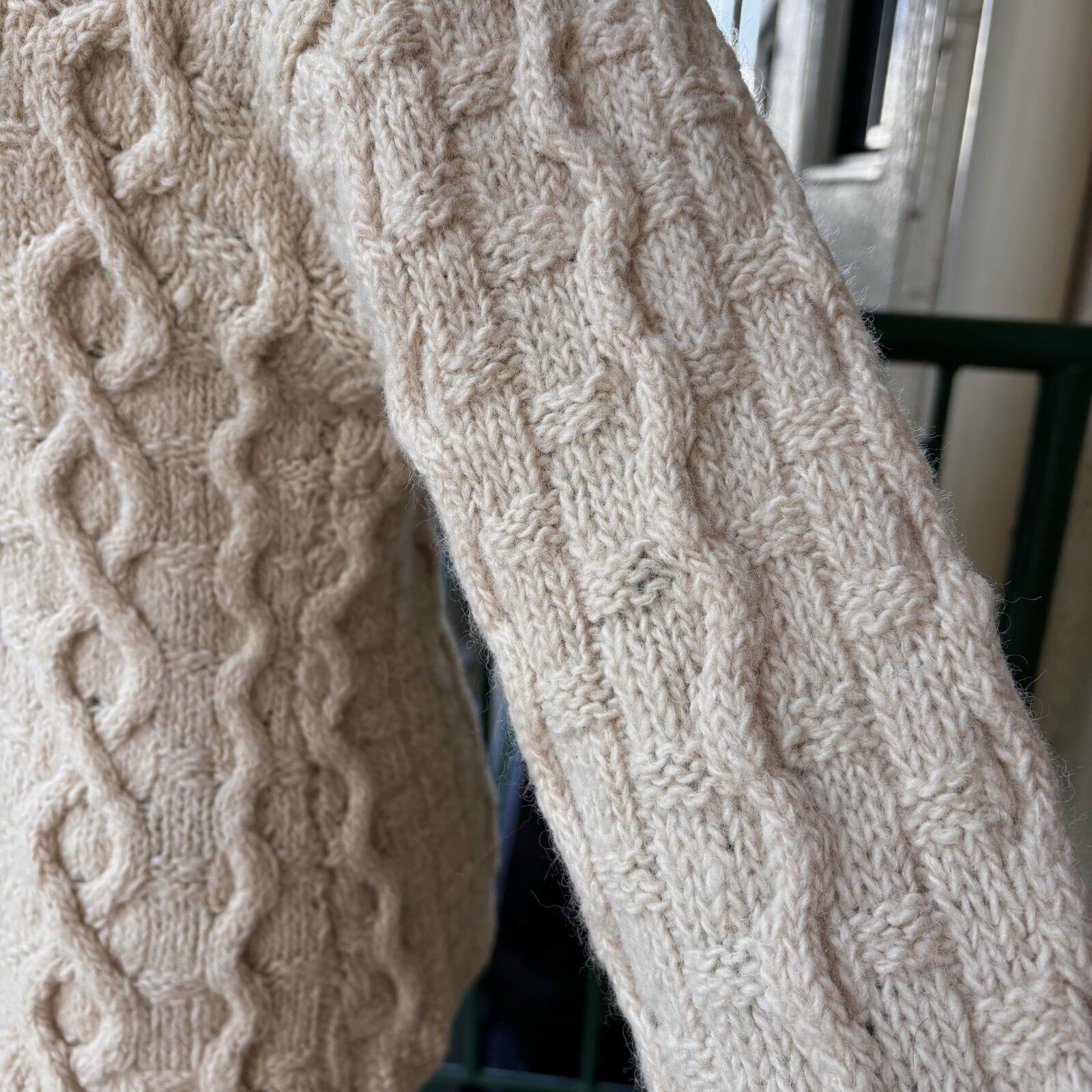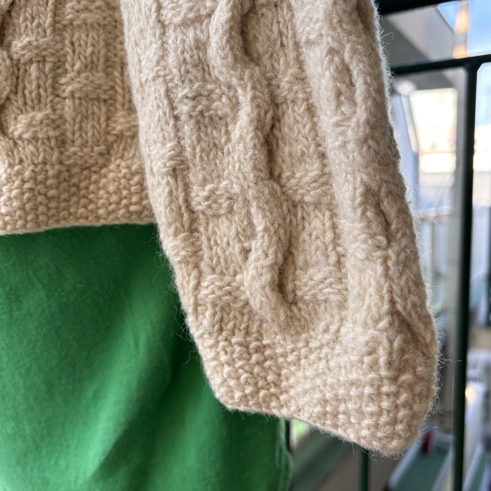 アイボリーカラーのボディーで当時のハンドワークによるざっくりとしたケーブル編みがとっても可愛い1着です。