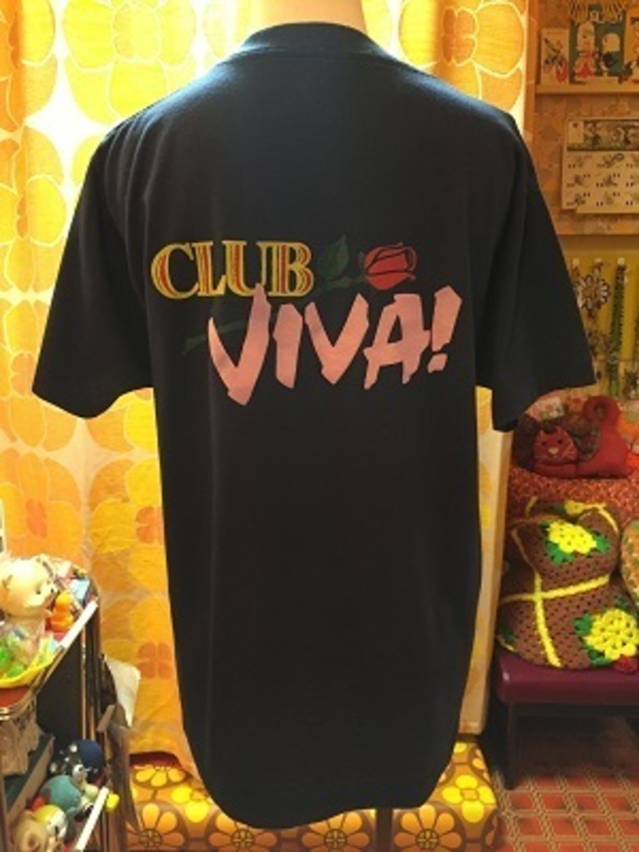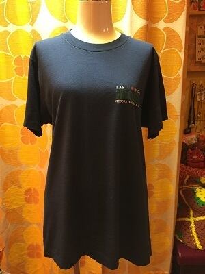 70'S〜80'S USA VIVA!ROSE半袖Teeです。ネイビーにバックプリントのVIVA!ROSEの大きなロゴやバラのプリントが可愛いです。フロントの胸元にも小さなバラ模様が。英字のフォントも雰囲気があって可愛いですね。ラスベガスの華やかな雰囲気が伝わってくるようですね。片方のお袖やボディーに白っぽいシミがあります。若干の経年感は見られますが大きなダメージはありません。