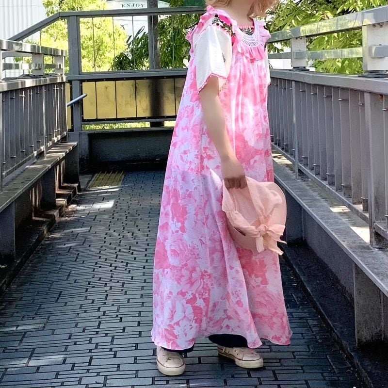 広く開いた襟元のフリルやクロシェのデザインやホワイトベースにピンクの大きなフラワープリントが華やかで とっても可愛い1着です。
