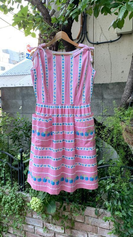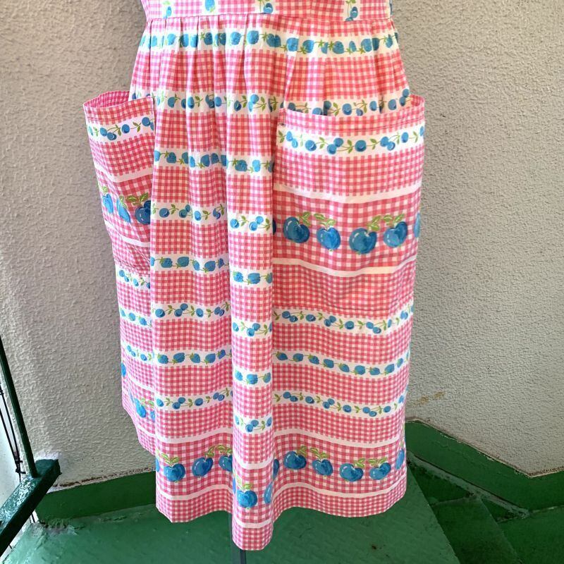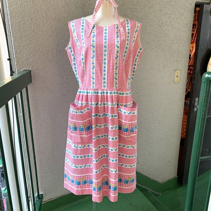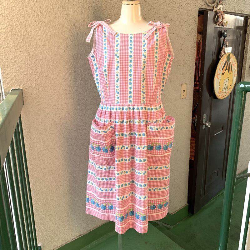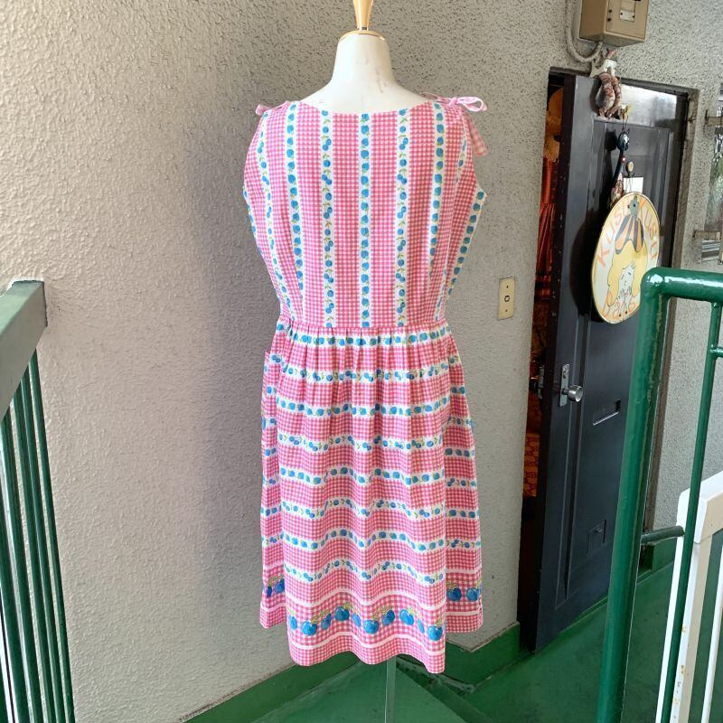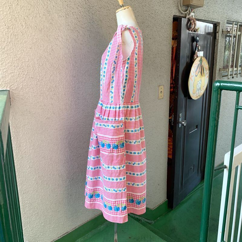 70'S〜80'S USA Vintage checkered cherry&strawberry sleeveless cotton dress。