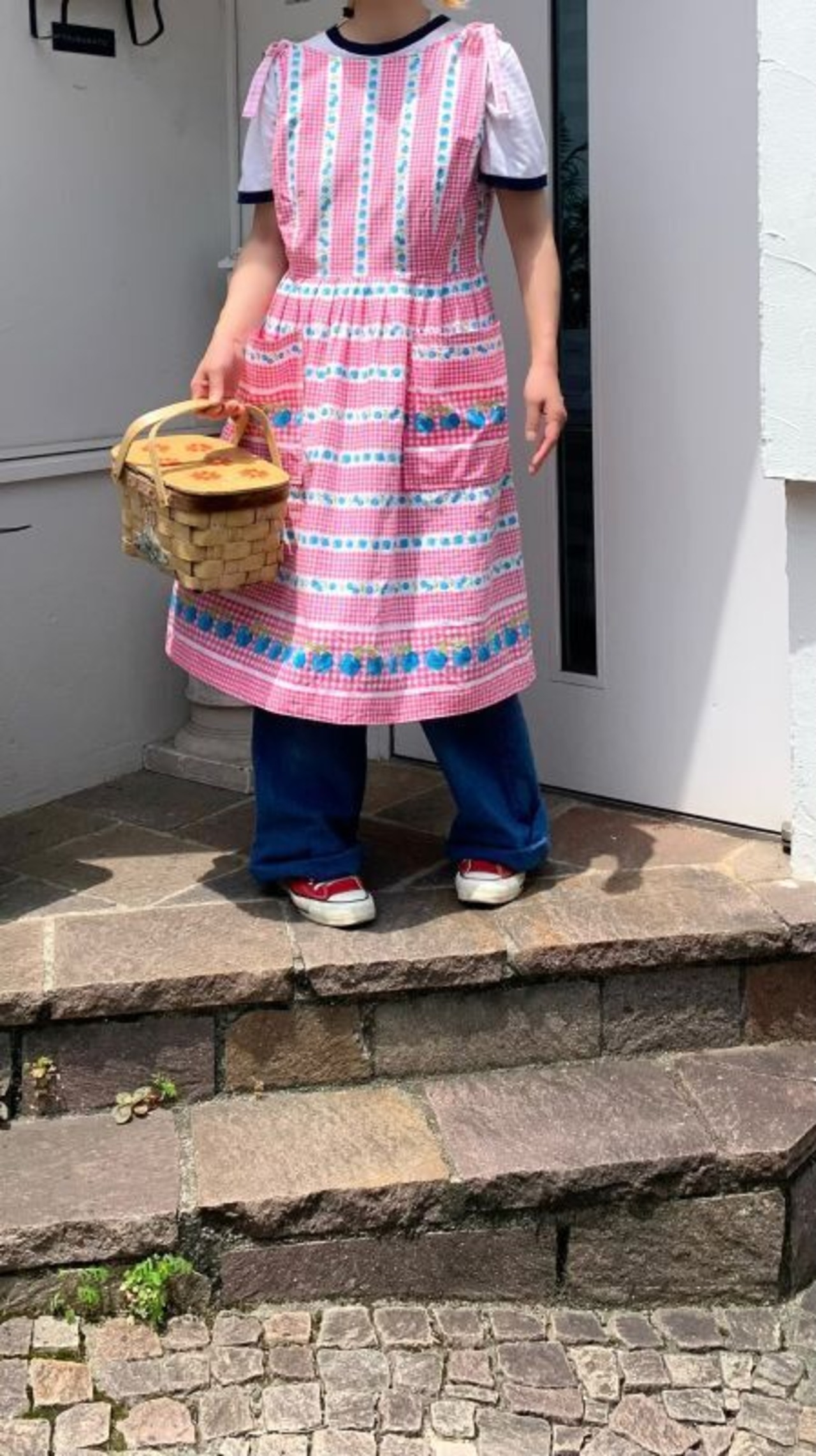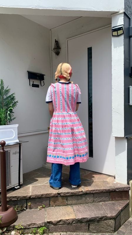 トップは縦のライン、スカートは横のラインのお仕立てで、裾とポケットには少し大きなリンゴの柄があるのも可愛いポイントです。