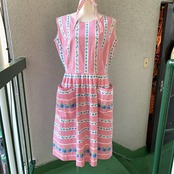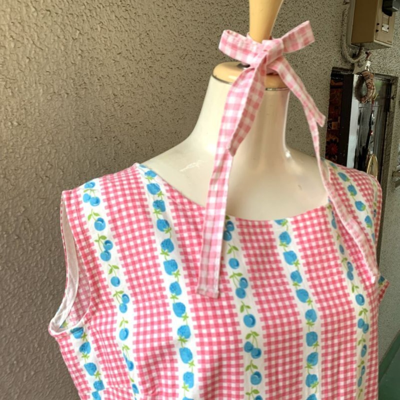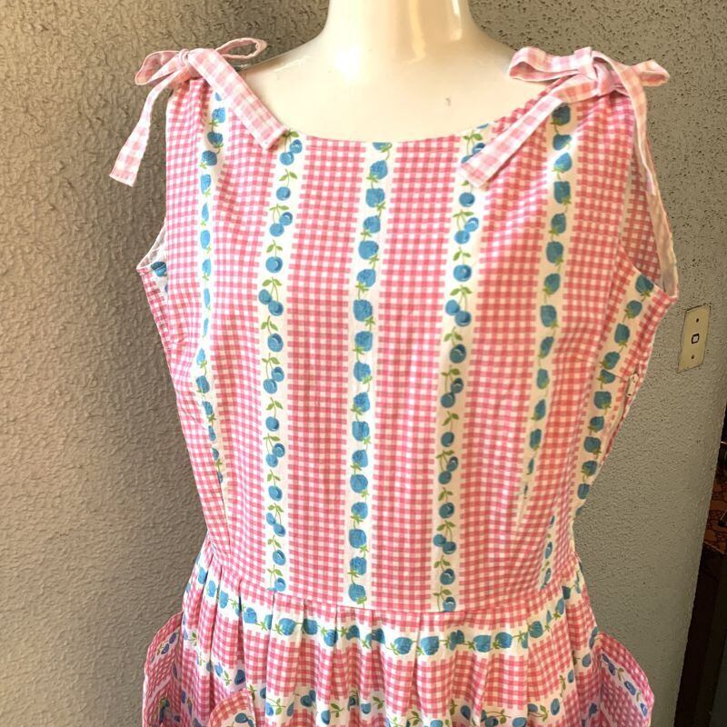 70年代から80年代 当時のハンドメイド1点もの ヴィンテージ チェリー&ストロベリー柄 ギンガムチェック ノースリーブドレスです。