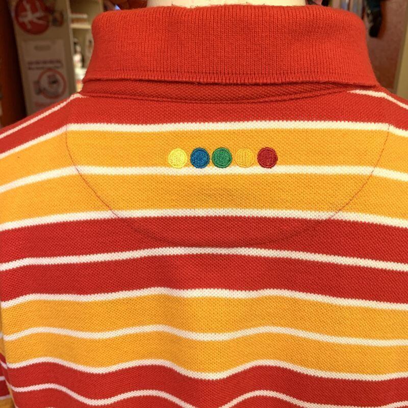 片方の袖口や背面の襟元にもカラフルな刺繍があり、裾にはレインボーカラーのタグが付いています。