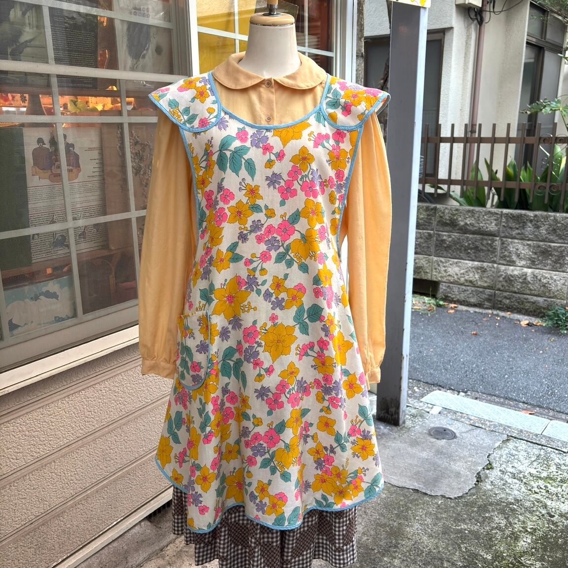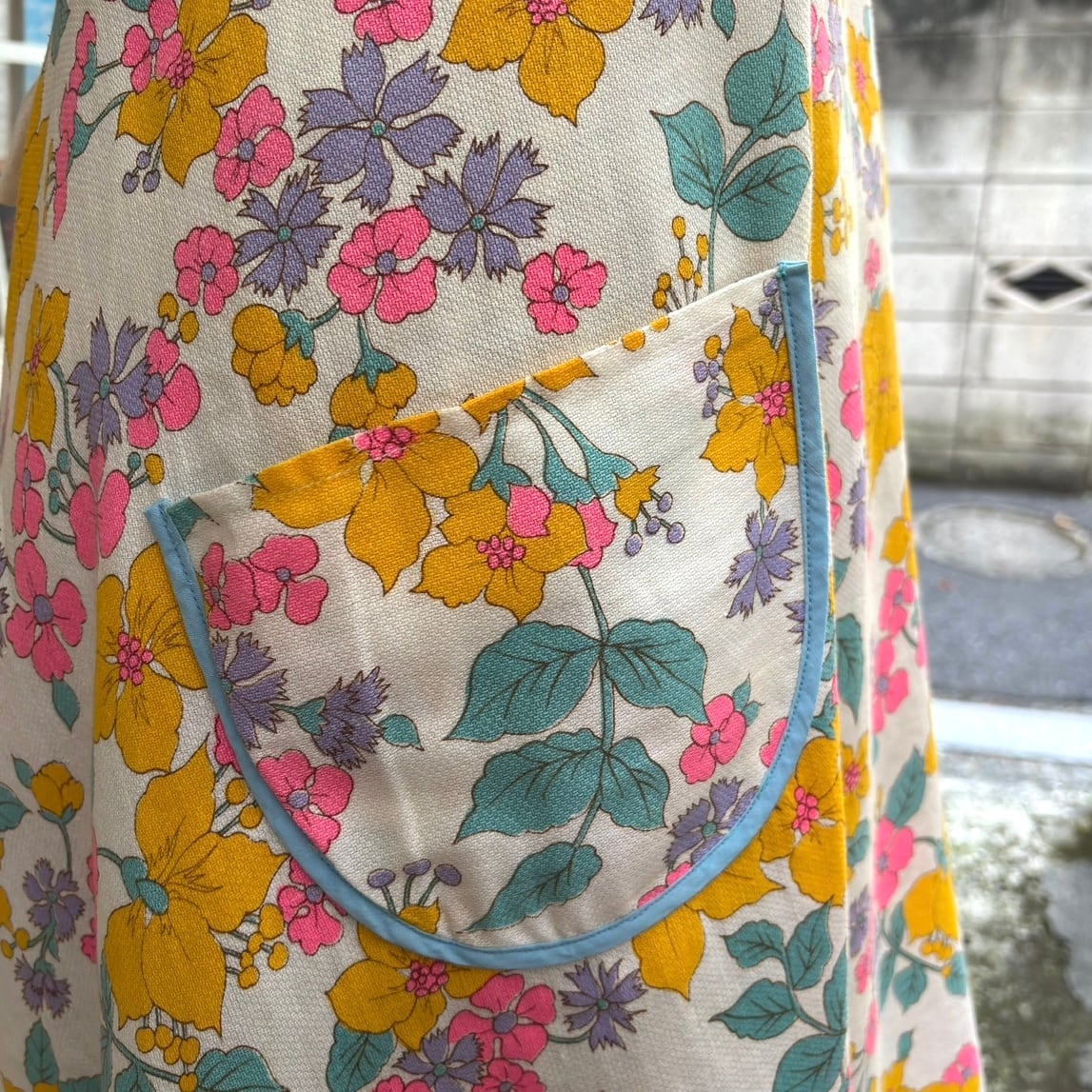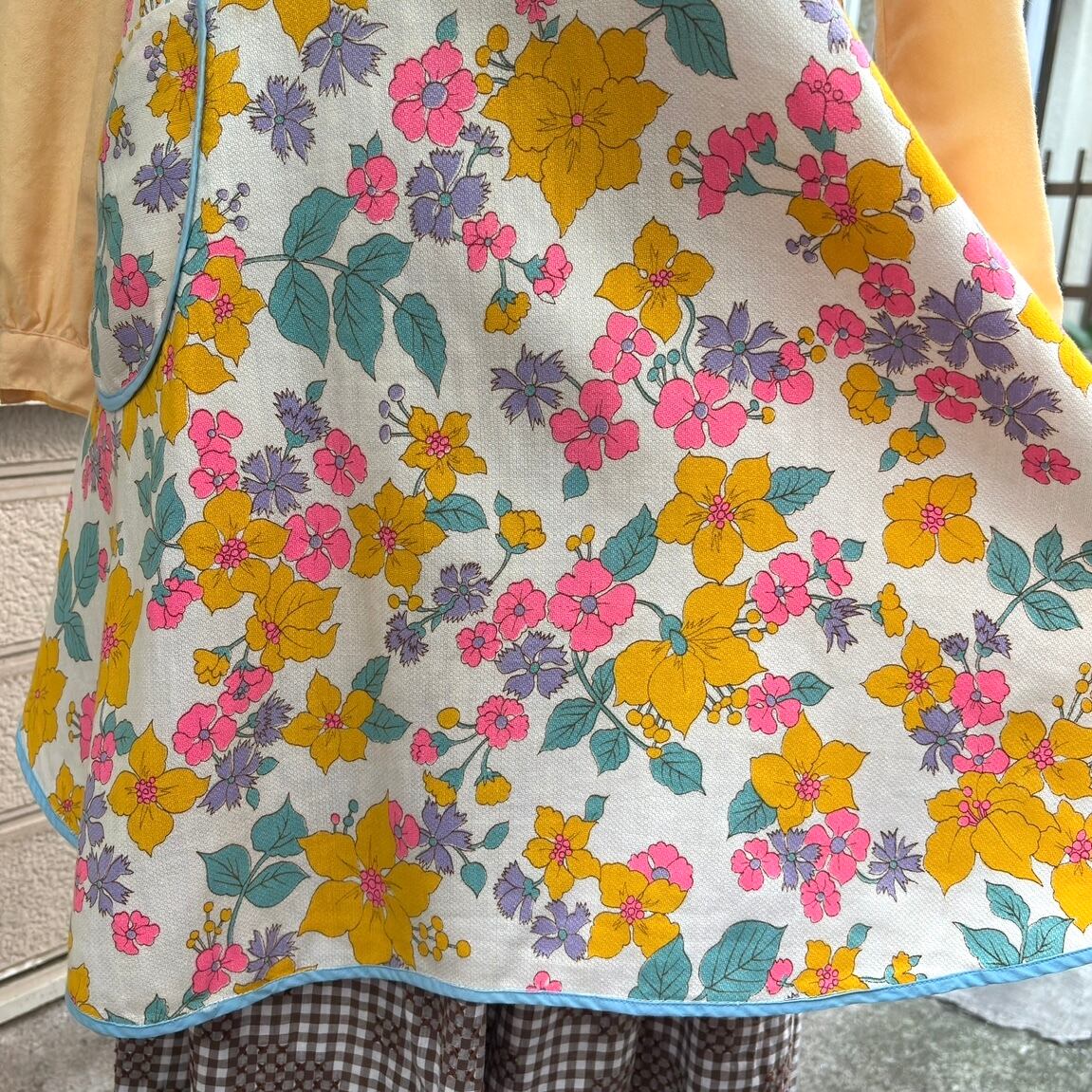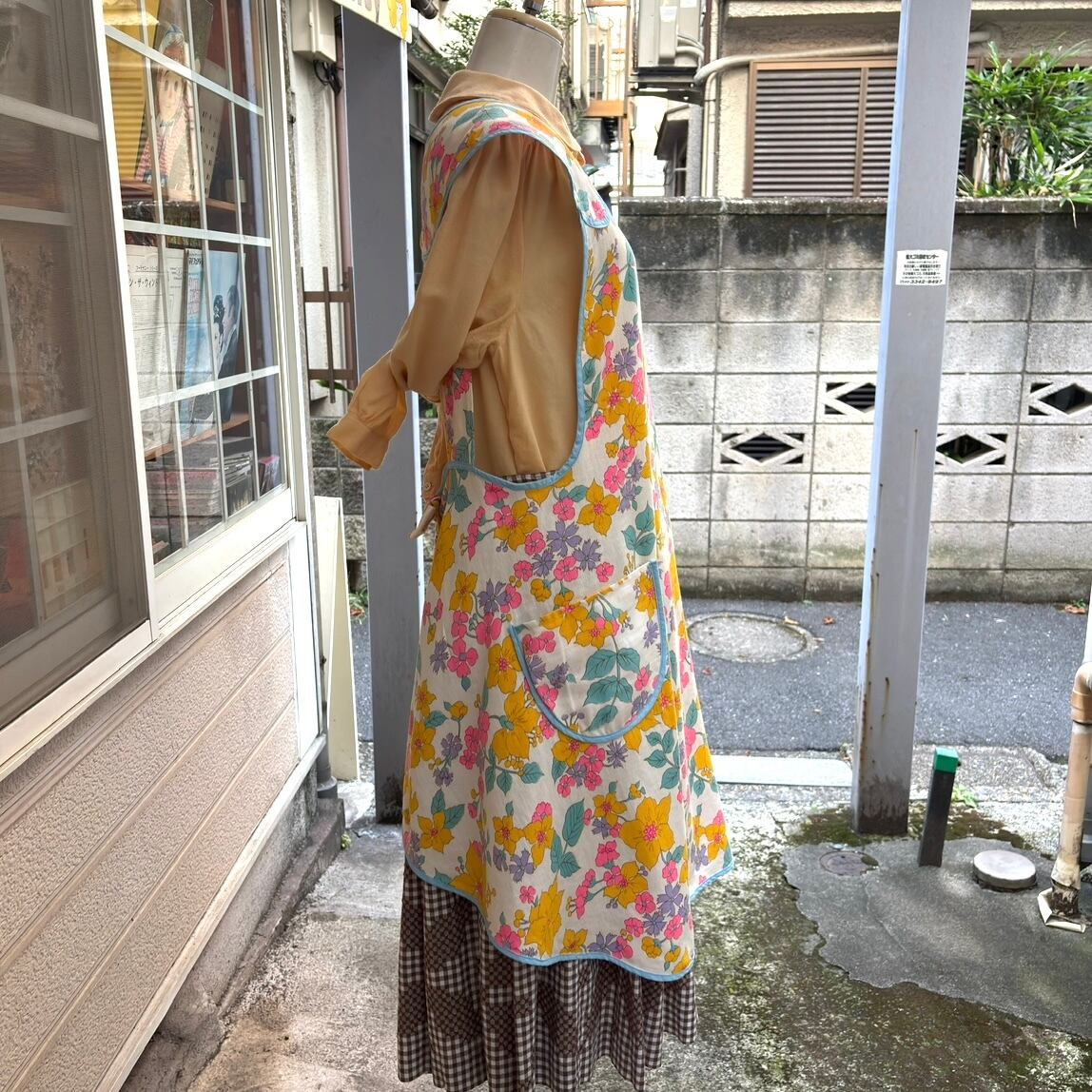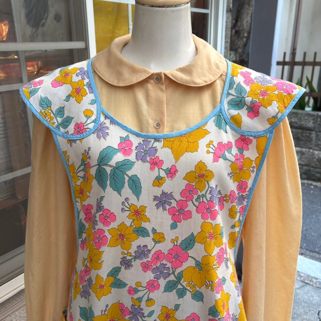 70年代 当時のハンドメイド1点もの ポップフラワープリント エプロンドレスです。