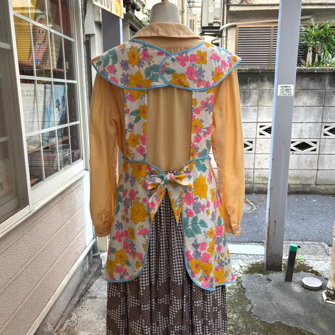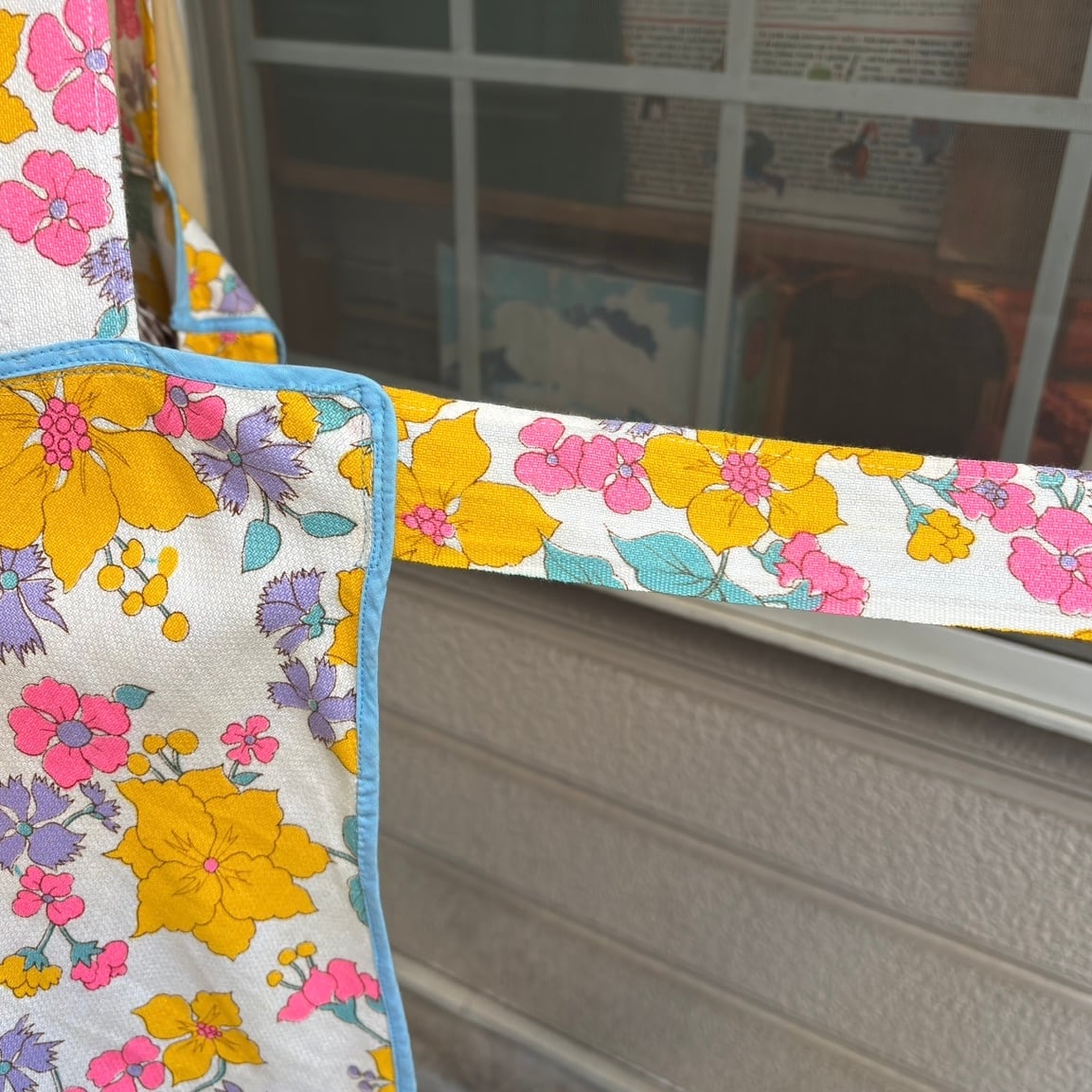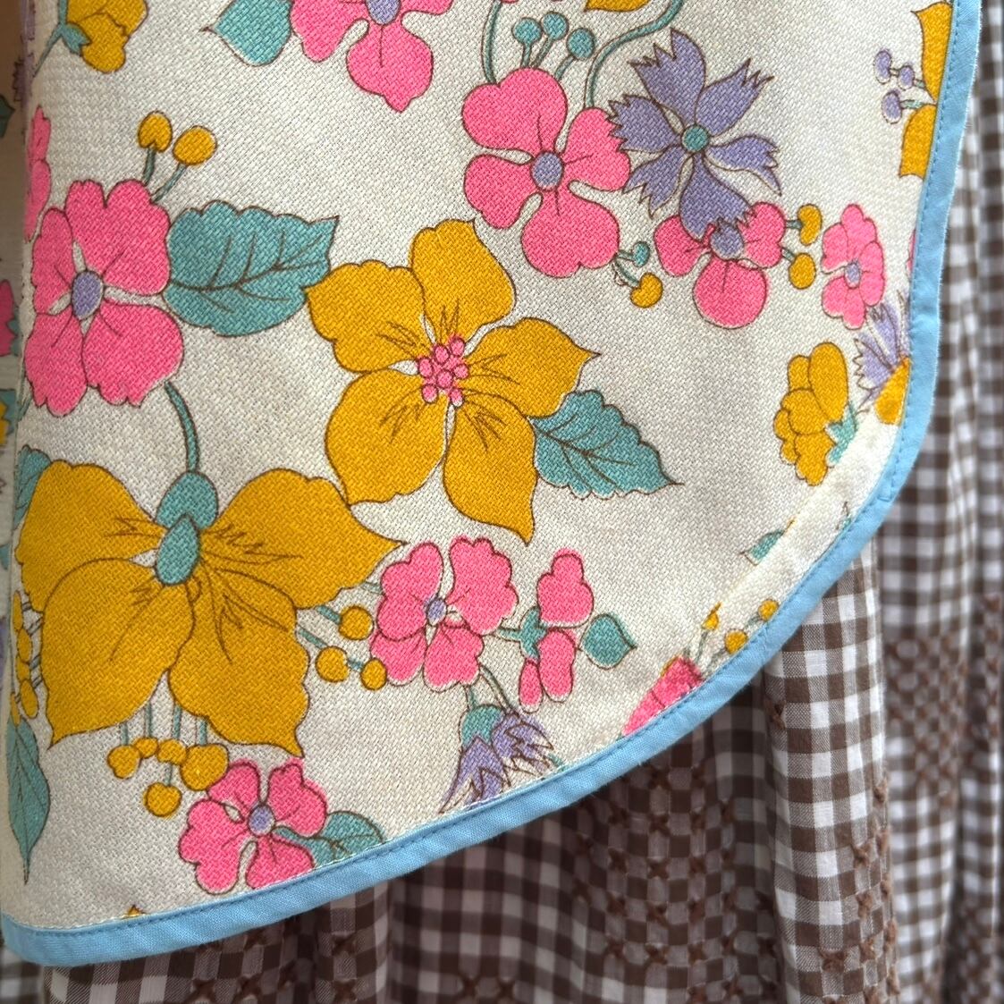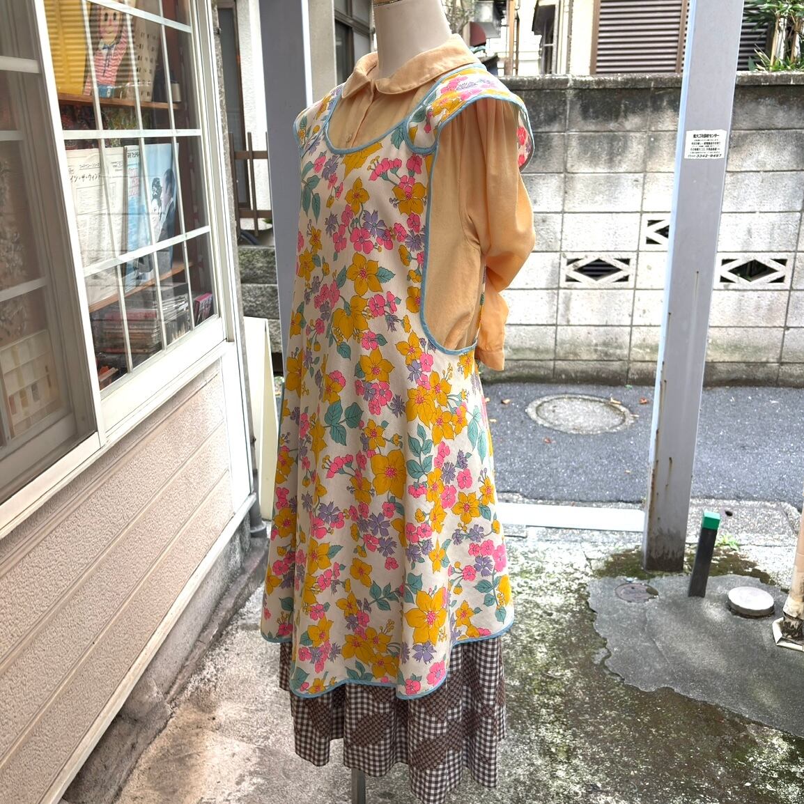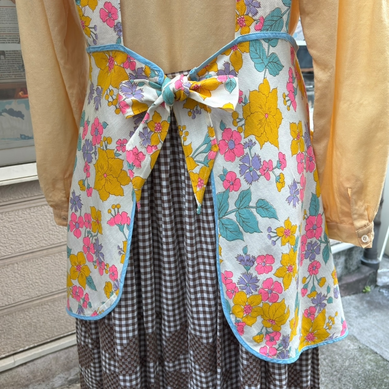 70年代 当時のハンドメイド1点もの ポップフラワープリント エプロンドレスです。