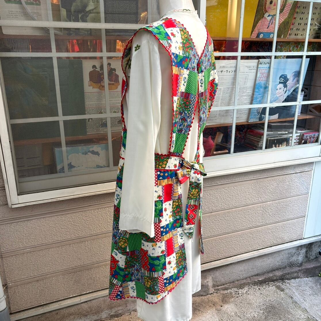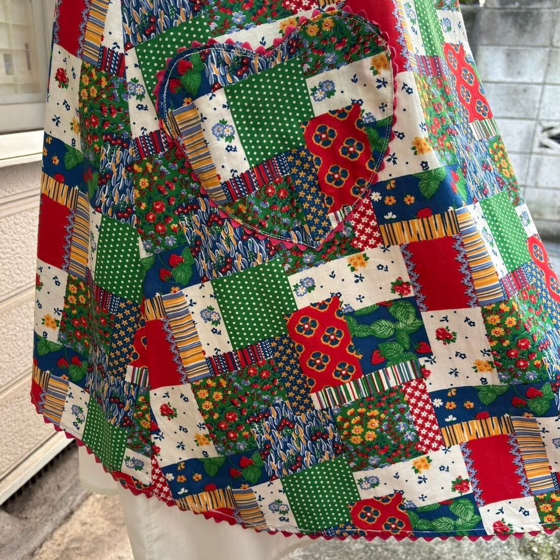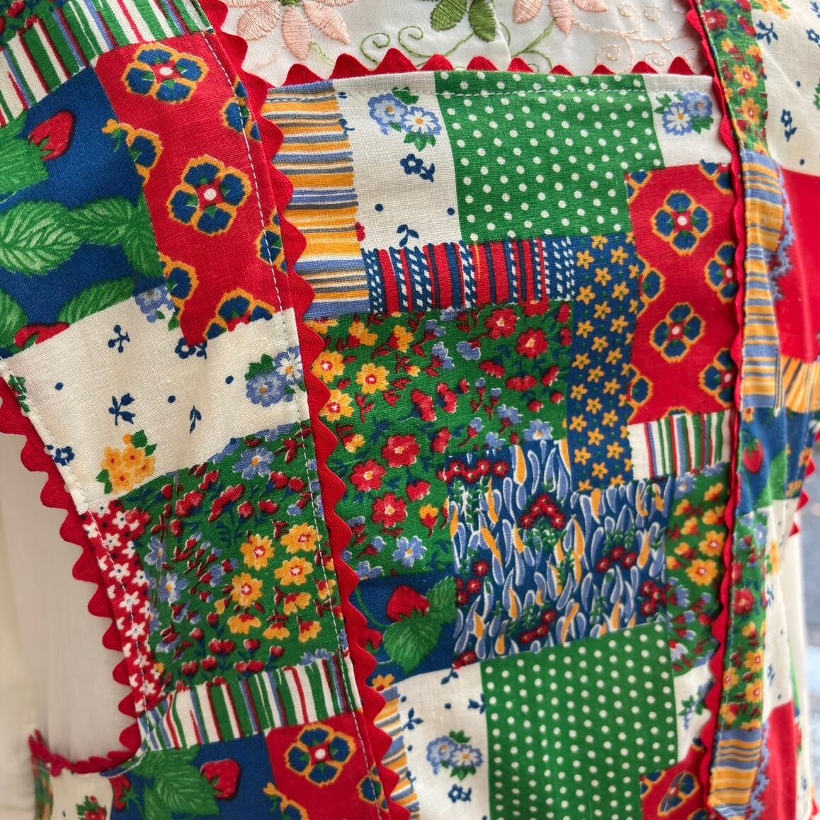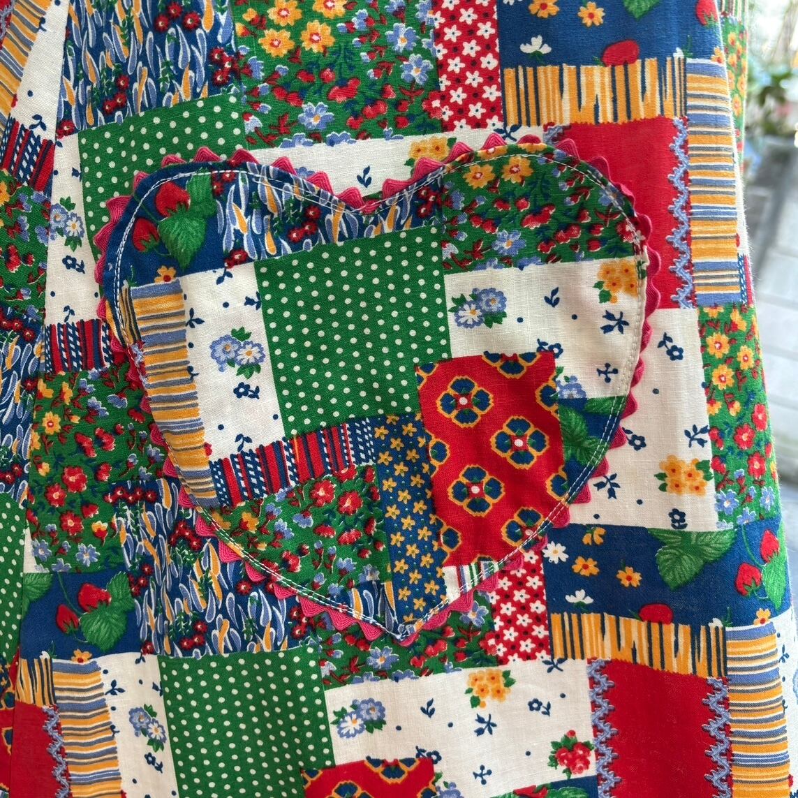 70年代 当時のハンドメイド1点もの ストロベリー フラワー パッチワークプリント ハートポケット エプロンドレスです。