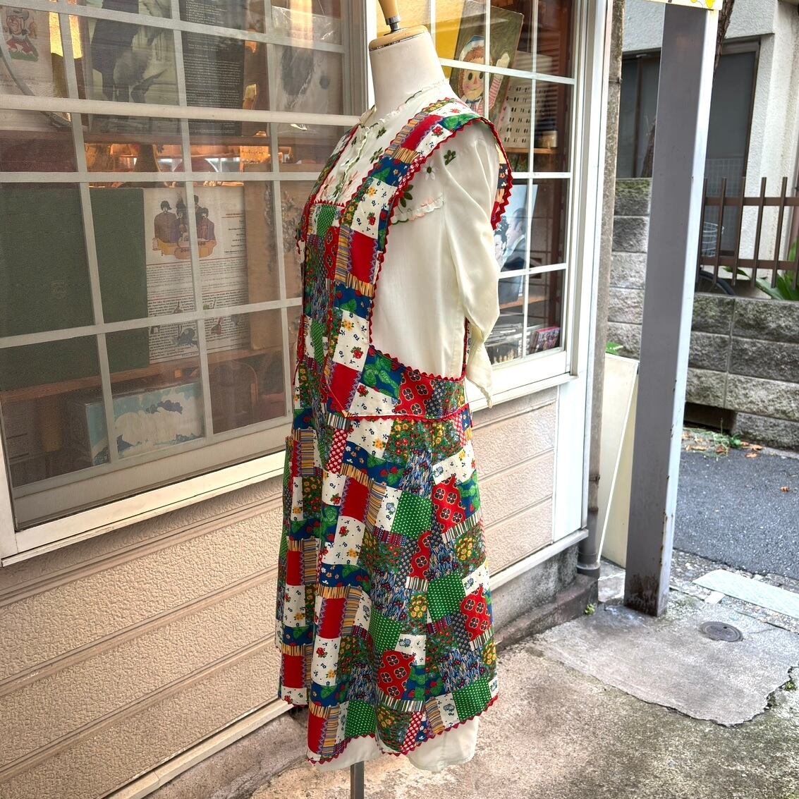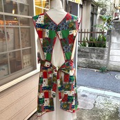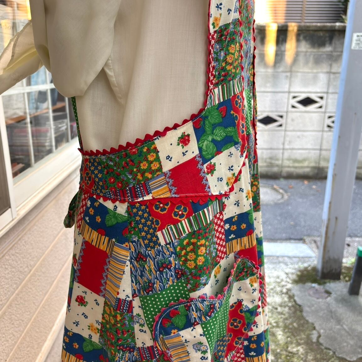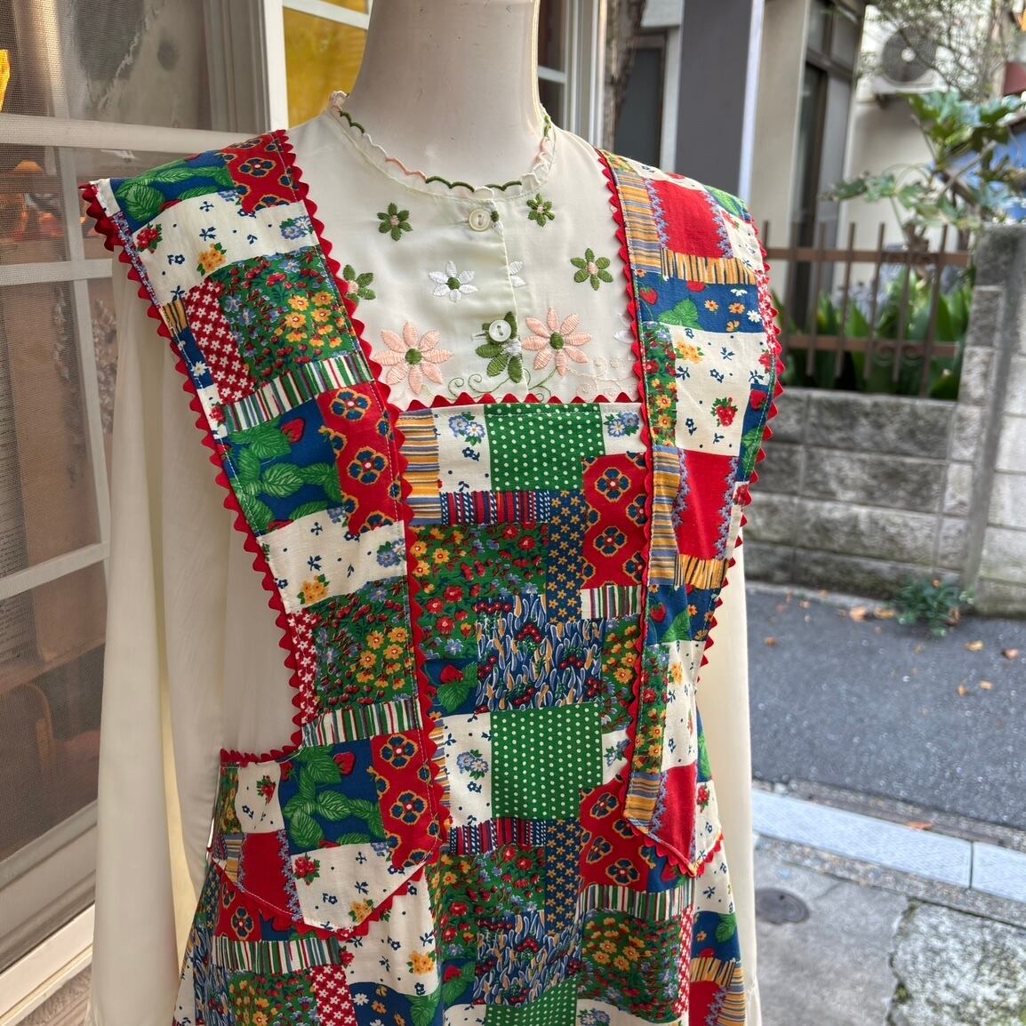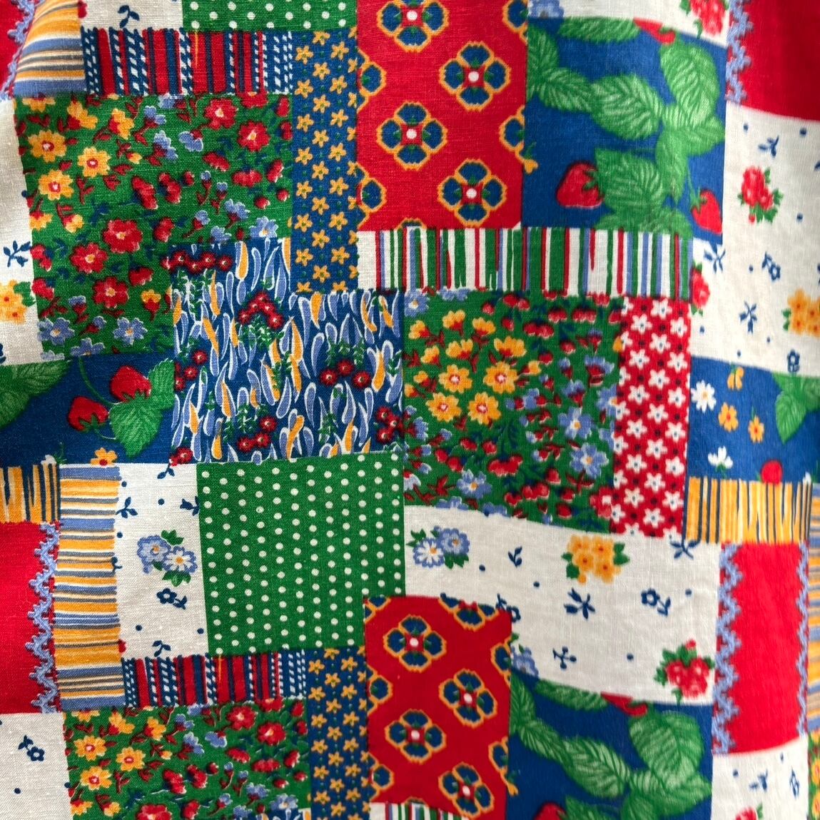 70年代 当時のハンドメイド1点もの ストロベリー フラワー パッチワークプリント ハートポケット エプロンドレスです。