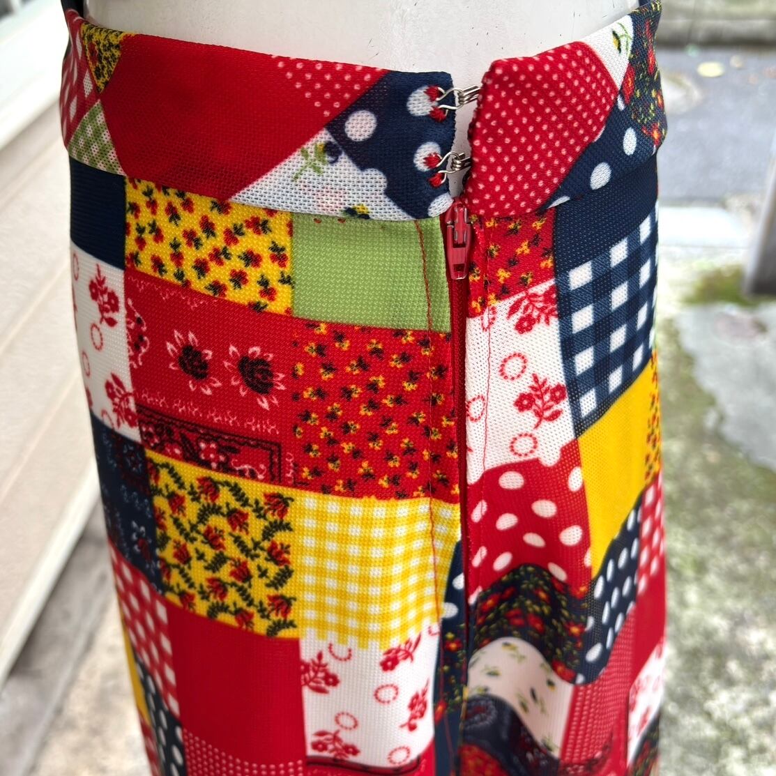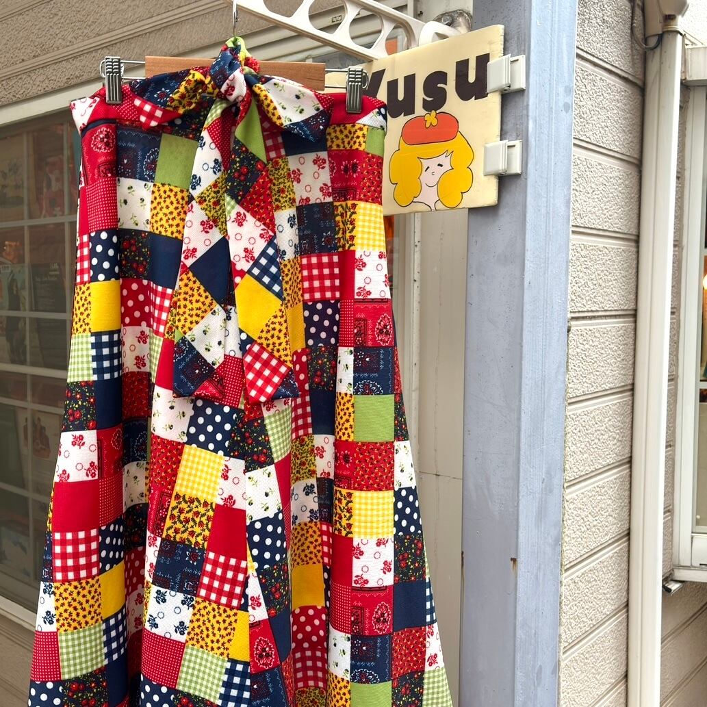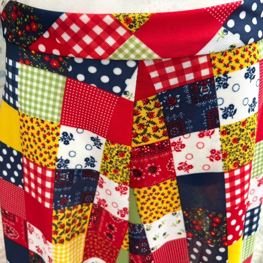 70年代 ヴィンテージ 当時のハンドメイド1点もの ドット&ギンガムチェック&バンダナ柄&フラワー柄 パッチワークプリント ロングフレアスカートです。