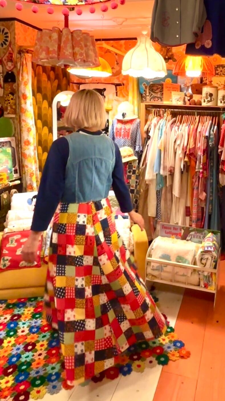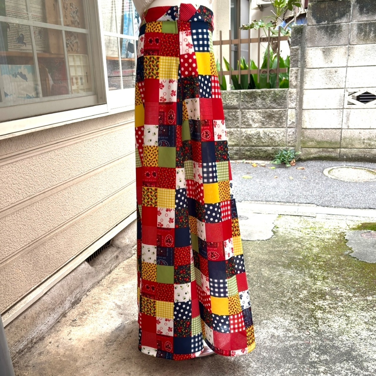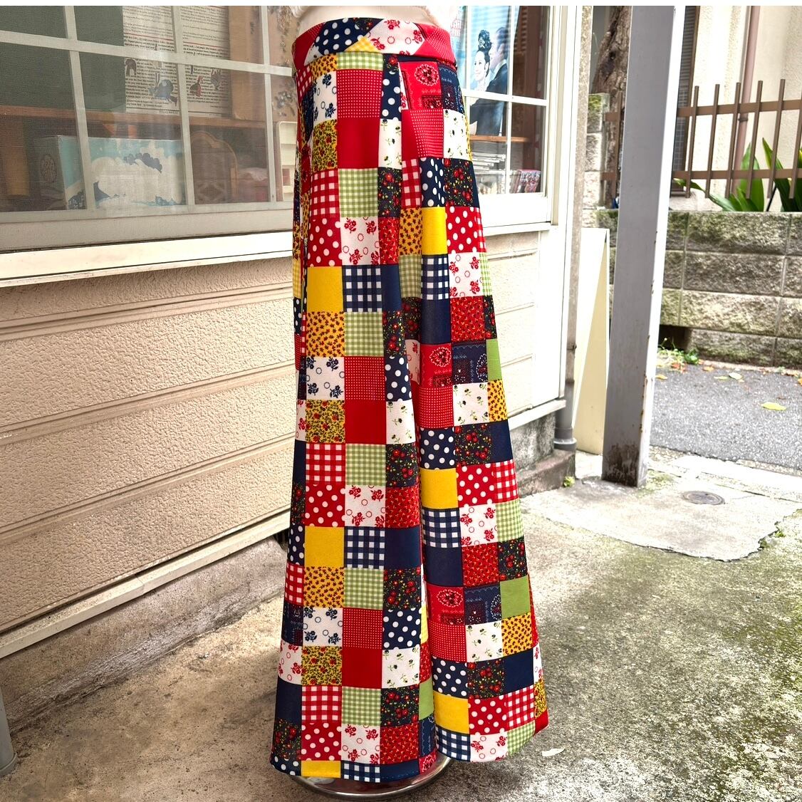 70年代 ヴィンテージ 当時のハンドメイド1点もの ドット&ギンガムチェック&バンダナ柄&フラワー柄 パッチワークプリント ロングフレアスカートです。