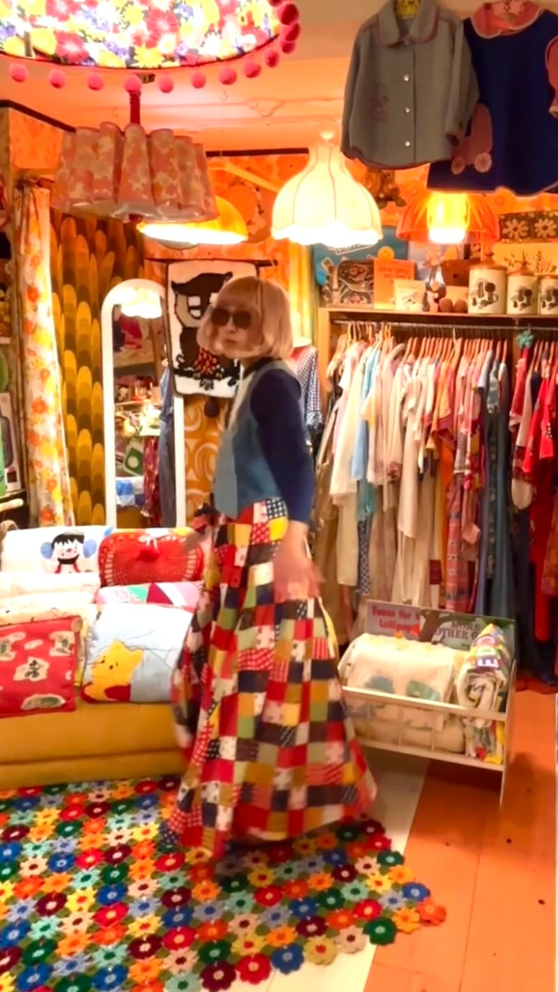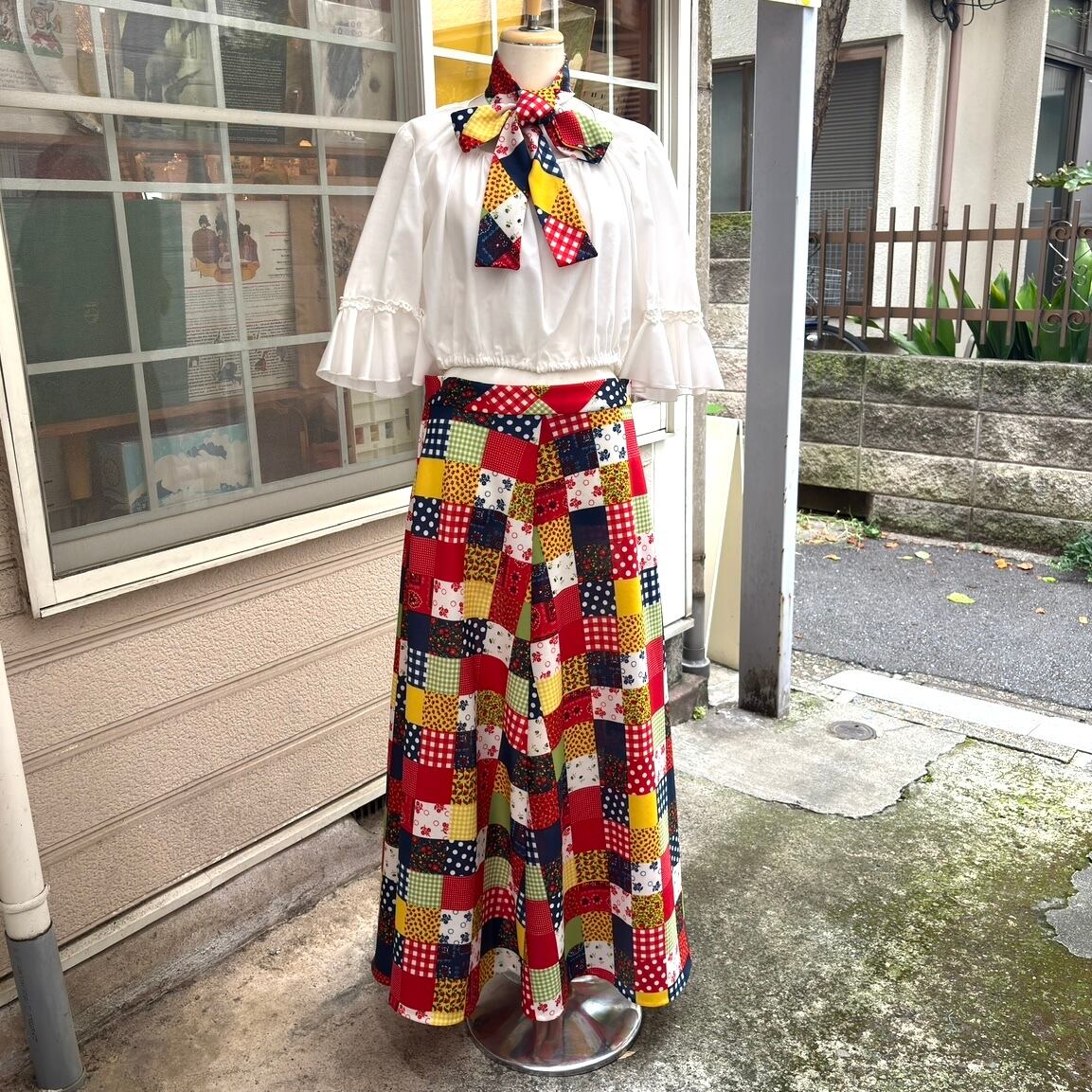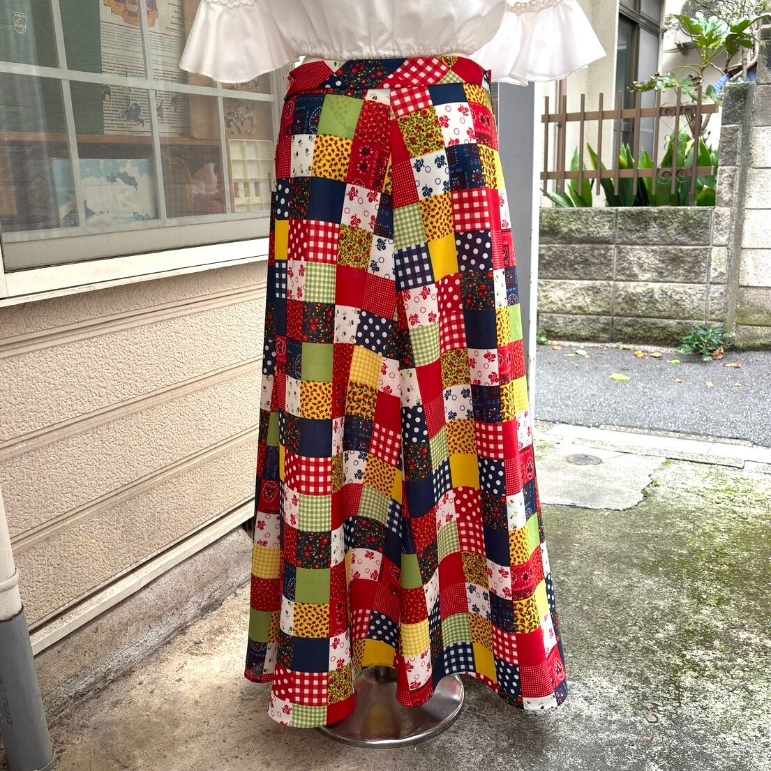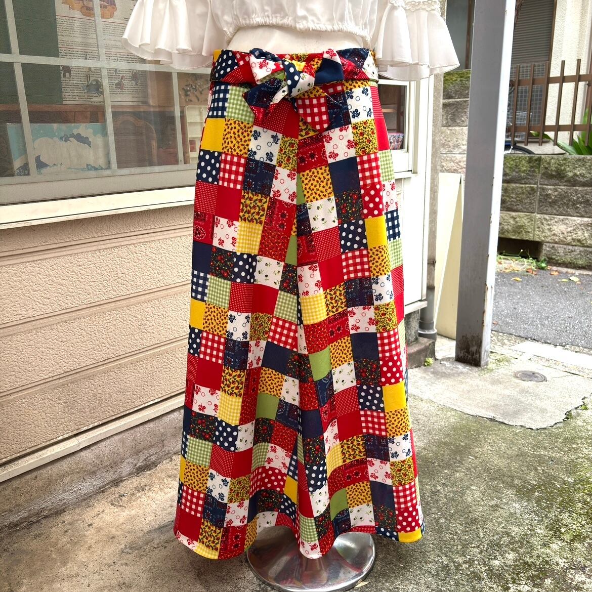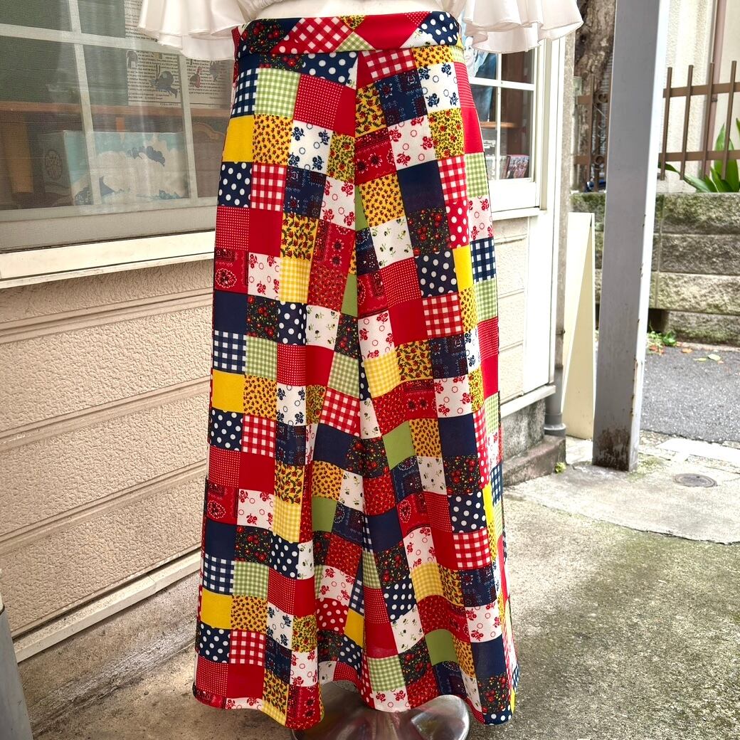 70'S USA Vintage dot&gingham&bandana&flower patchwork print long flared skirt。