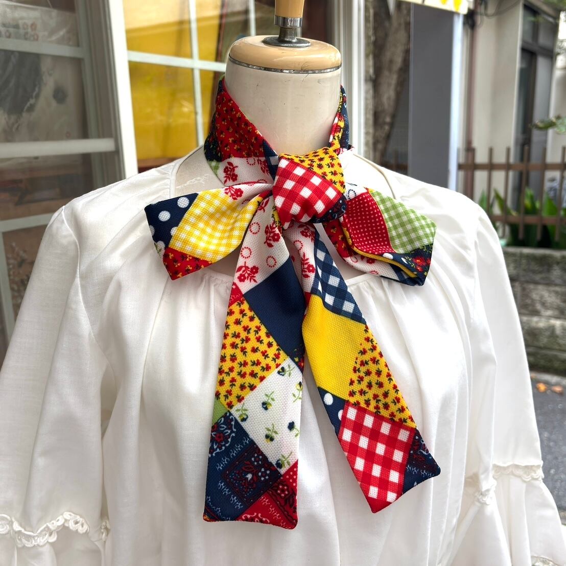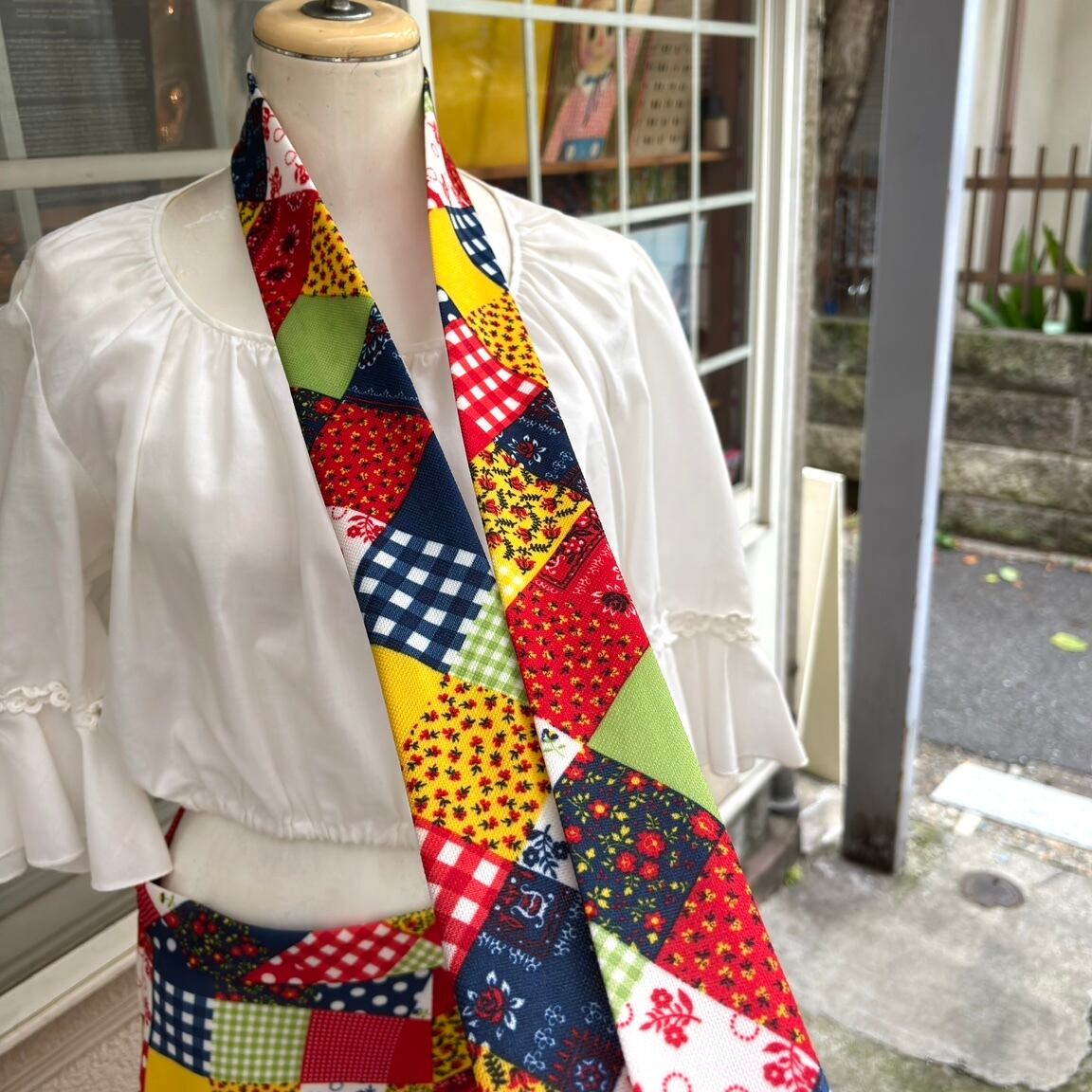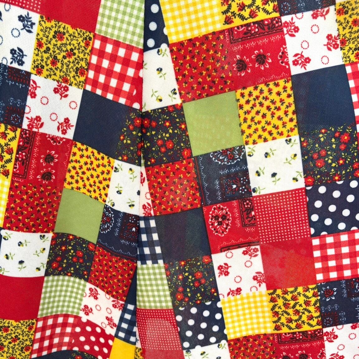 レッド、イエロー、ライトグリーン、ホワイト、ネイビーベースのカラーリングやドット、ギンガムチェック、小花柄やバンダナ柄のパッチワークプリントがとっても可愛い1着です。