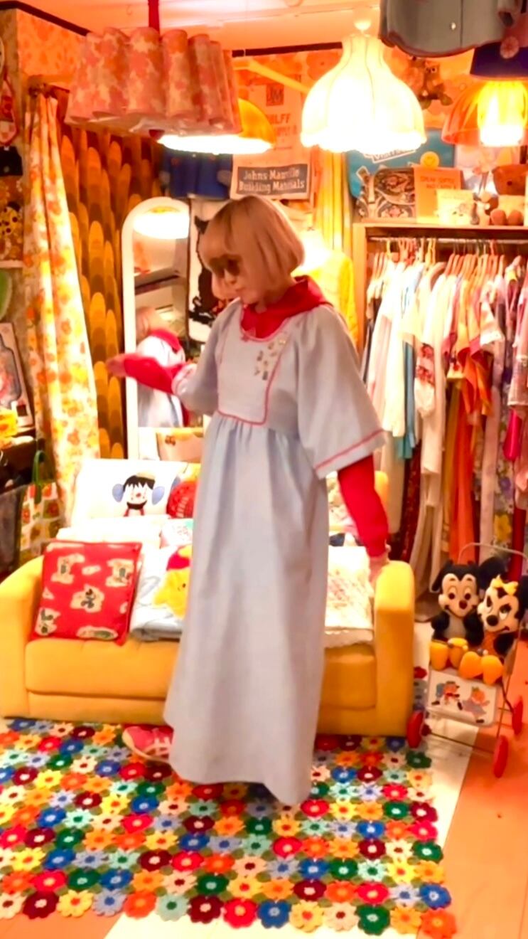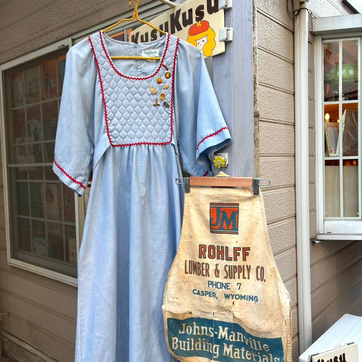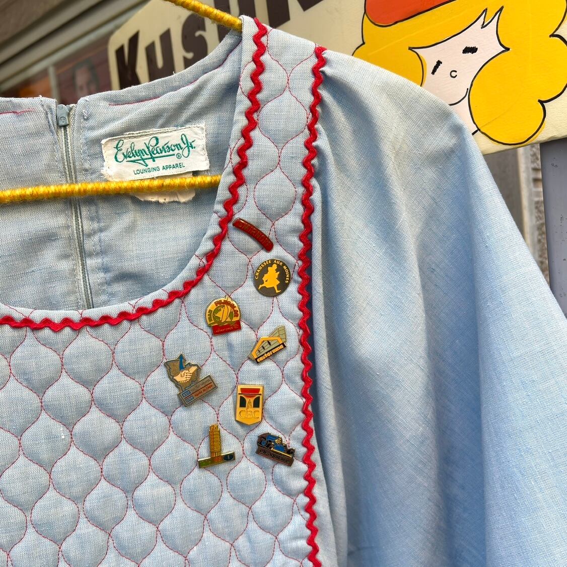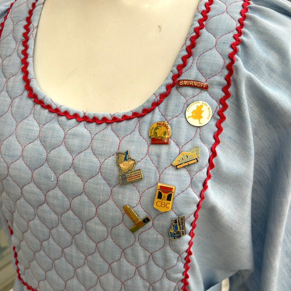 70年代 ヴィンテージ キルティング デザイン フレアスリーブ ピンバッジ付き シャンブレードレスです。