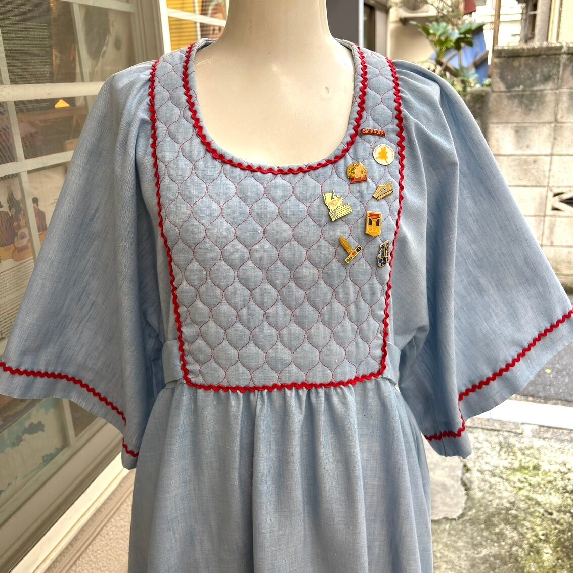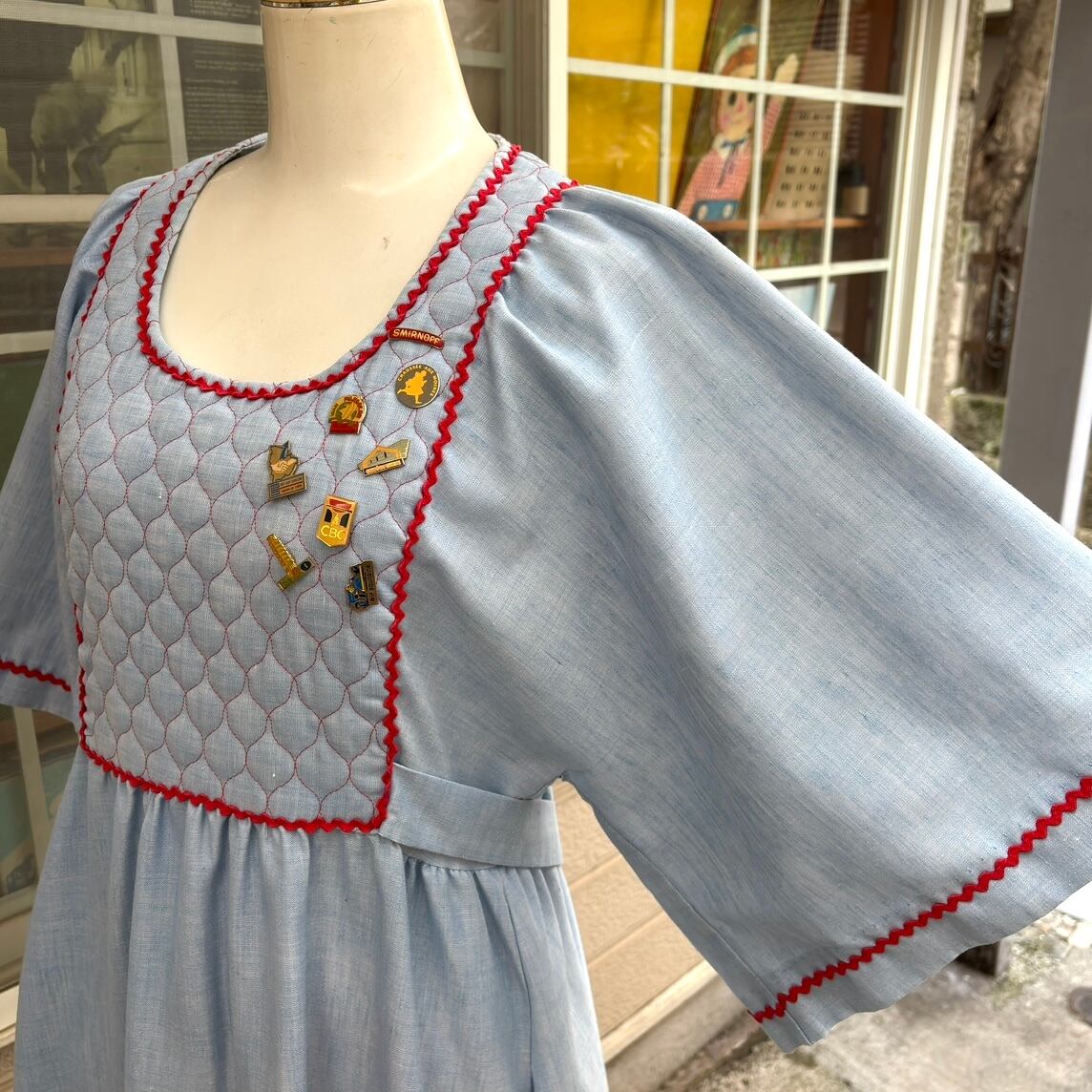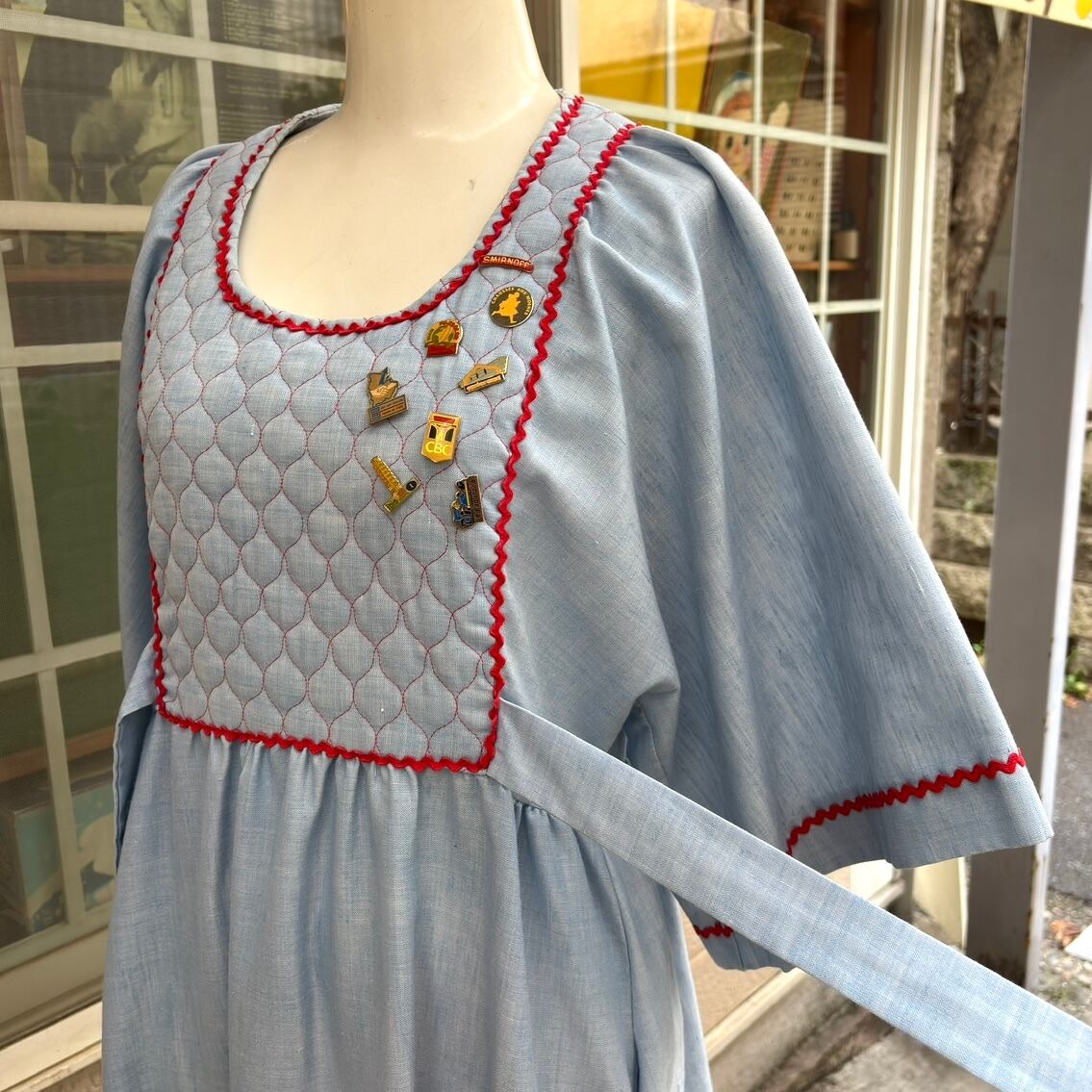70'S USA Vintage quilting design flare sleeves with pin badge chambray dress。
