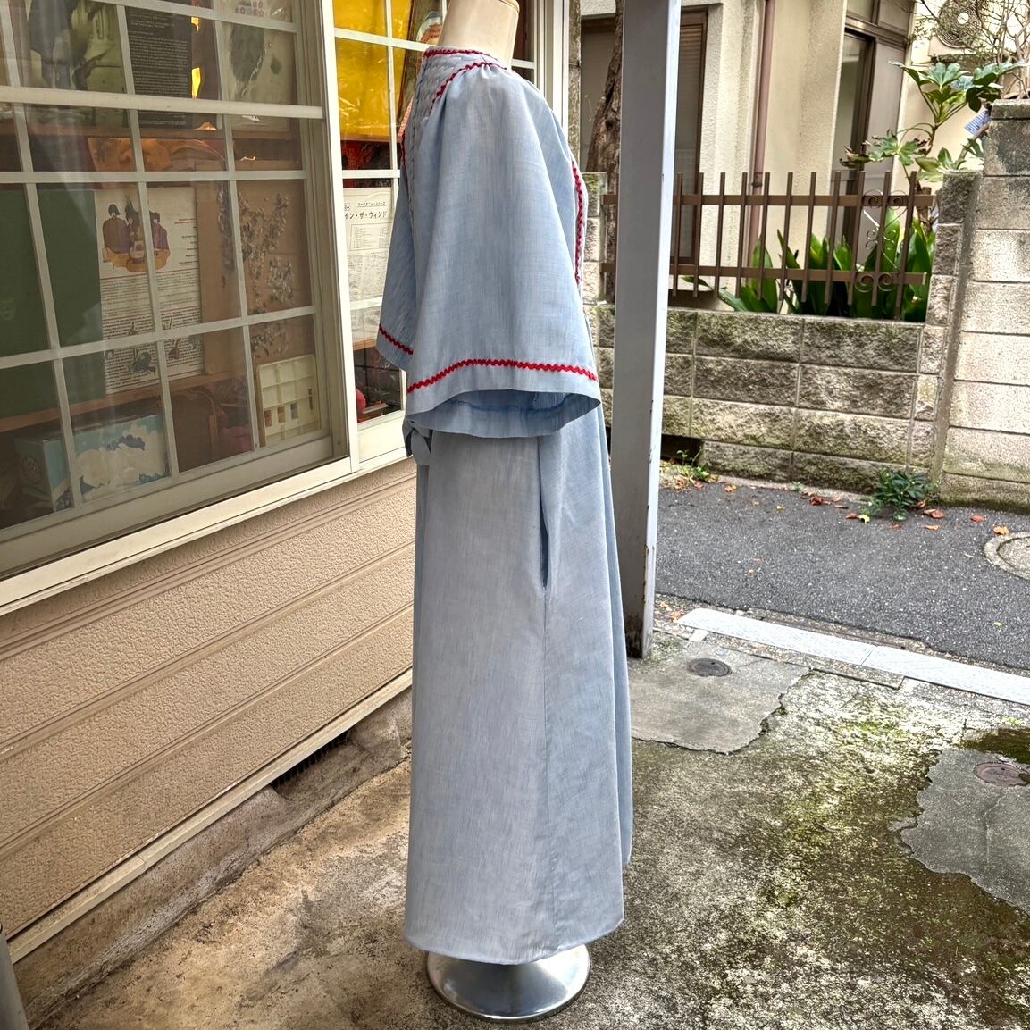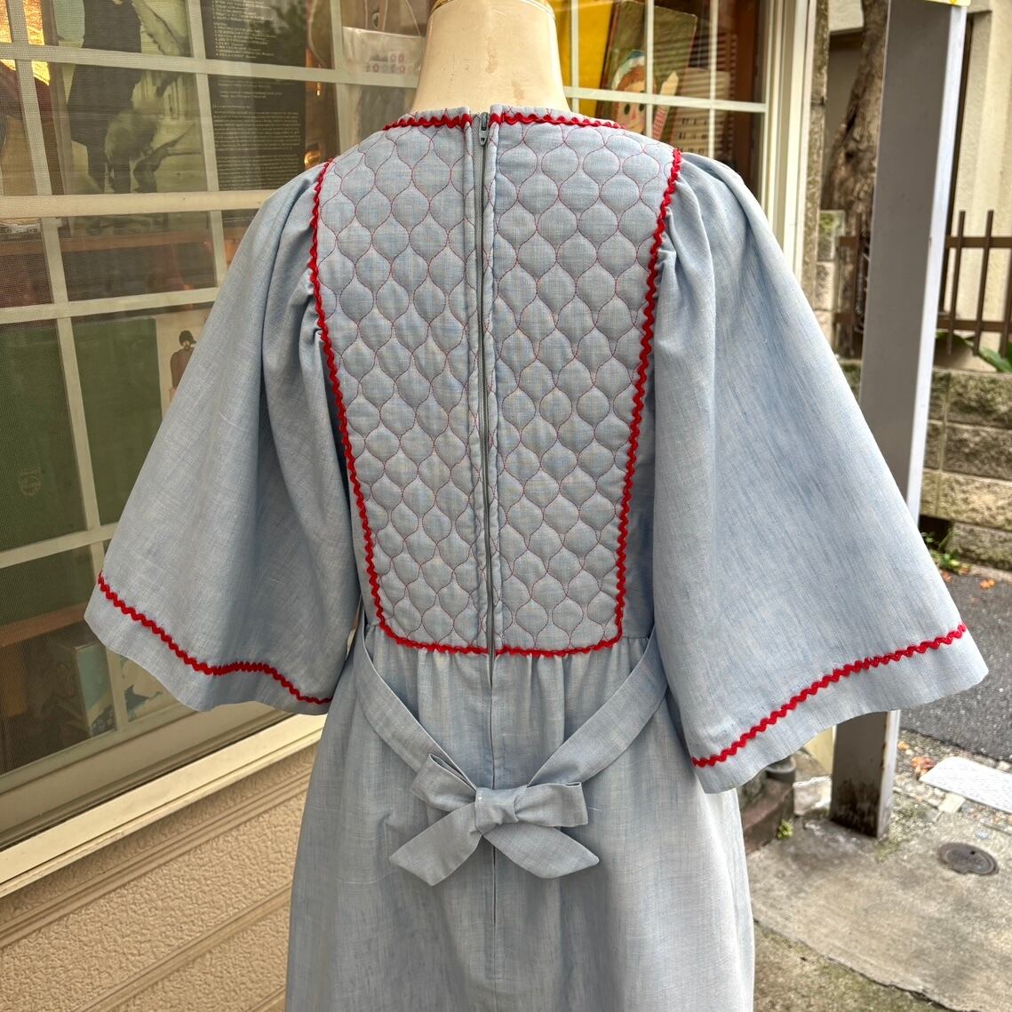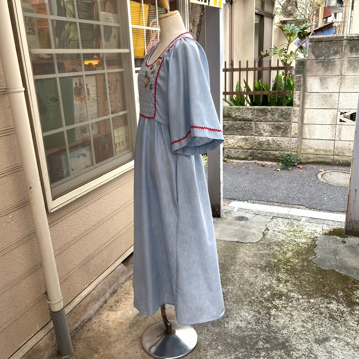 70'S USA Vintage quilting design flare sleeves with pin badge chambray dress。