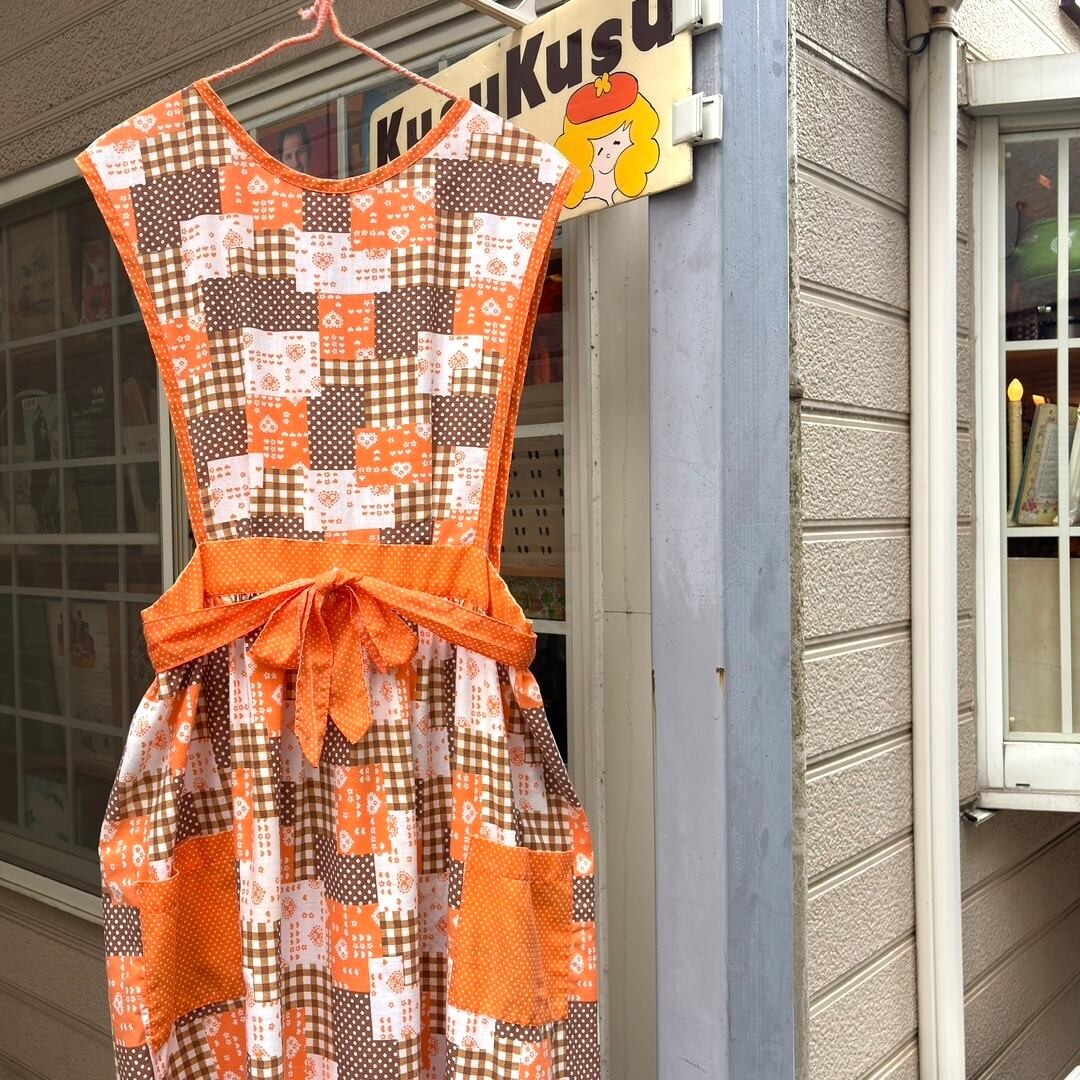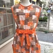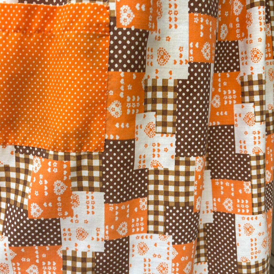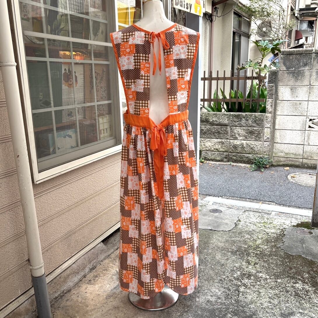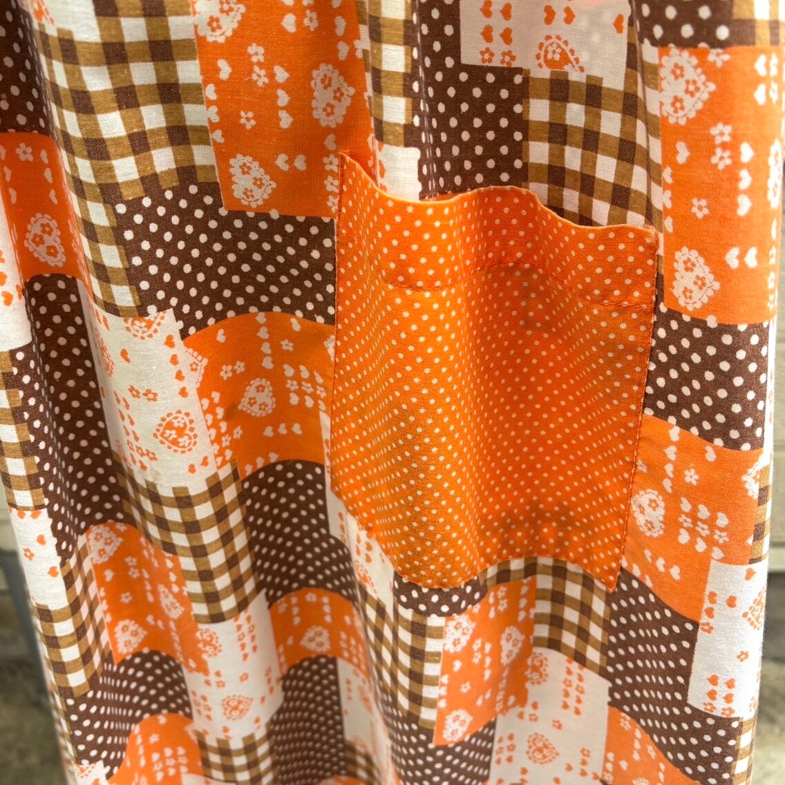 70'S USA Vintage orange brown heart&dots&plaid patchwork pattern wrap apron dress。