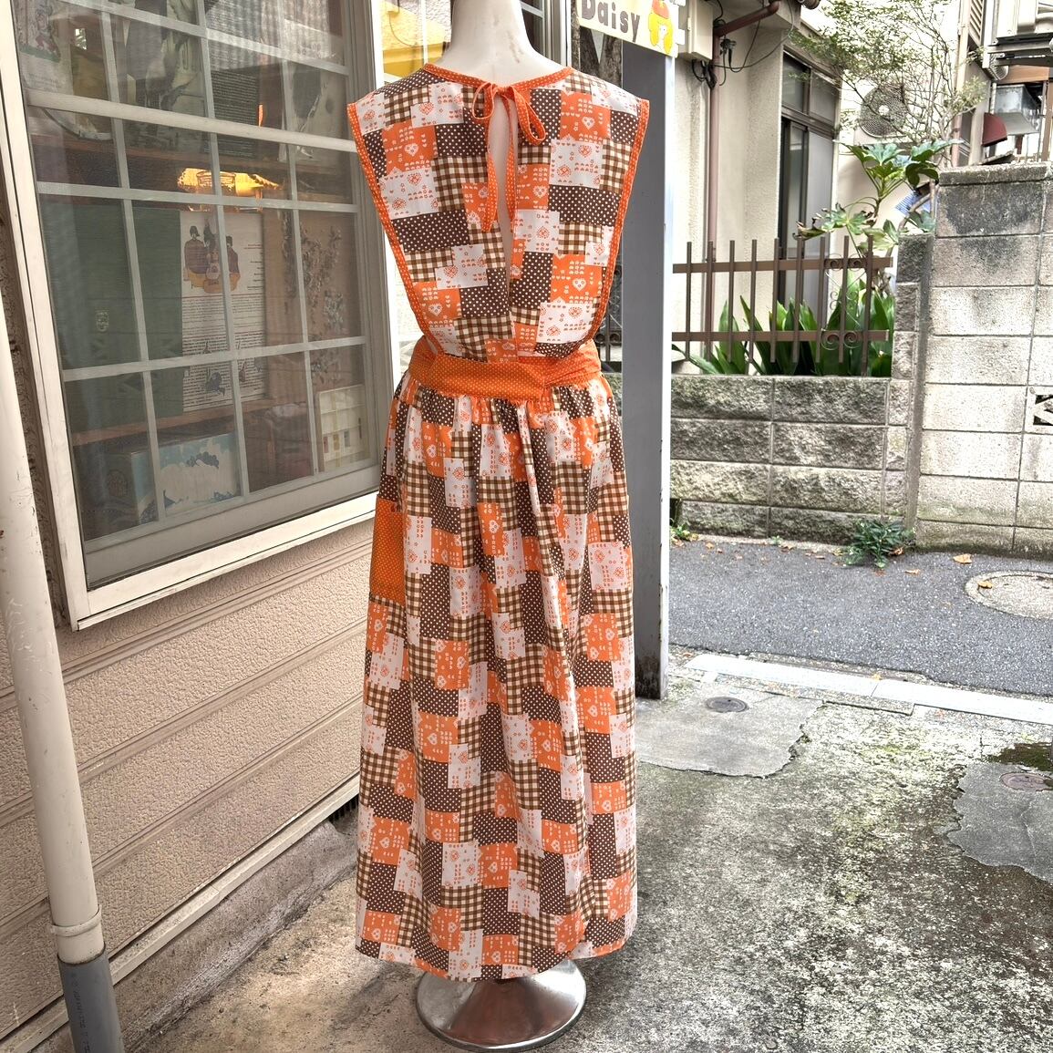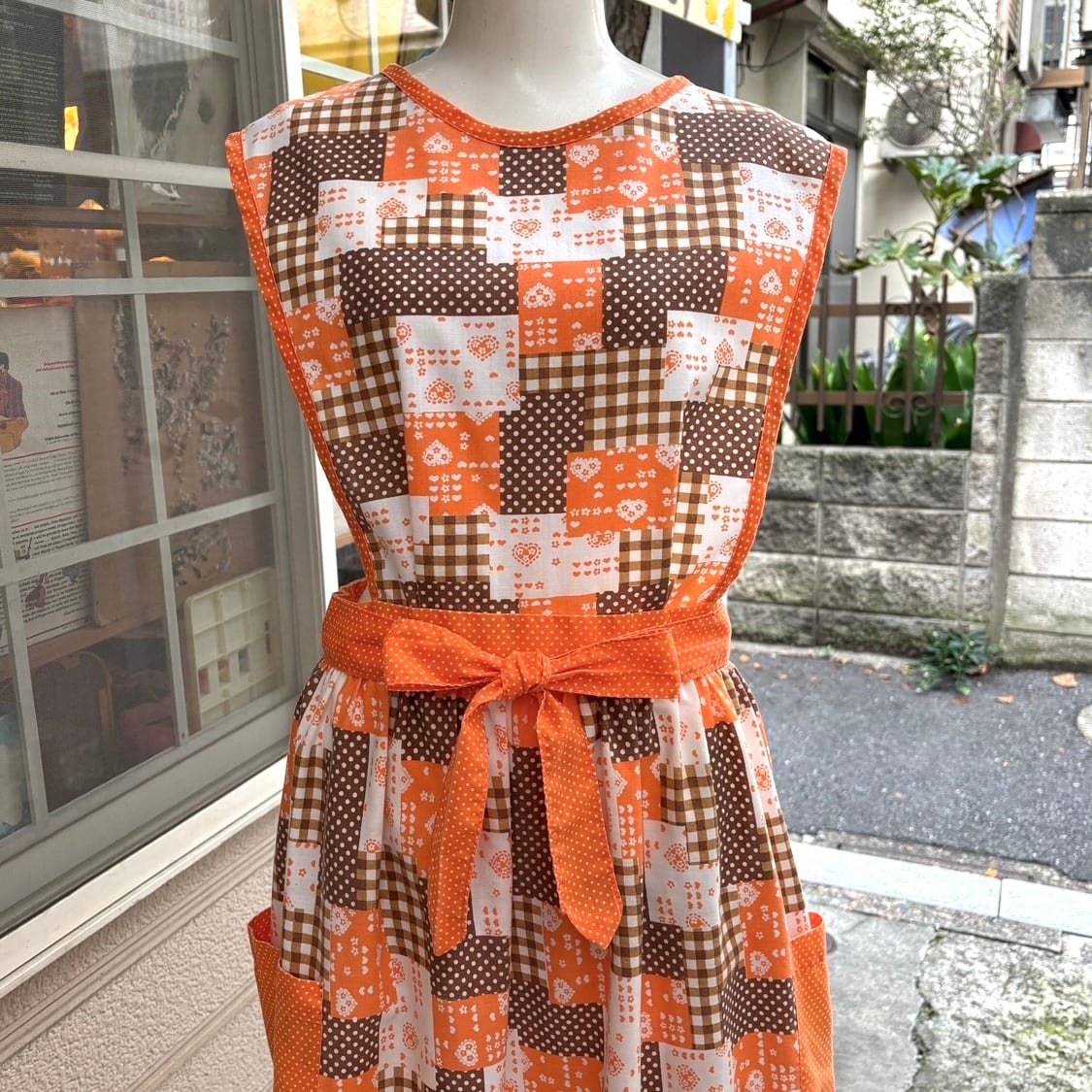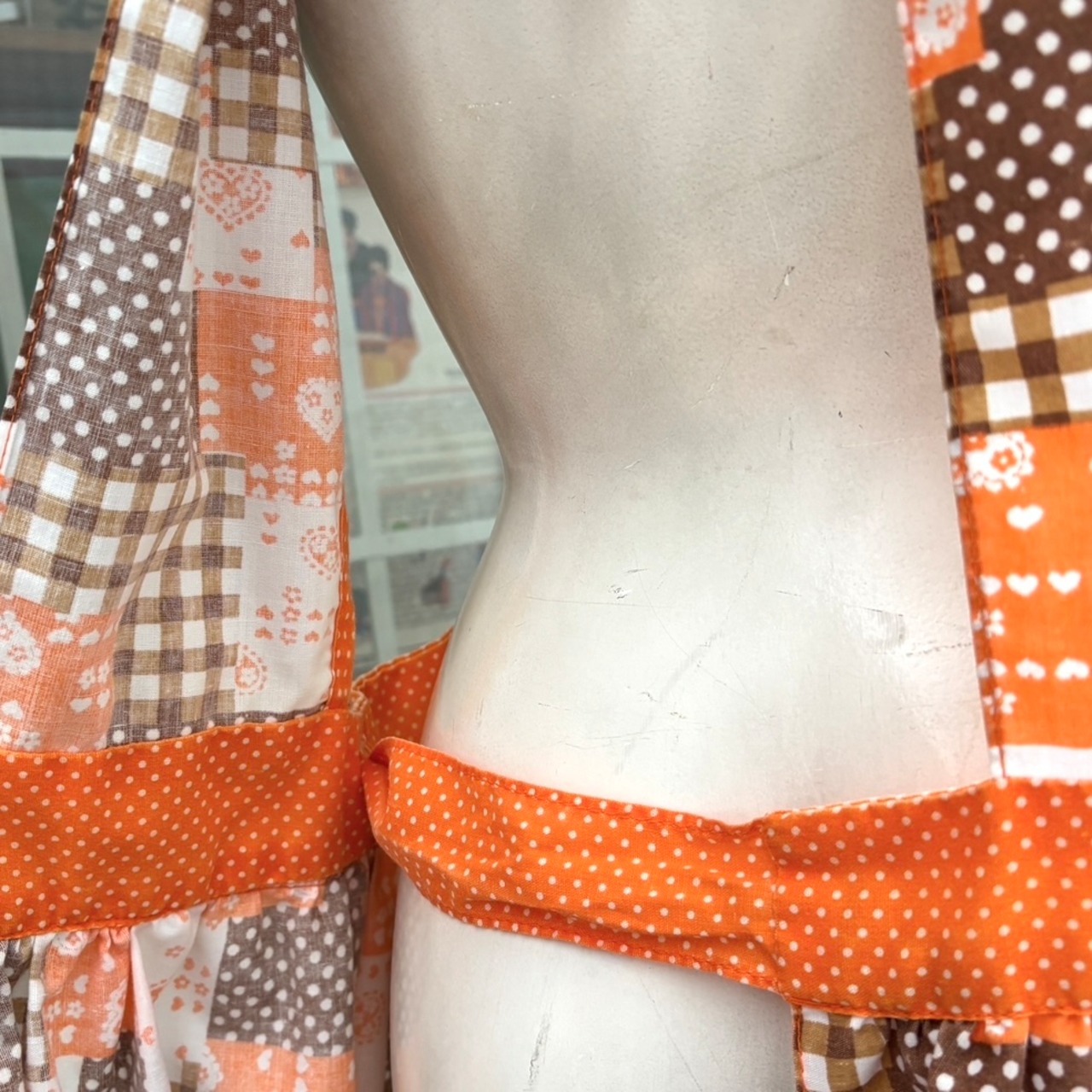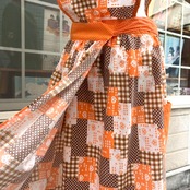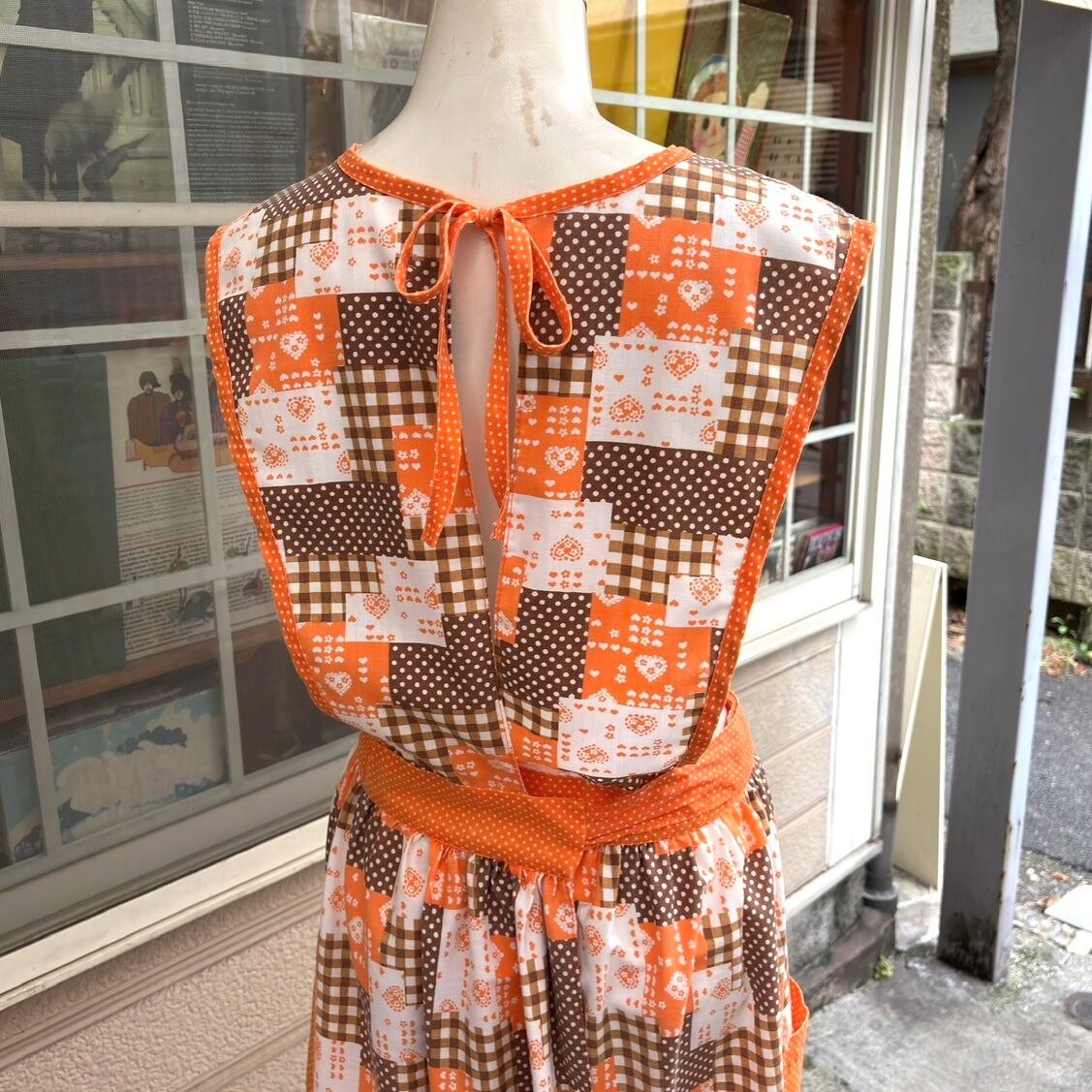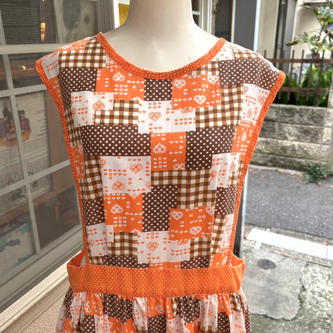 70'S USA Vintage orange brown heart&dots&plaid patchwork pattern wrap apron dress。