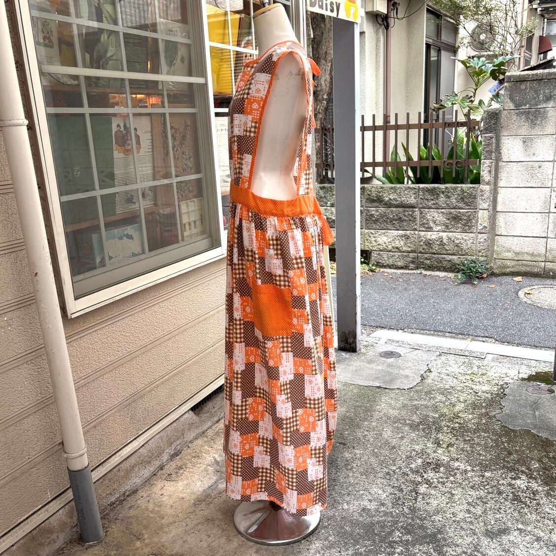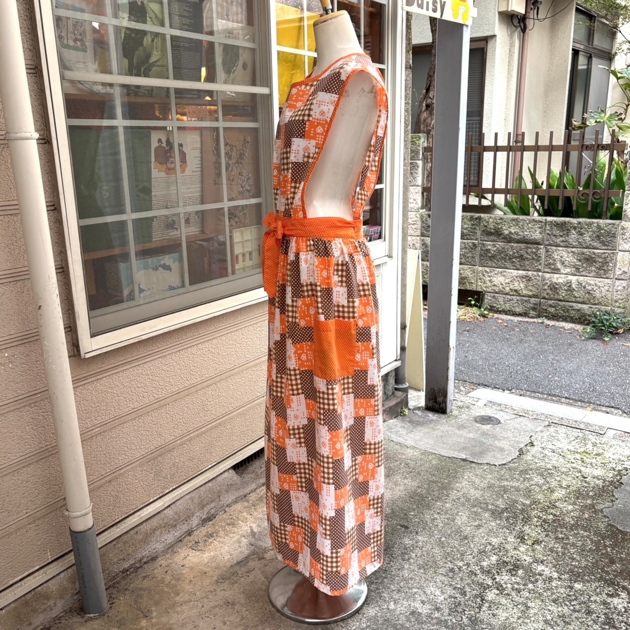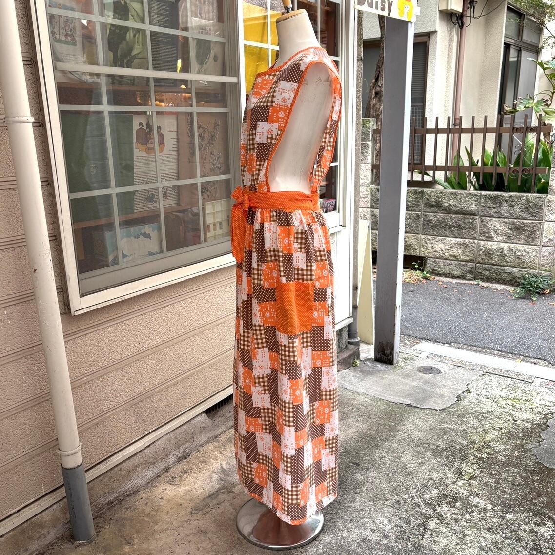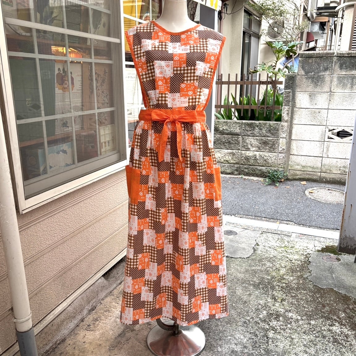 70'S USA Vintage orange brown heart&dots&plaid patchwork pattern wrap apron dress。