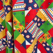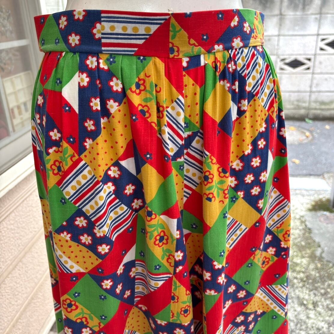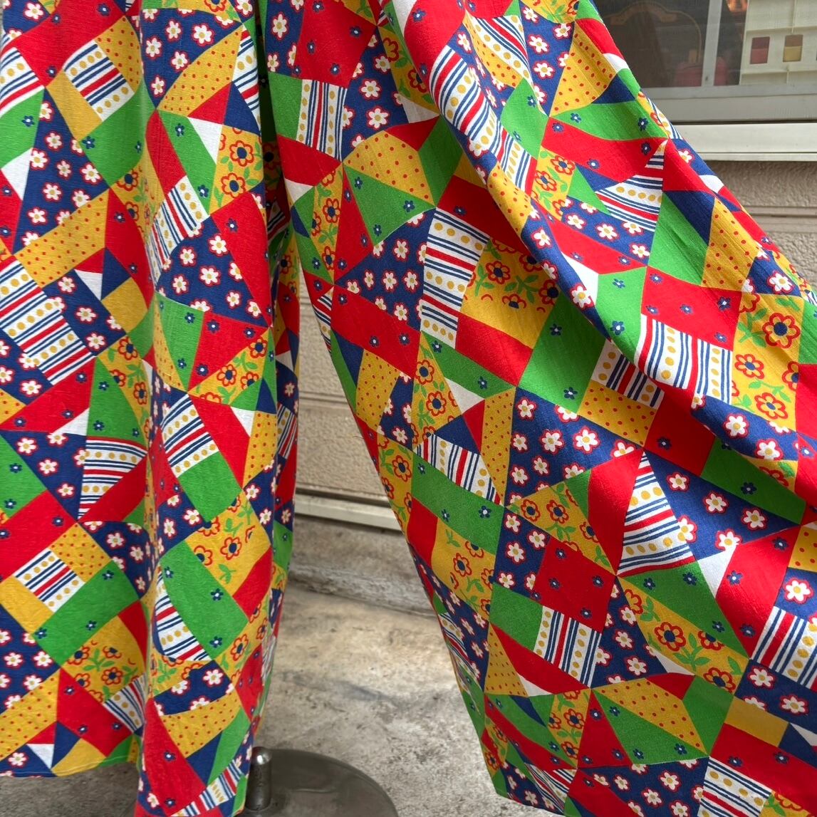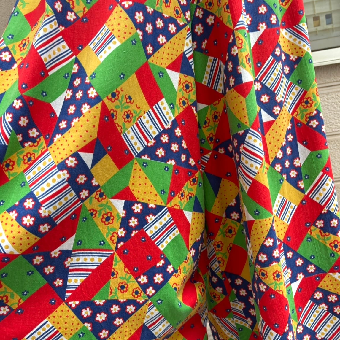 レッド、ライトグリーン、ネイビー、ホワイト、マスタードイエローのカラーリングやピンドット、マルチストライプ、フラワー模様のパッチワーク柄がとっても可愛い1着です。