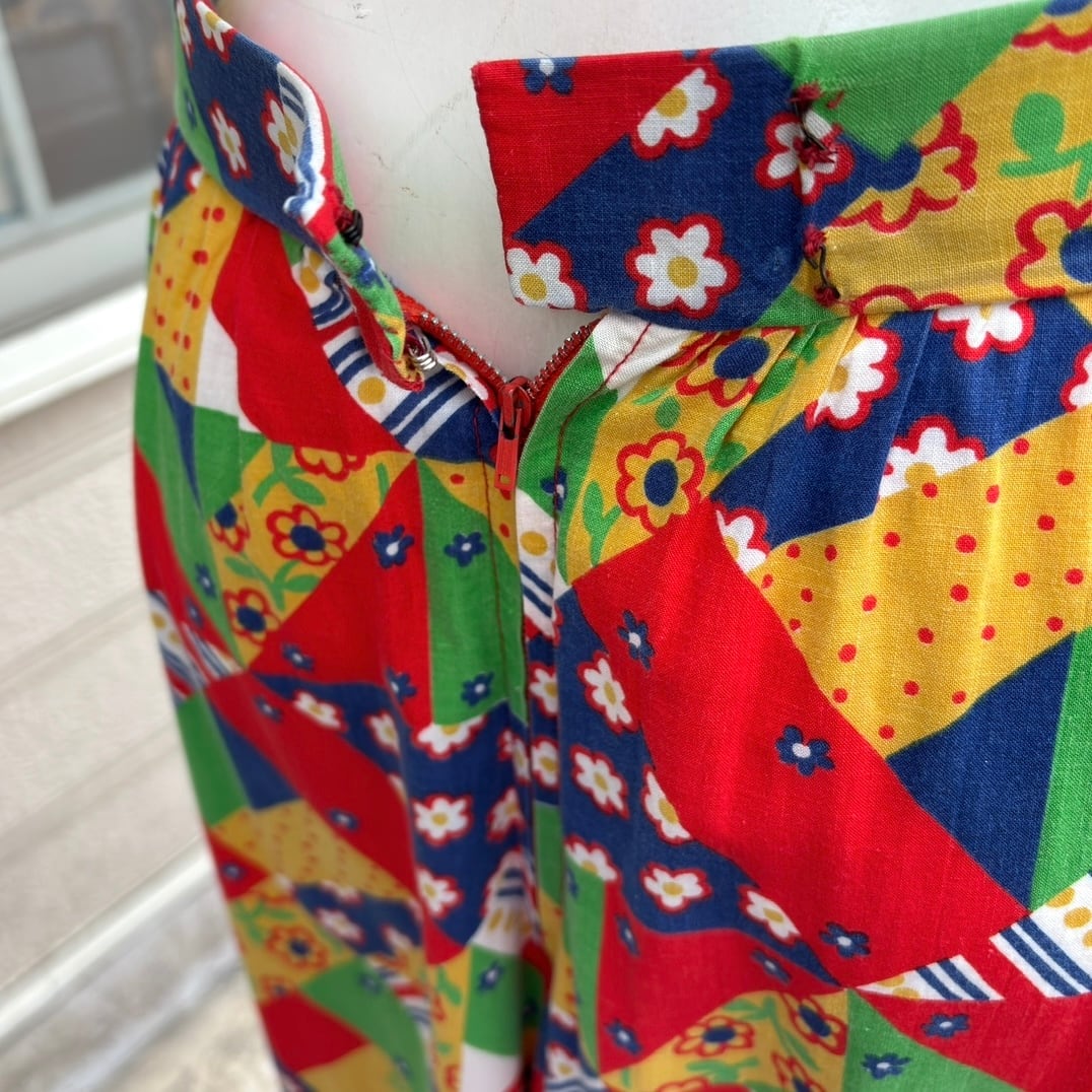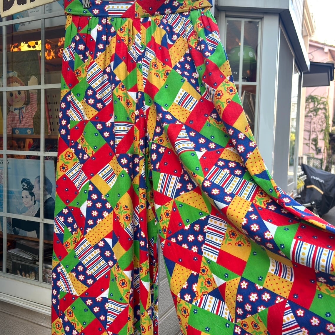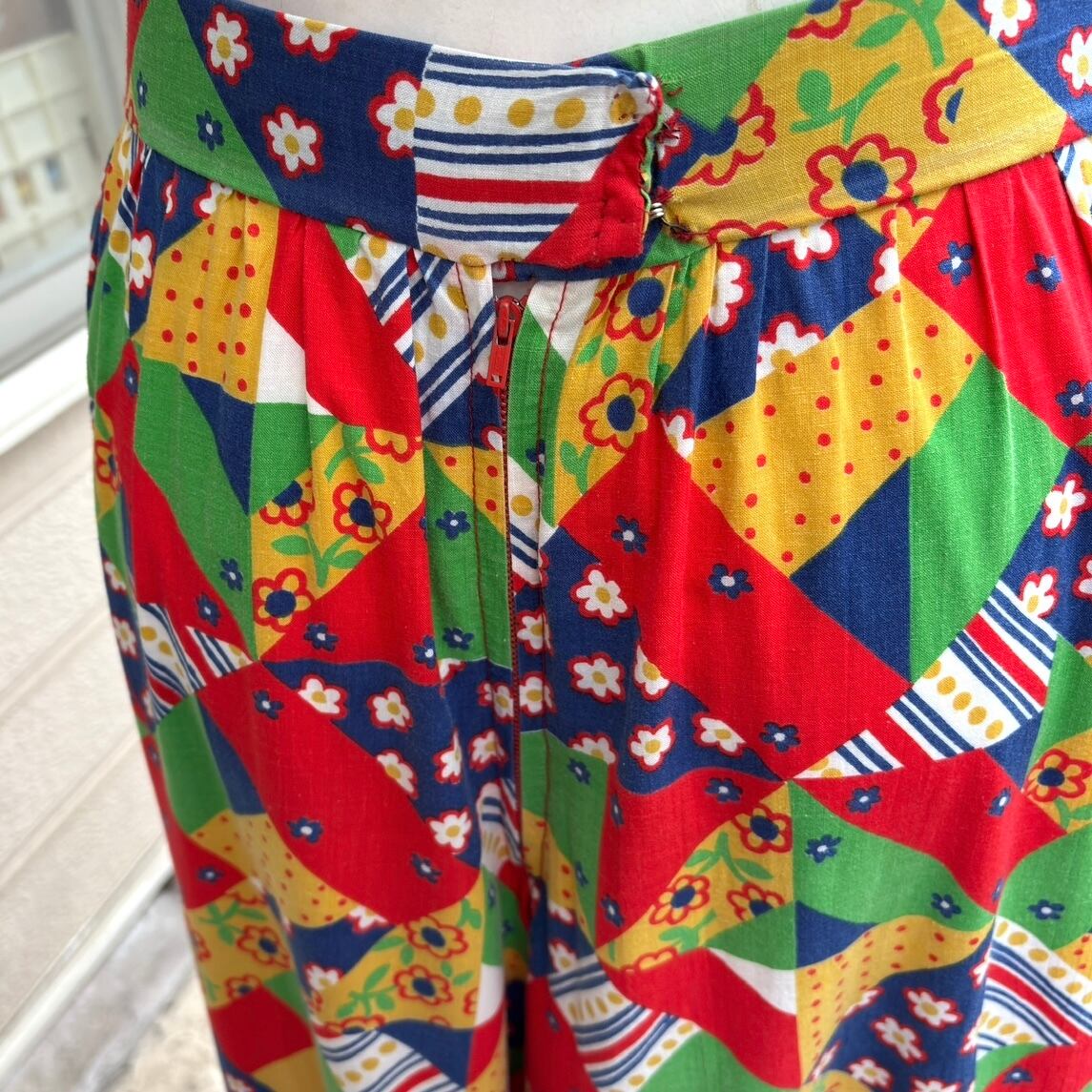 70年代 ヴィンテージ 当時のハンドメイド1点もの フラワー デザイン パッチワーク柄 ワイドフレアパンツです。
