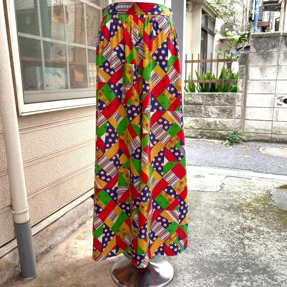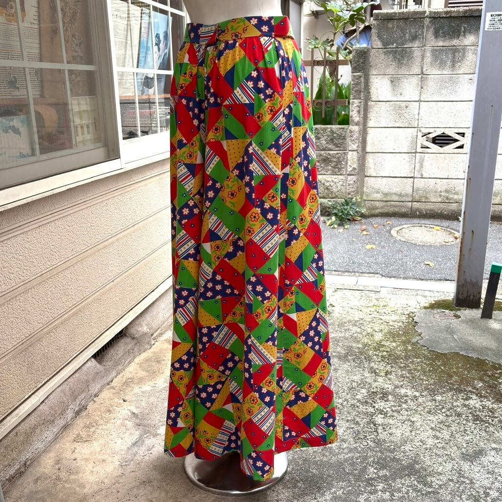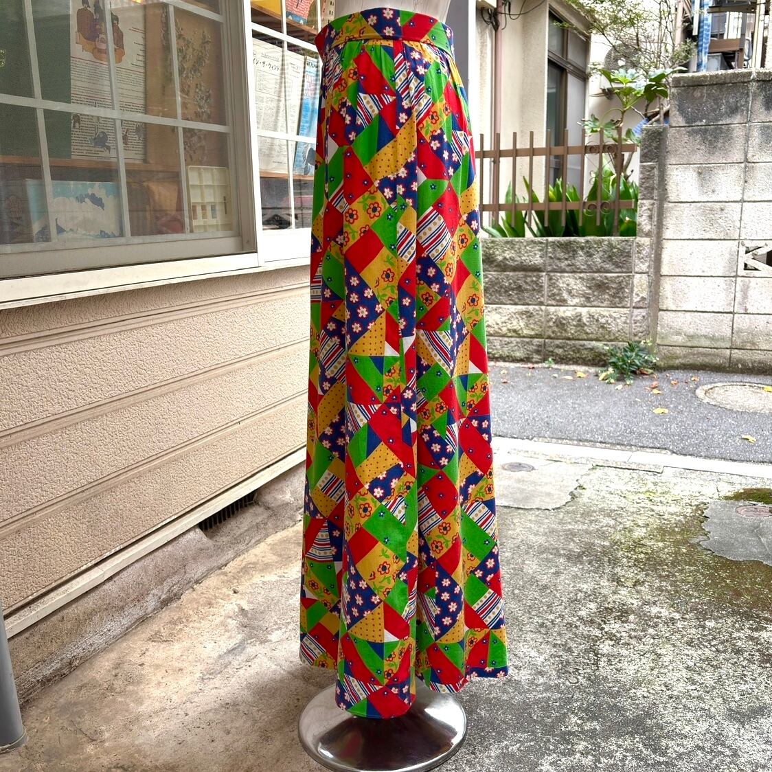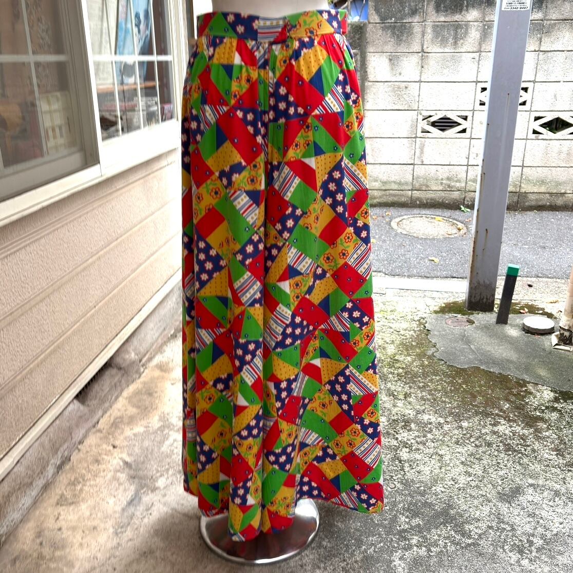 70'S USA Vintage flower design patchwork print wide flare pants。