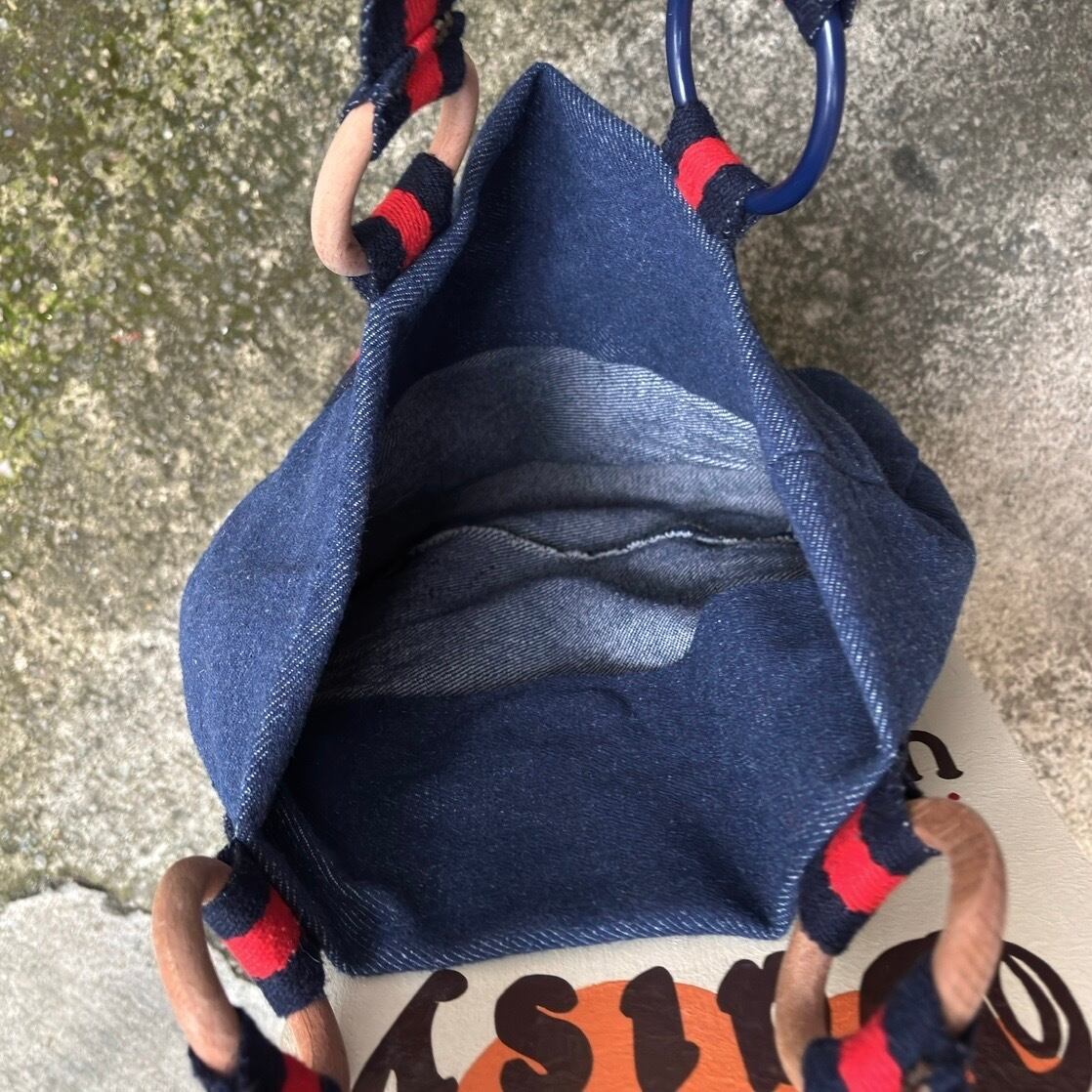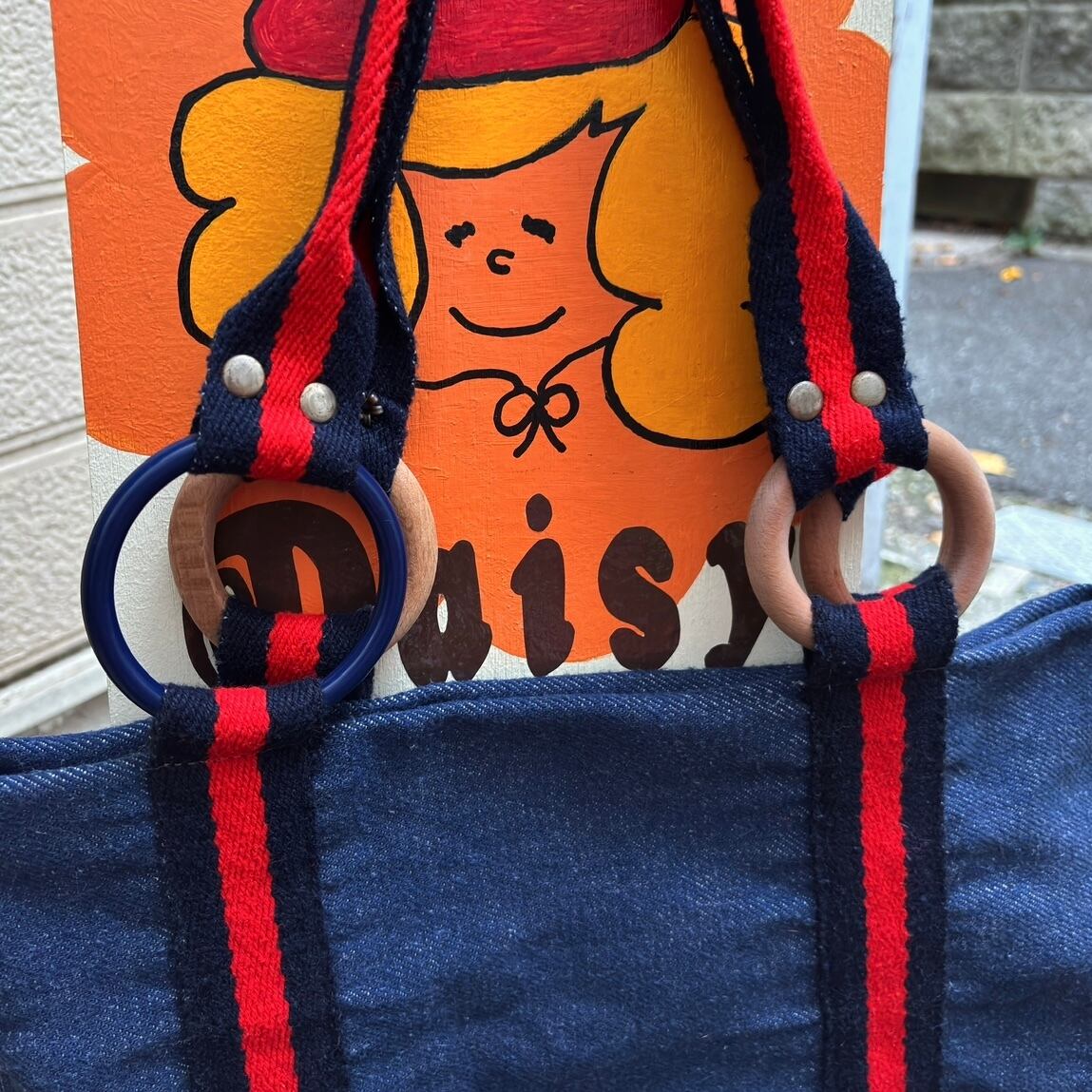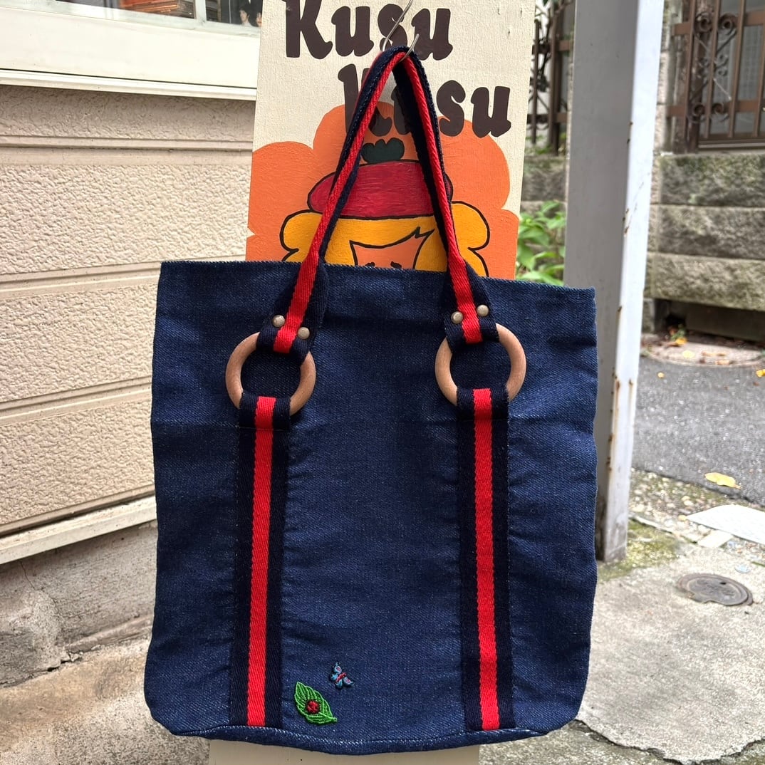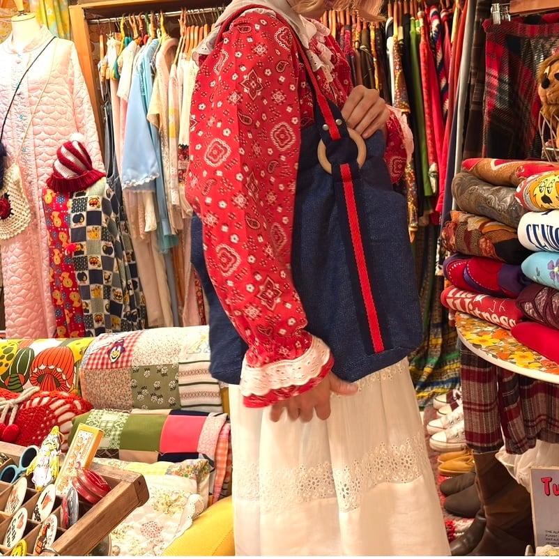 やや厚みのある柔らかなデニム地にブラックよりのネイビーとレッドのハンドルやボディーのライン、ウッドリングやオールドプラスチックリングのデザインがとっても可愛いアイテムです。