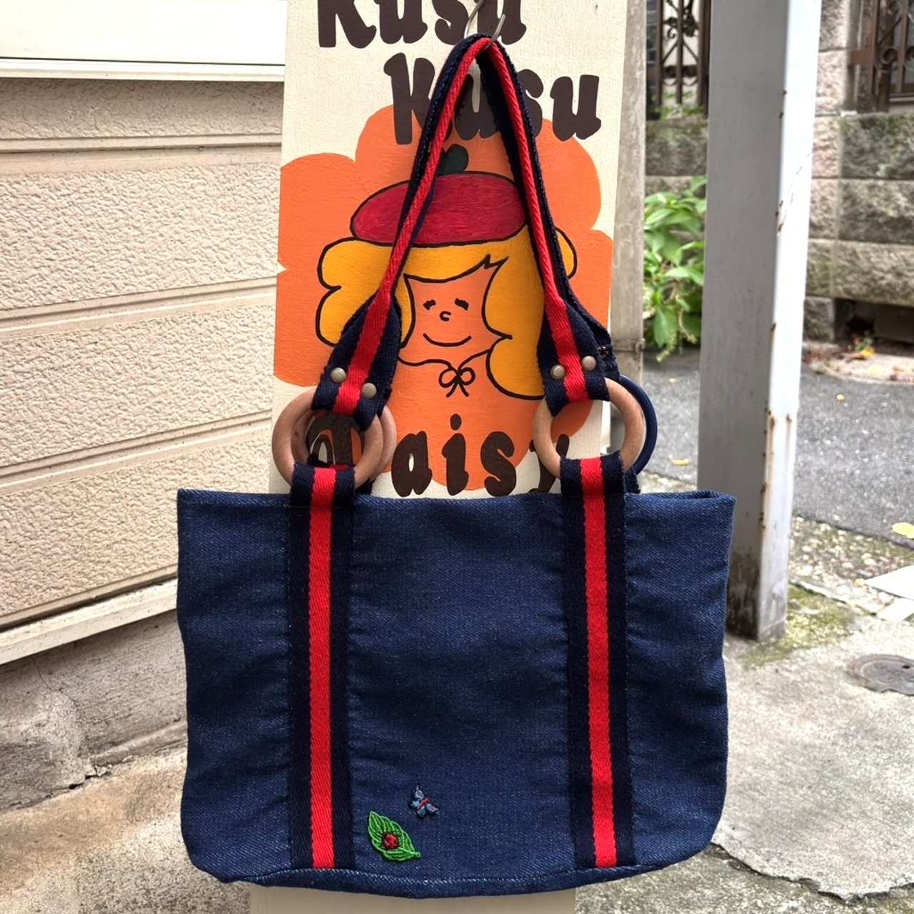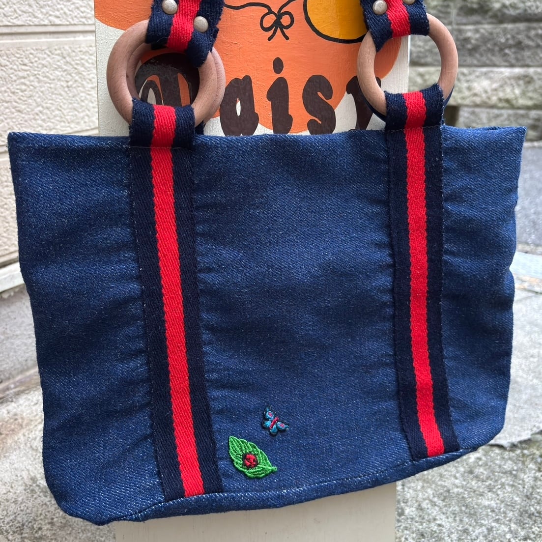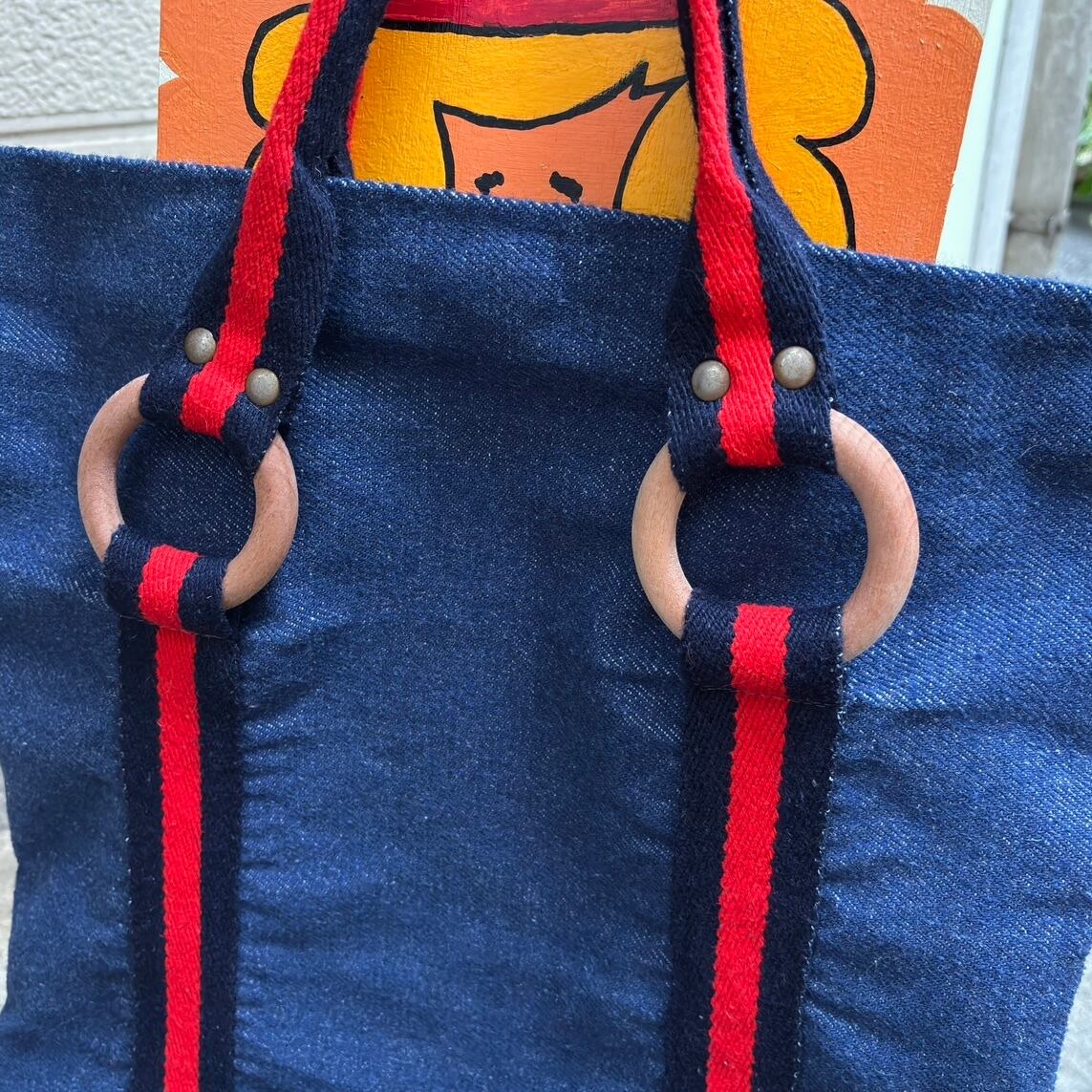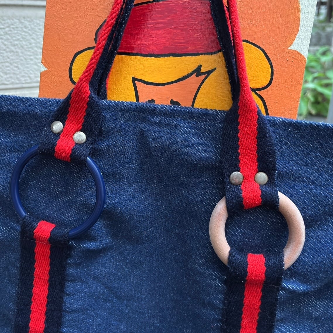 やや厚みのある柔らかなデニム地にブラックよりのネイビーとレッドのハンドルやボディーのライン、ウッドリングやオールドプラスチックリングのデザインがとっても可愛いアイテムです。