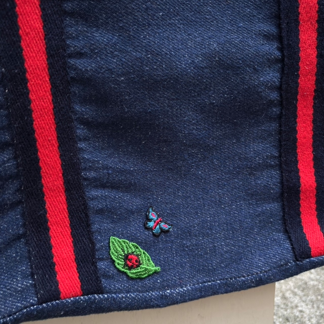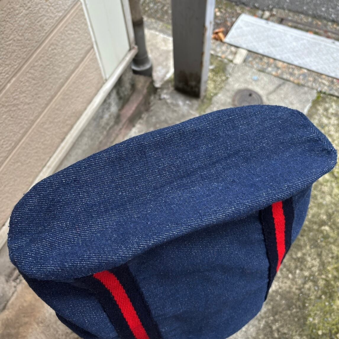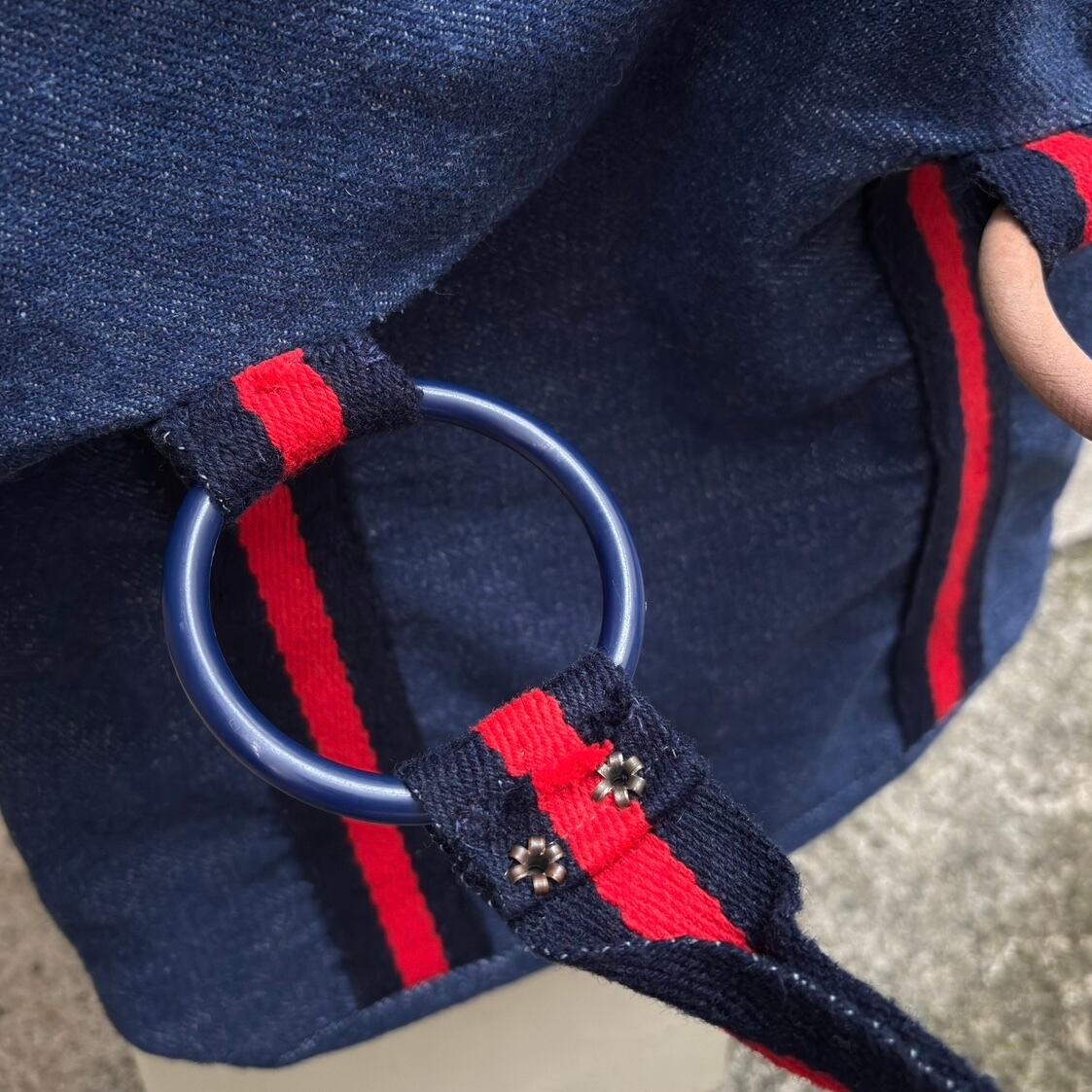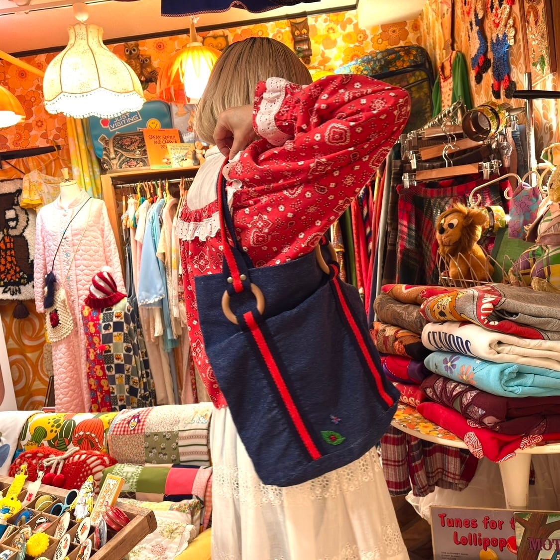 やや厚みのある柔らかなデニム地にブラックよりのネイビーとレッドのハンドルやボディーのライン、ウッドリングやオールドプラスチックリングのデザインがとっても可愛いアイテムです。