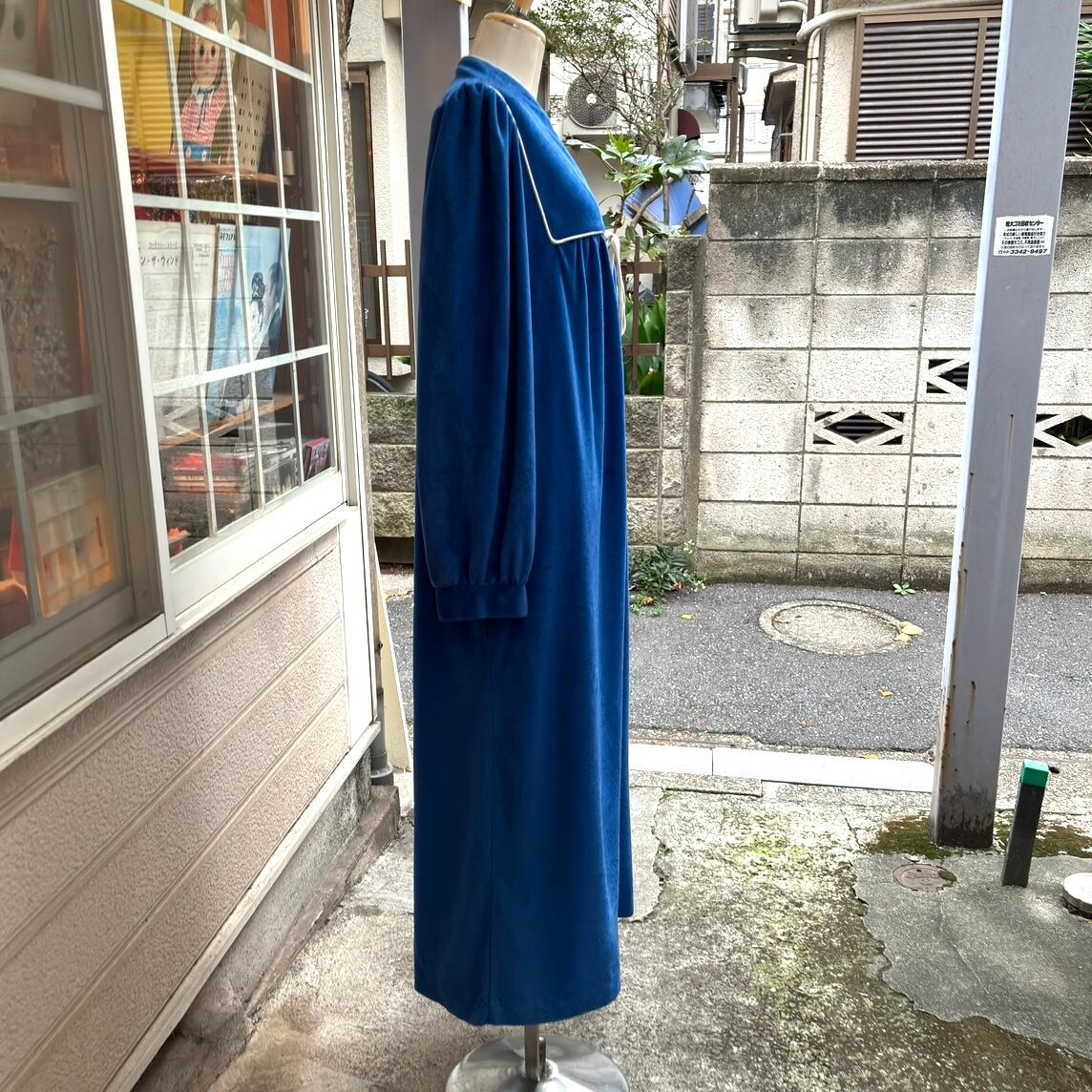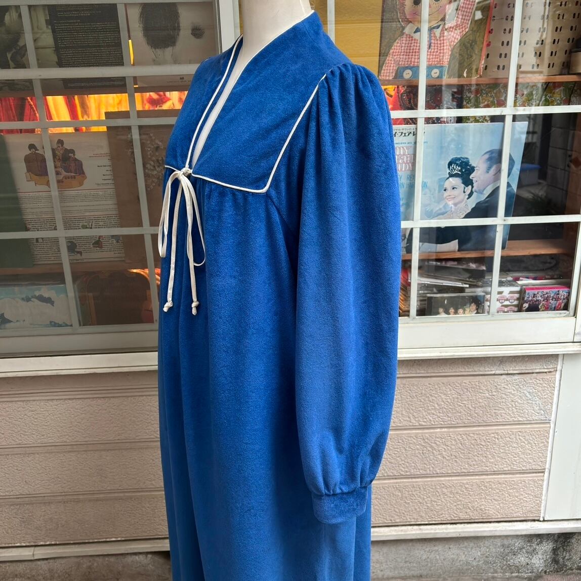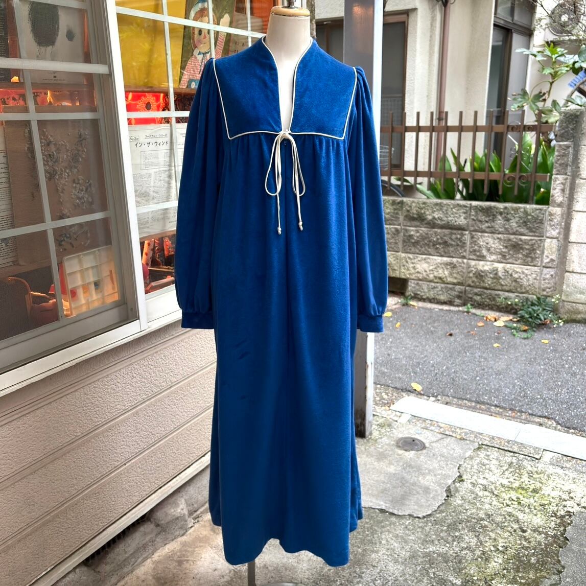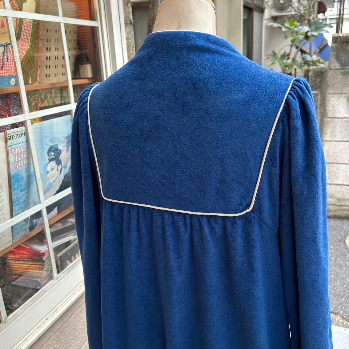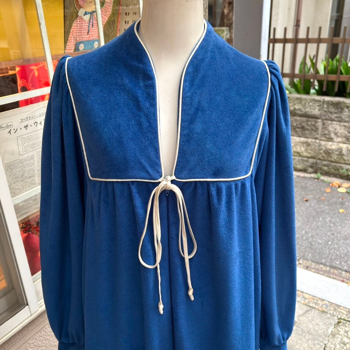70年代 ヴィンテージ ホワイト パイピング&リボン ブルー ベロアドレスです。