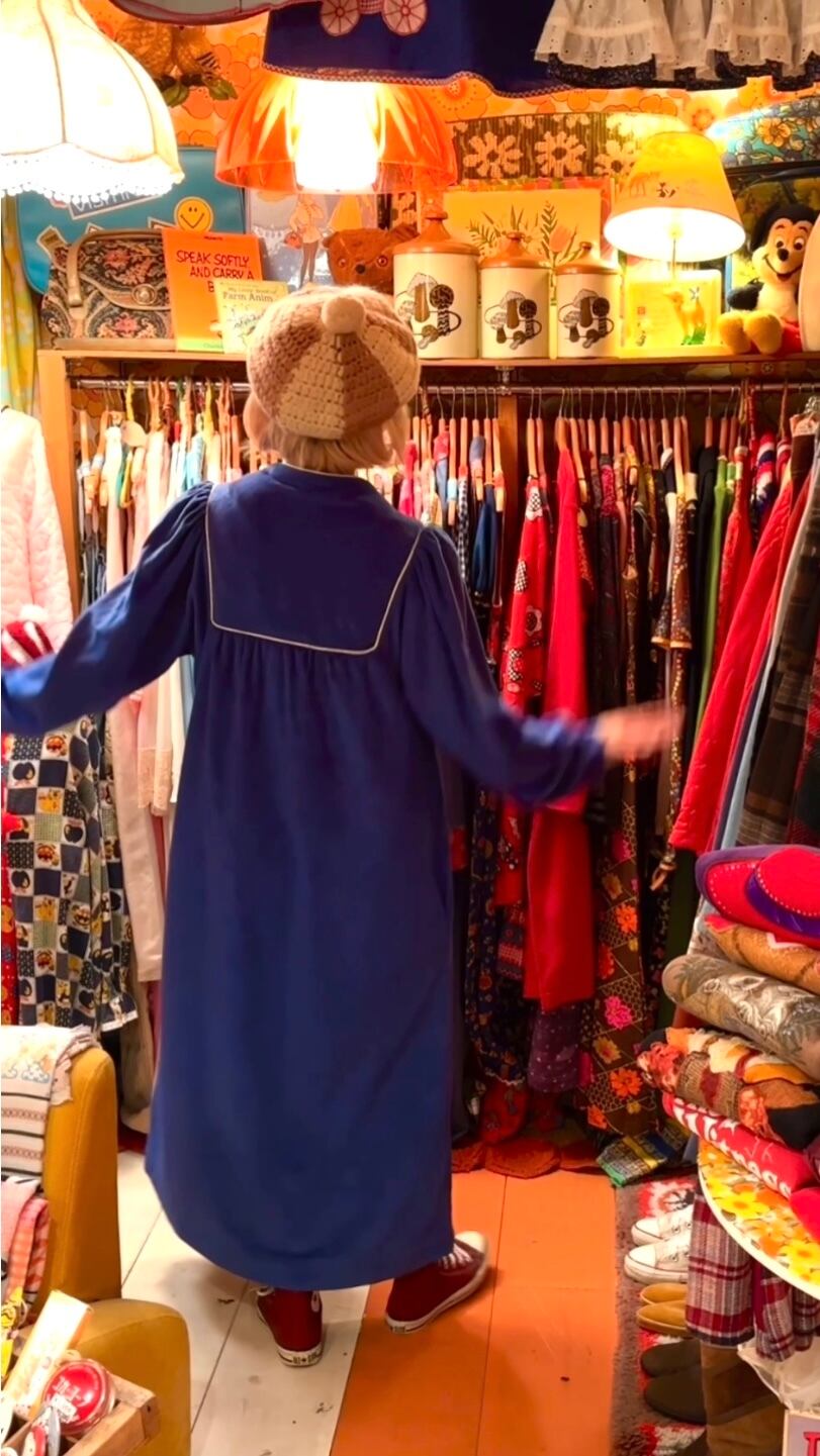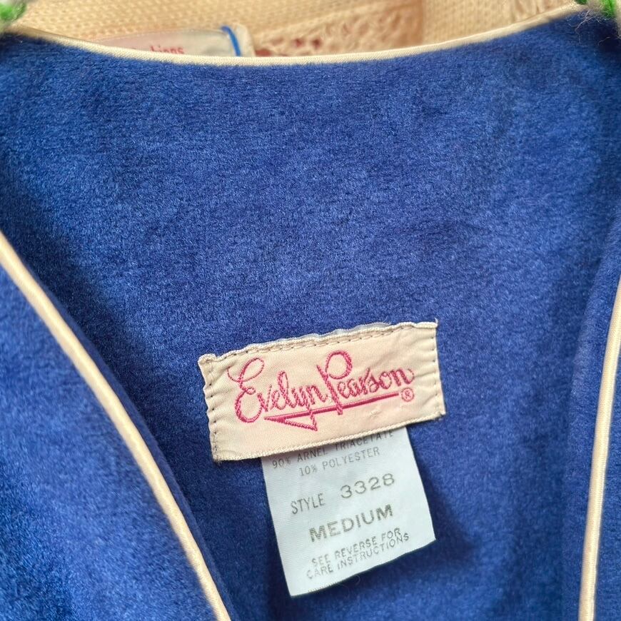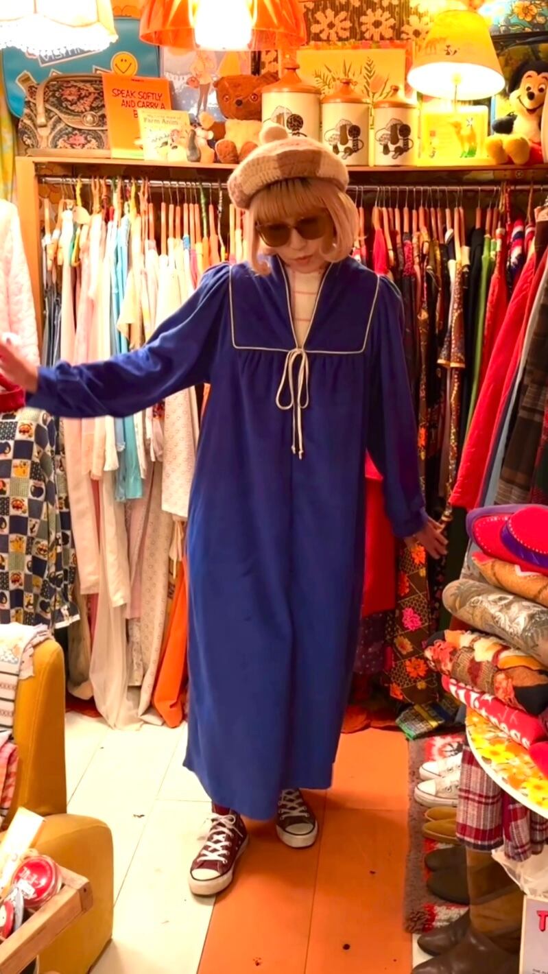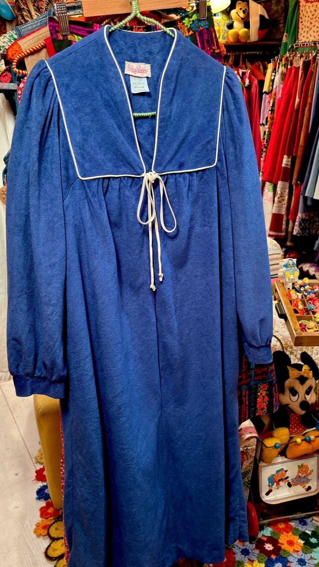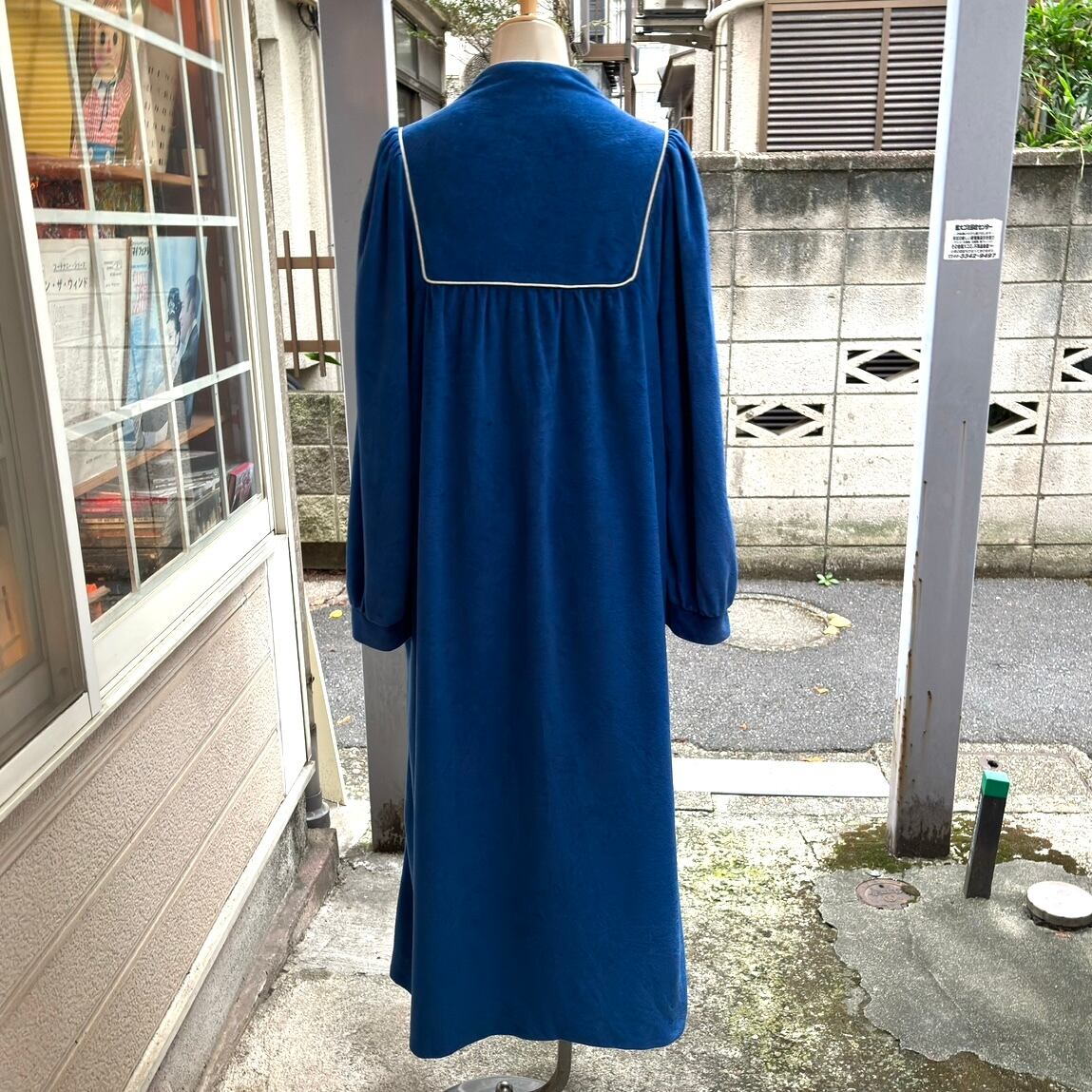 70年代 ヴィンテージ ホワイト パイピング&リボン ブルー ベロアドレスです。