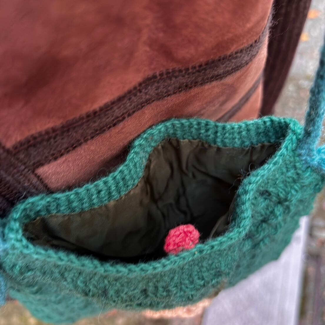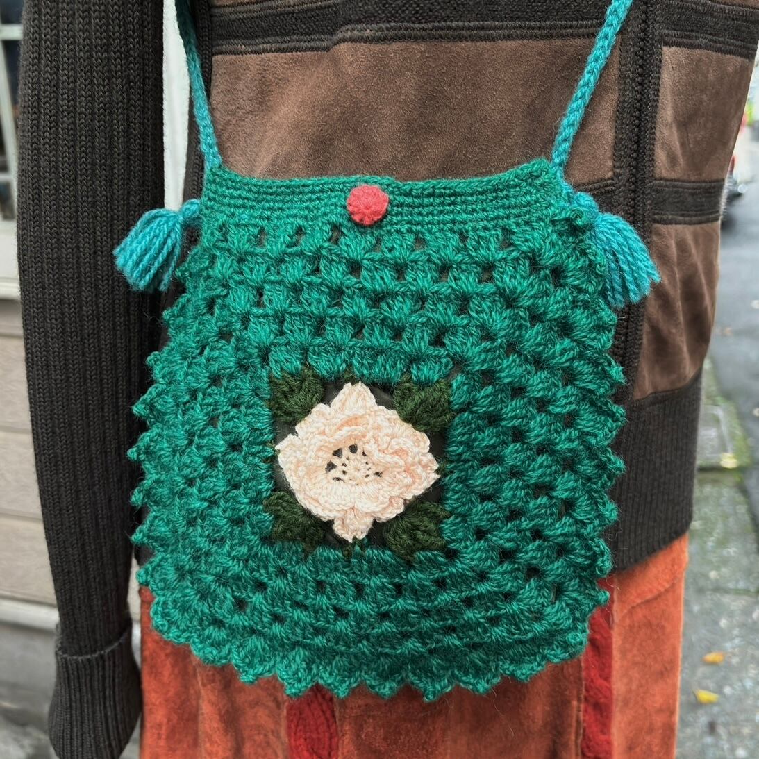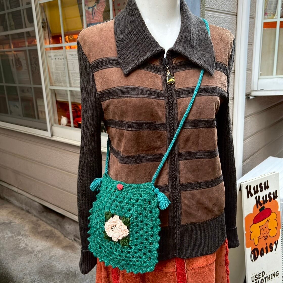 落ち着いたお色味のグリーンのボディーにボディーより僅かに明るみのあるグリーンのフリンジ付きのショルダー、ライトなベビーピンクの立体感のあるフラワーモチーフがとっても可愛いアイテムです。